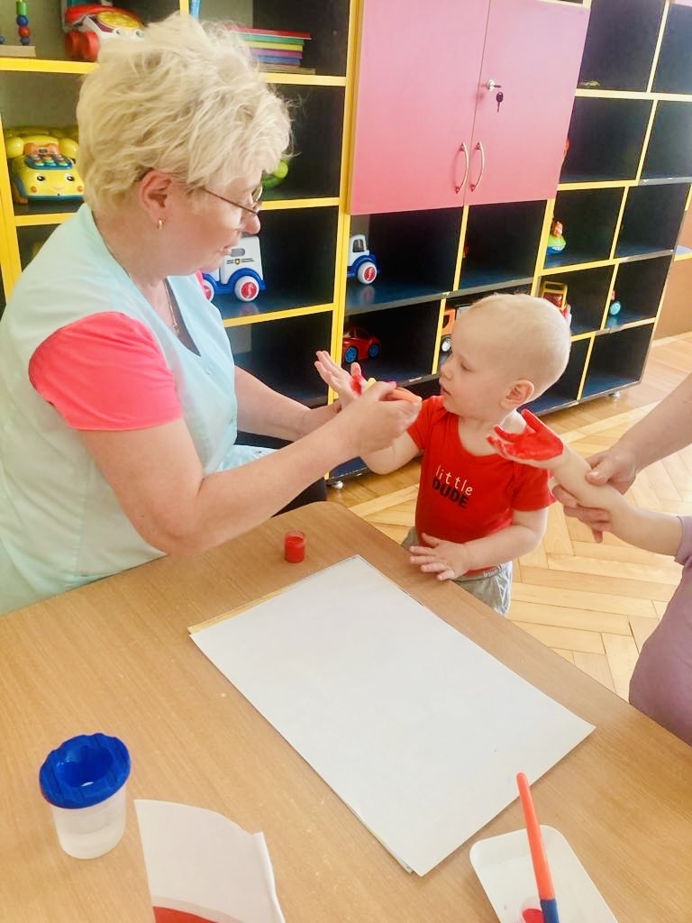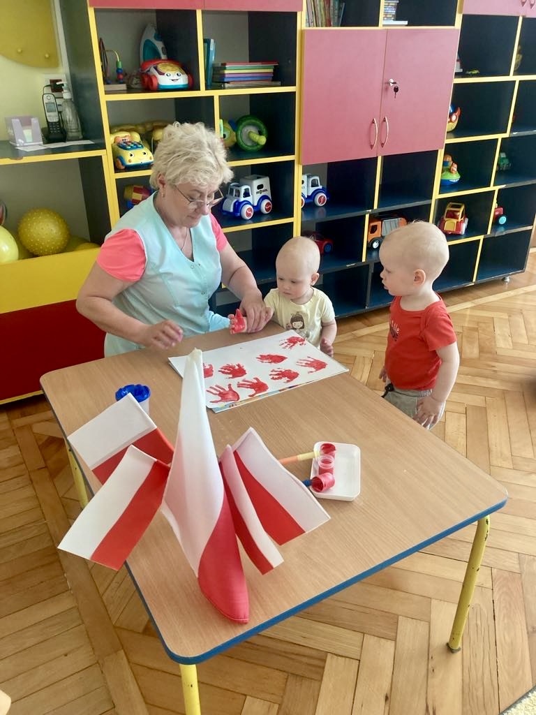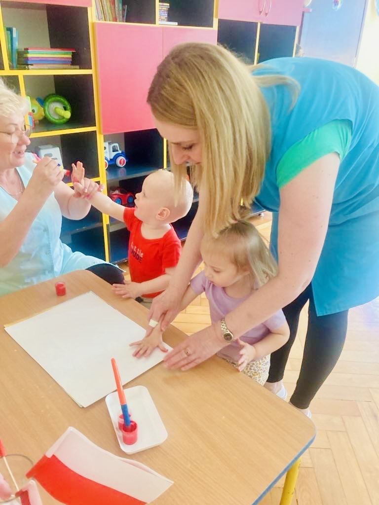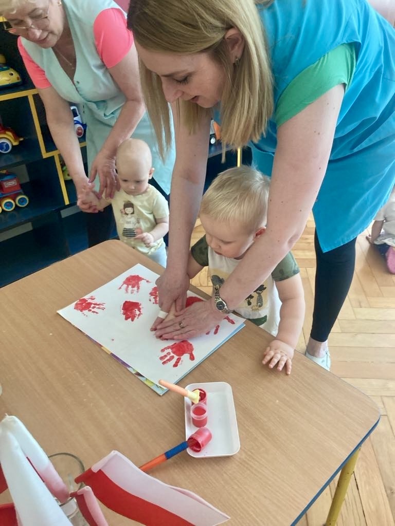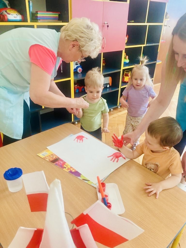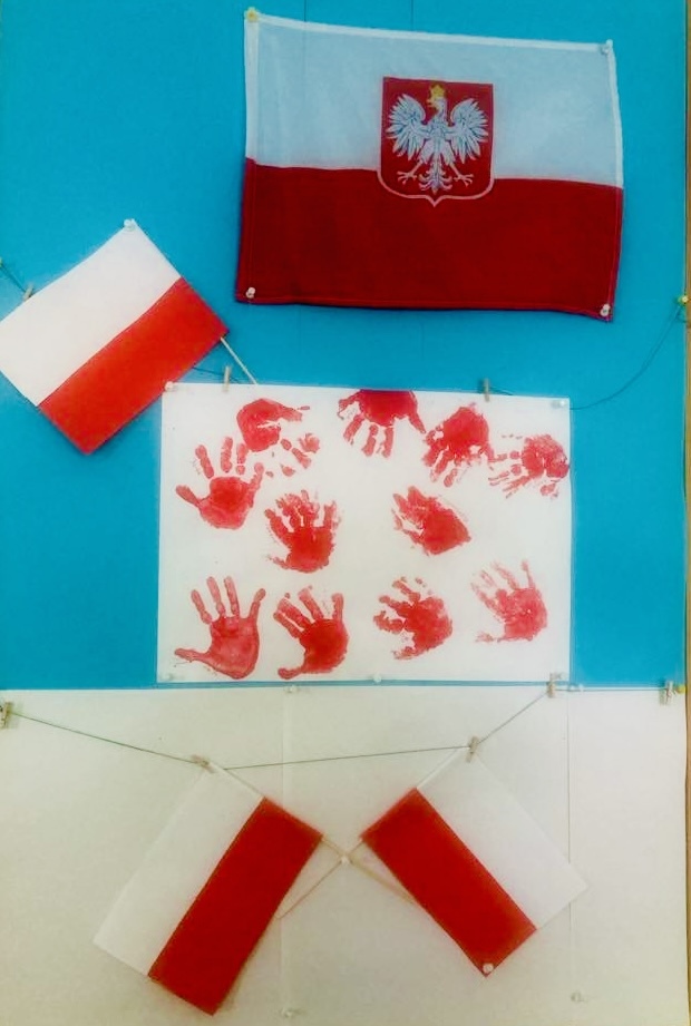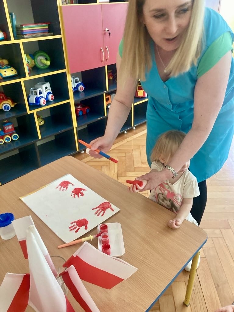 Dziś dzieci z grupy 1 odsłuchały hymnu „Jeszcze Polska nie zginęła… Przy dźwiękach piosenki „ Jesteśmy Polką i Polakiem… dzieci odbijały rączki wymalowane czerwoną farbą na białej kartce .