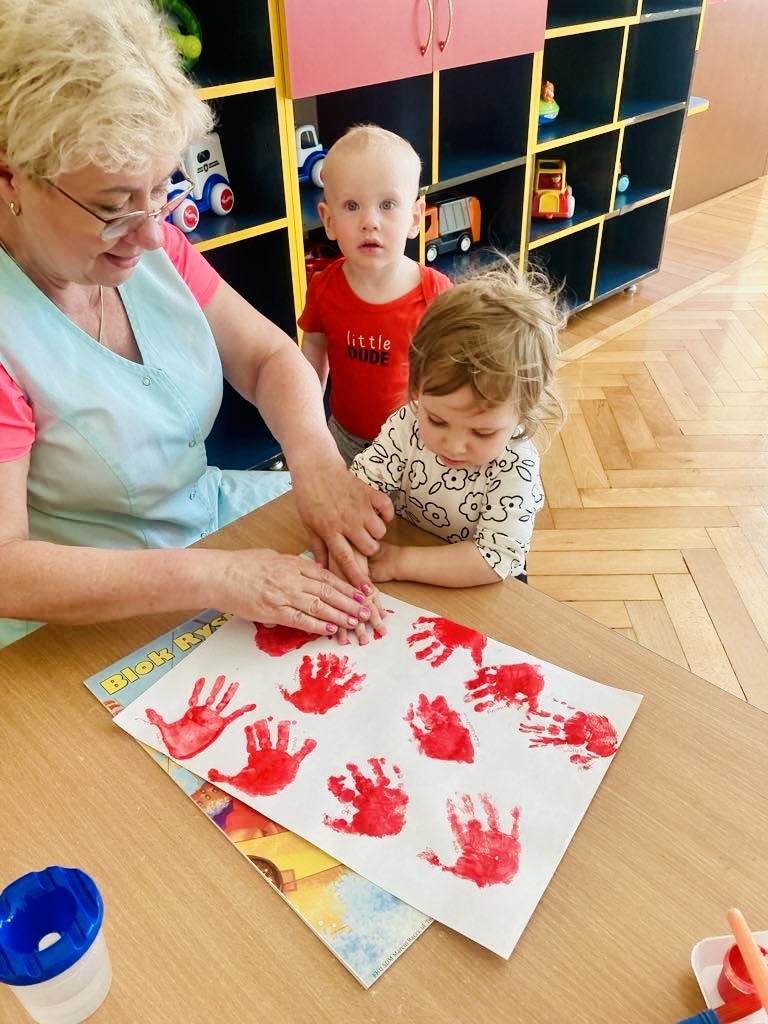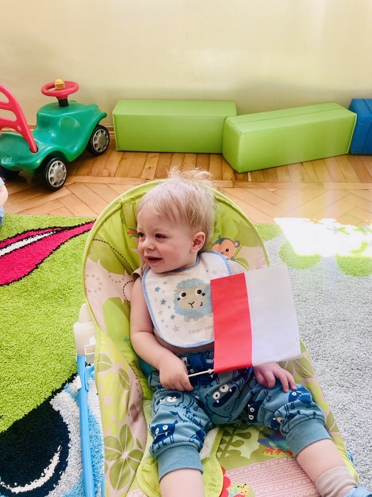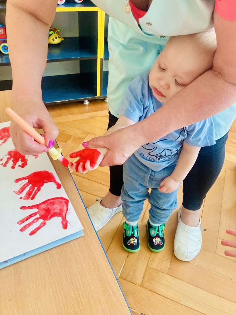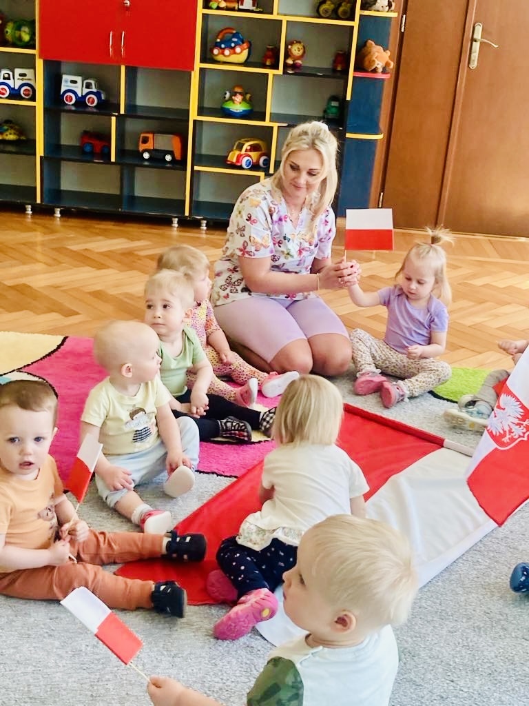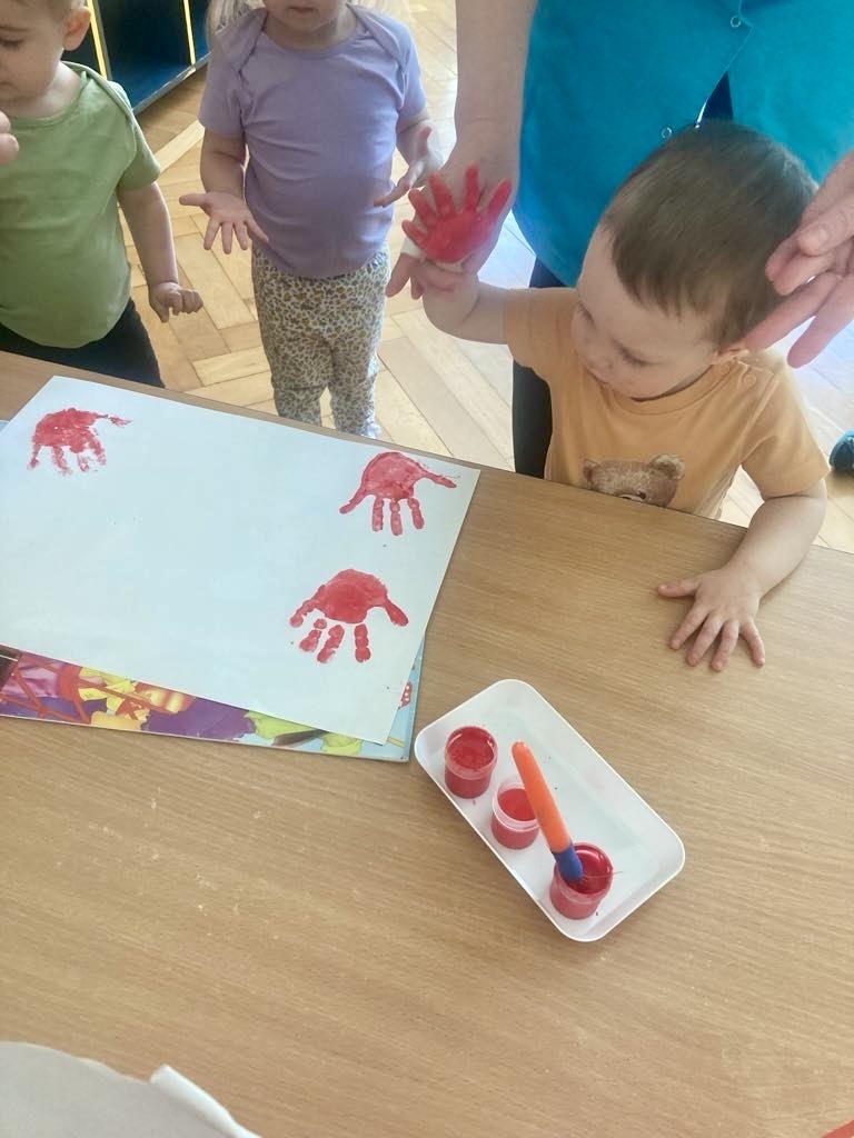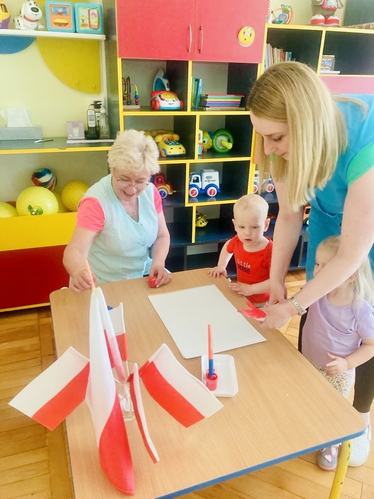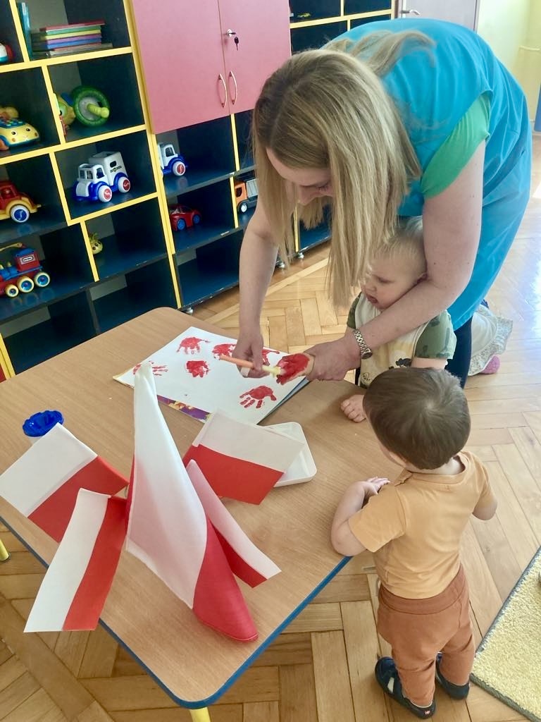 Dziś dzieci z grupy 1 odsłuchały hymnu „Jeszcze Polska nie zginęła… Przy dźwiękach piosenki „ Jesteśmy Polką i Polakiem… dzieci odbijały rączki wymalowane czerwoną farbą na białej kartce .