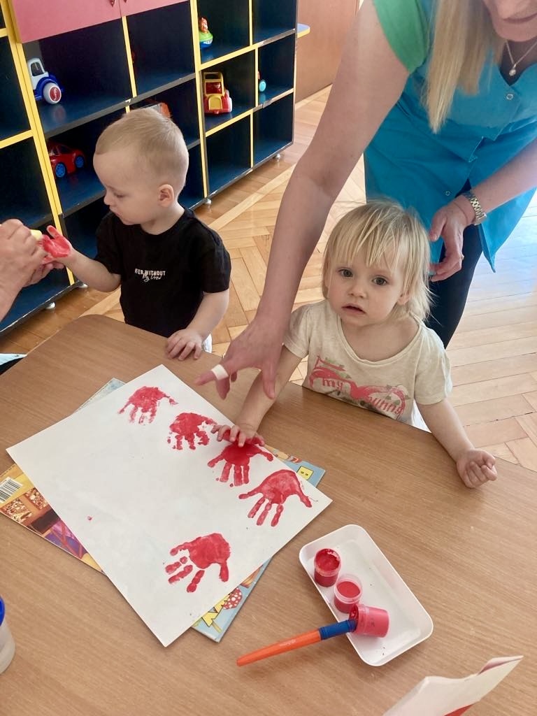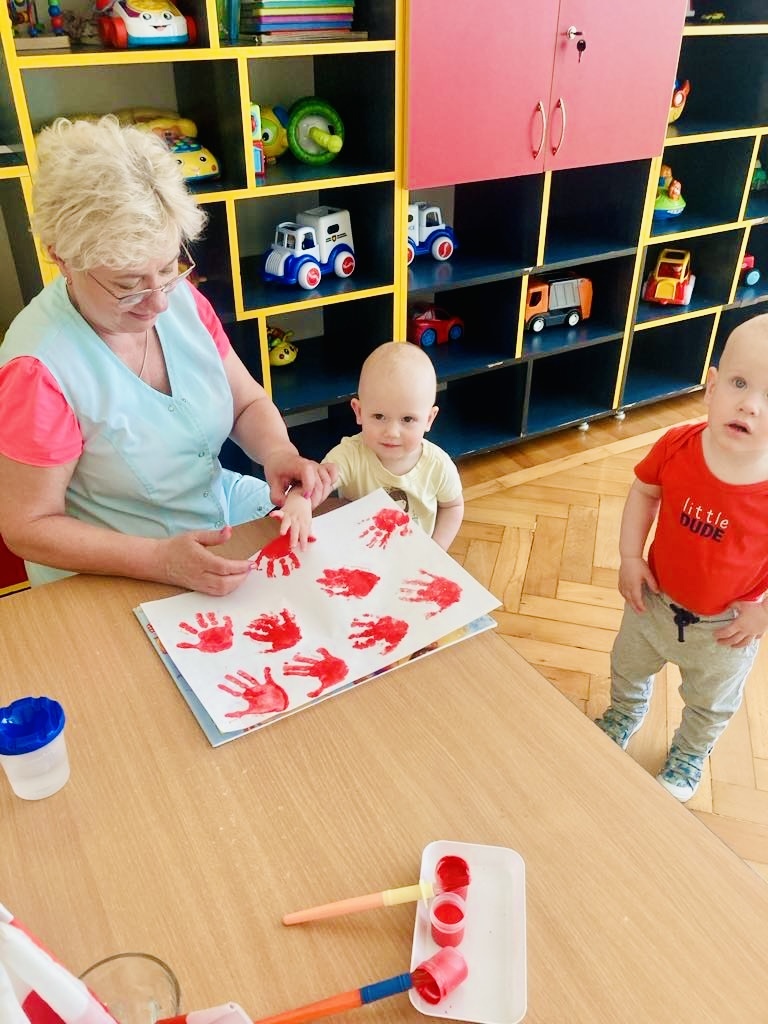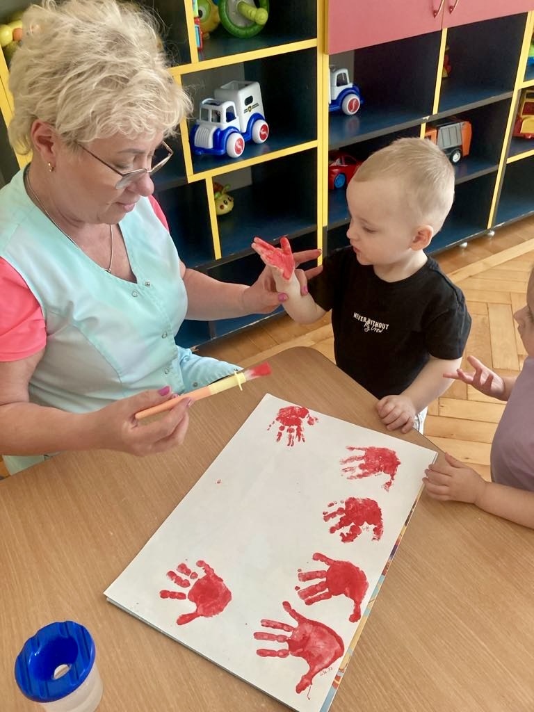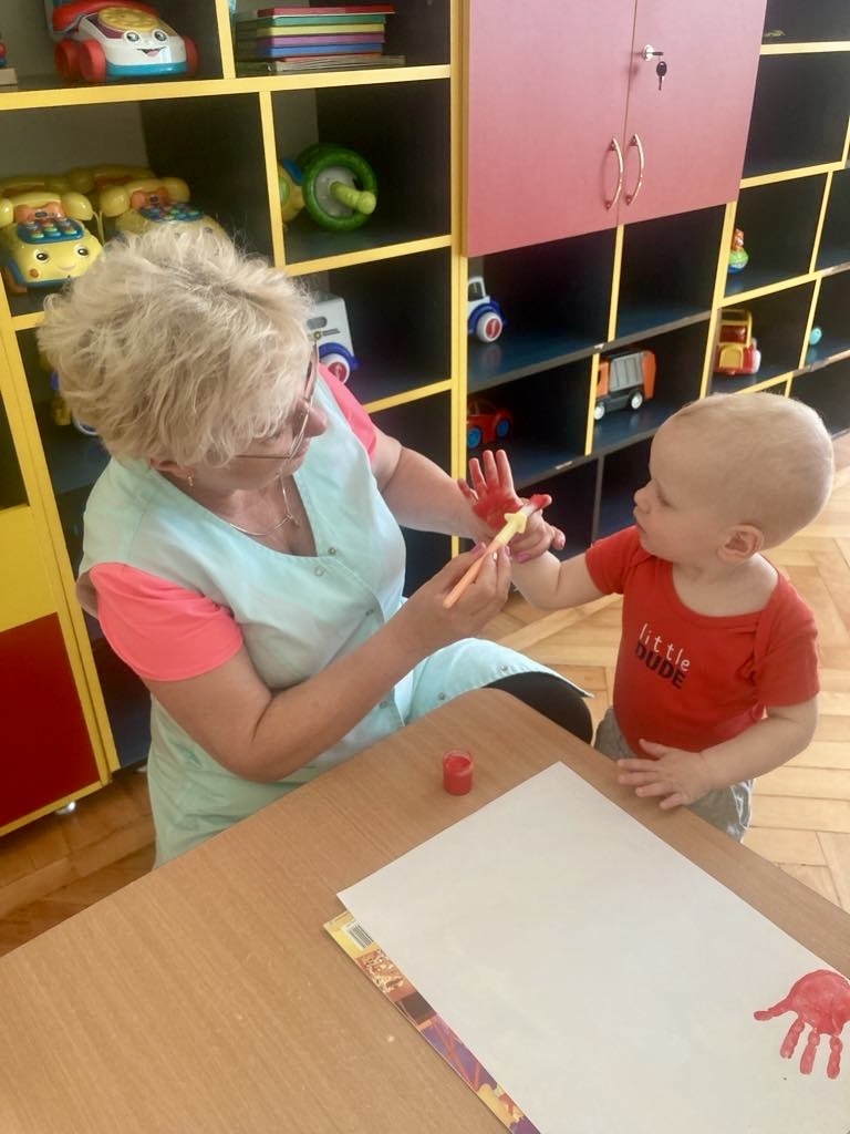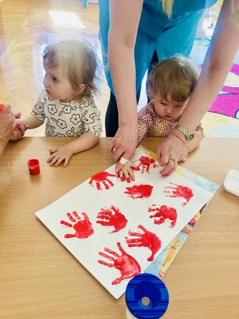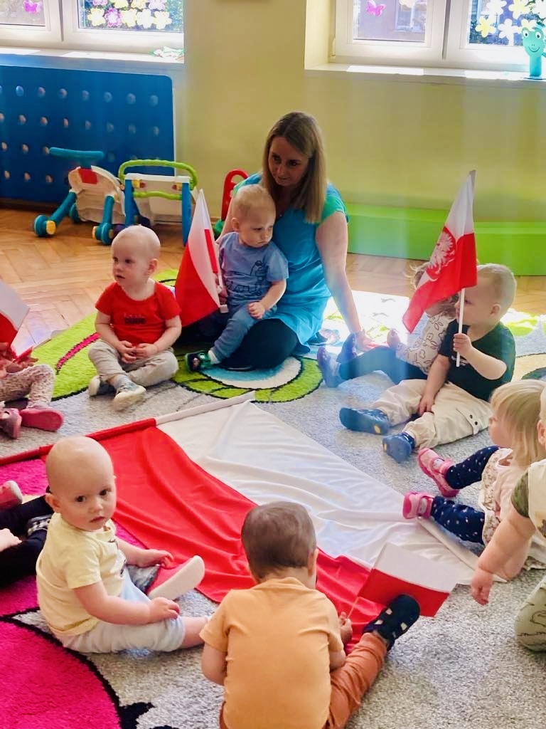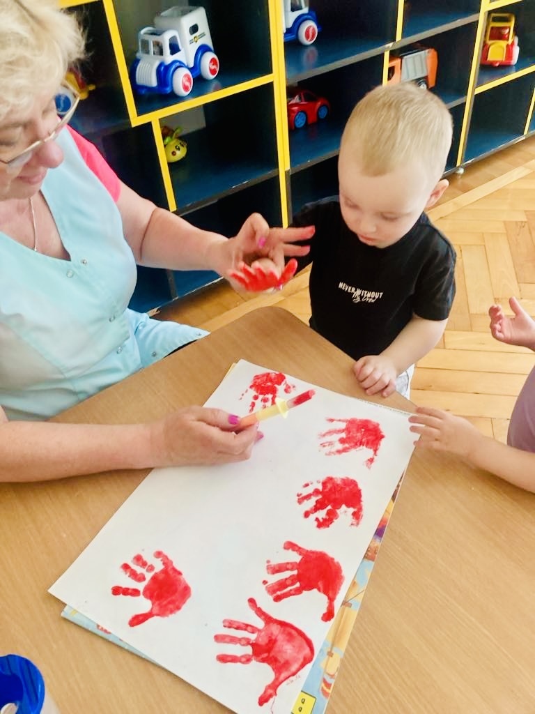 Dziś dzieci z grupy 1 odsłuchały hymnu „Jeszcze Polska nie zginęła… Przy dźwiękach piosenki „ Jesteśmy Polką i Polakiem… dzieci odbijały rączki wymalowane czerwoną farbą na białej kartce .