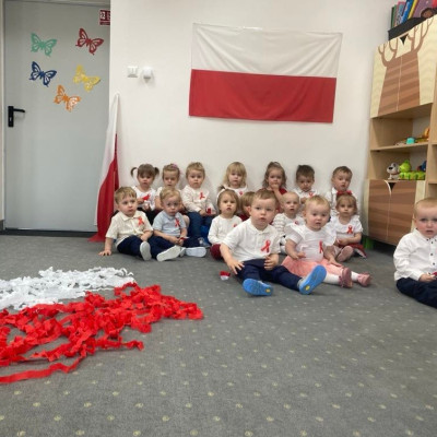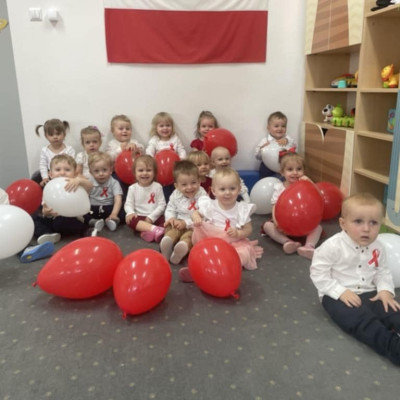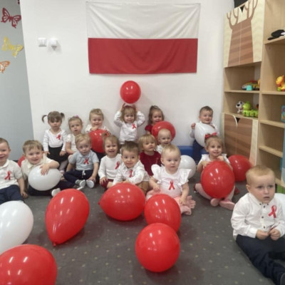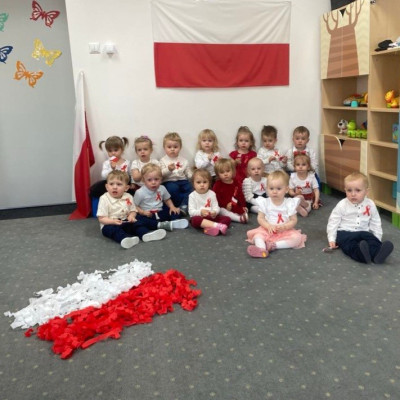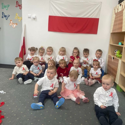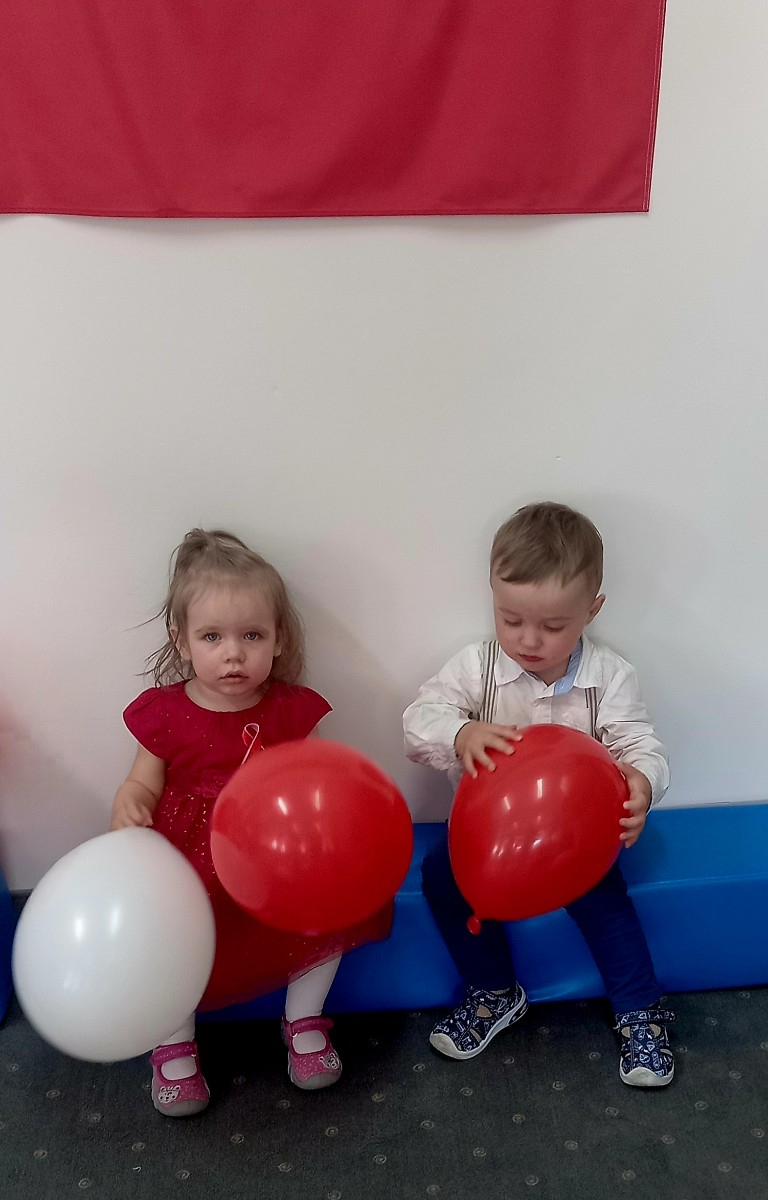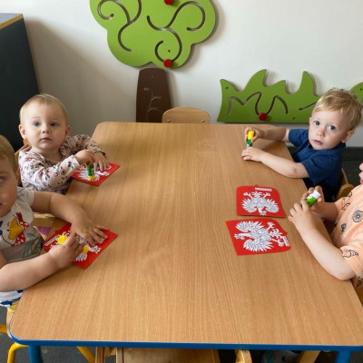 Maluszki zapoznały się z symbolami narodowymi, wykonały prace plastyczne - "Godło Polski", uczyły się wierszy " Kto Ty jesteś?" , " Powiewa flaga" oraz śpiewały hymn Polski " Mazurek Dąbrowskiego" wyrażając w ten sposób miłość i przywiązanie do Ojczyzny.