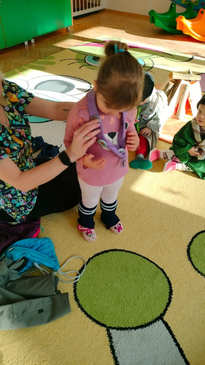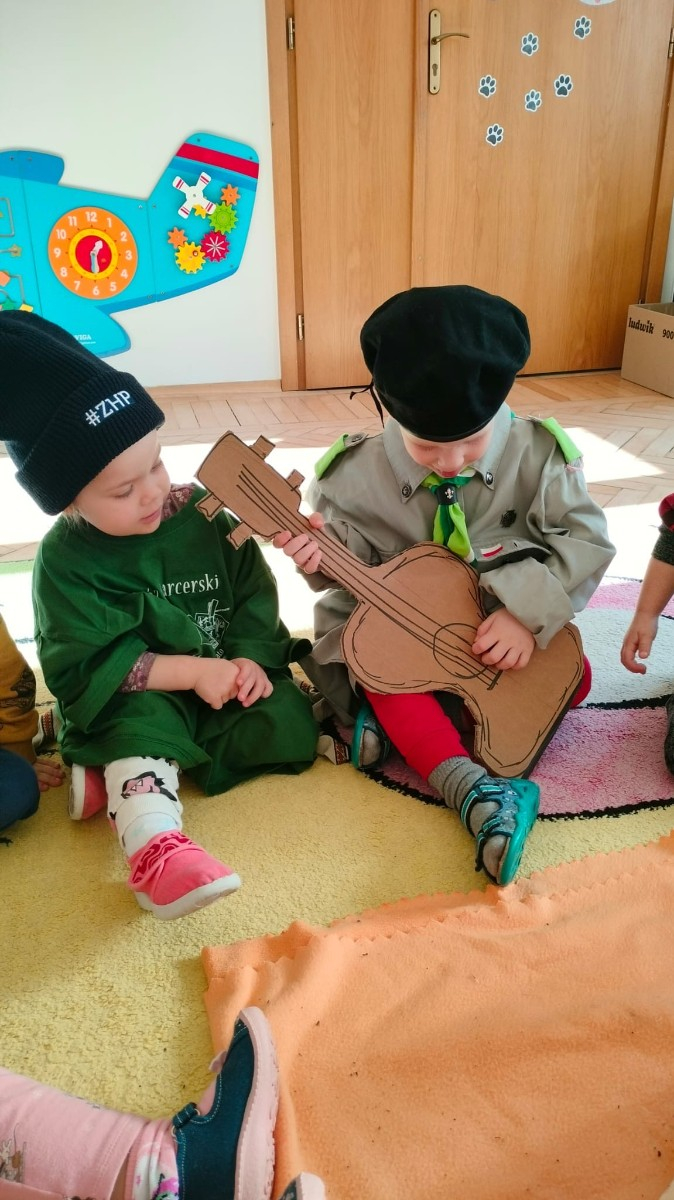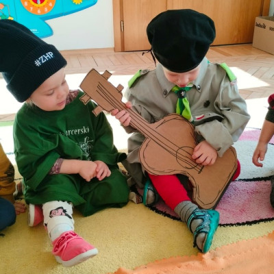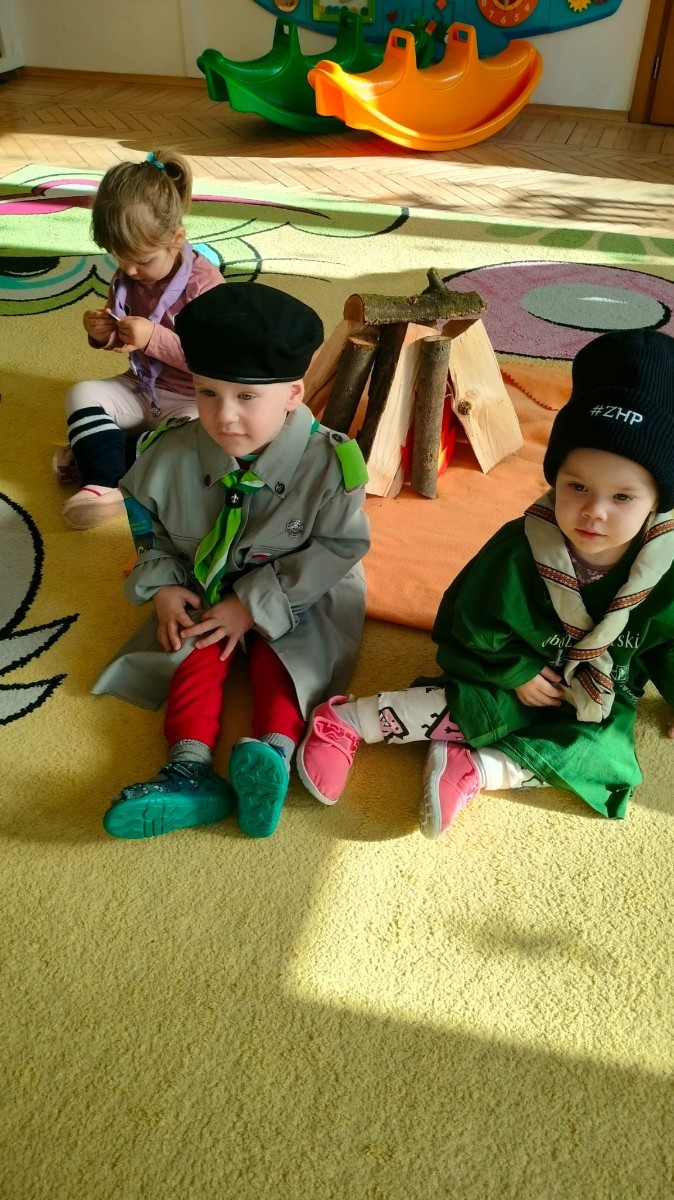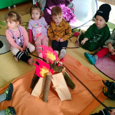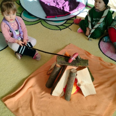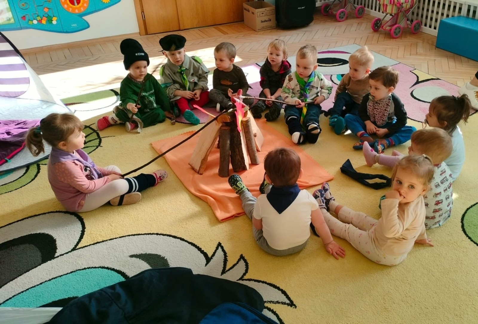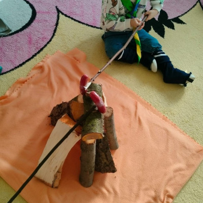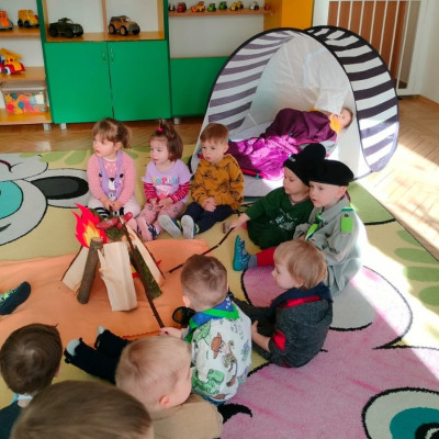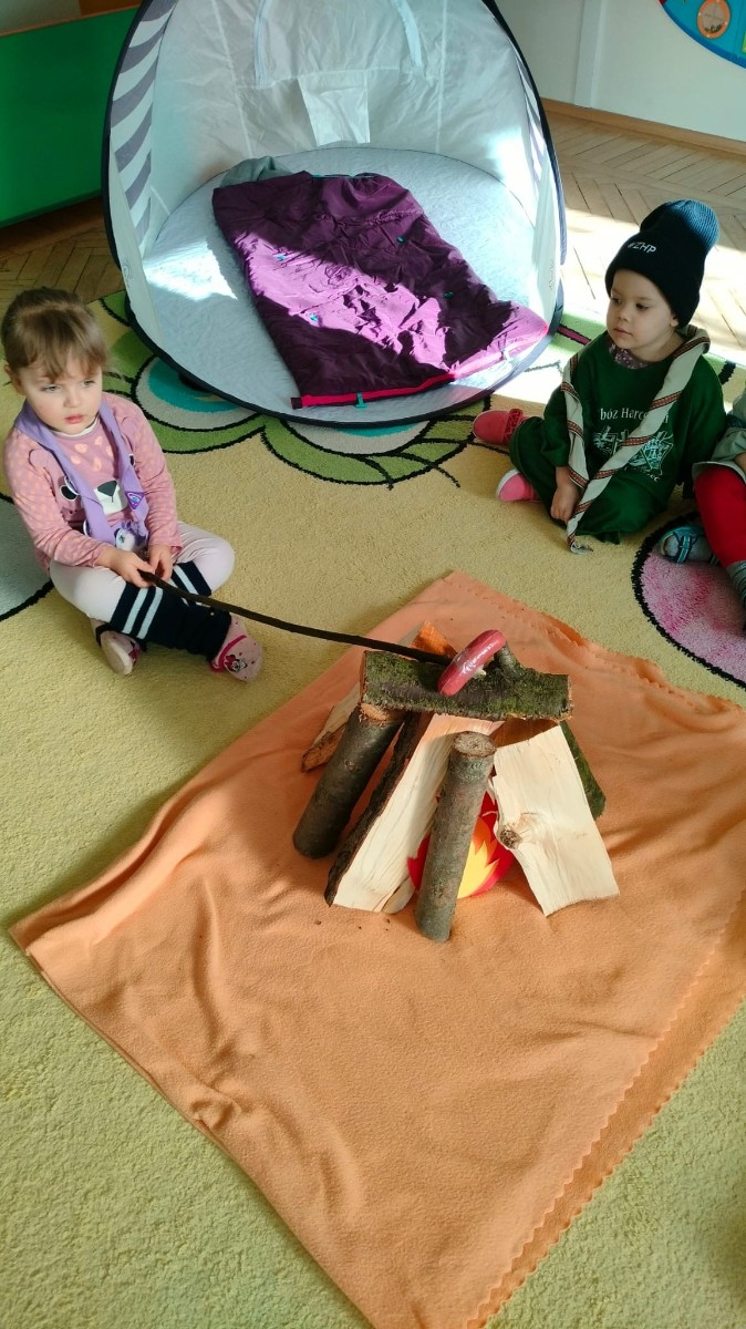 Tego dnia nasza sala zabaw zamieniła się w biwak harcerski. Były namioty🏕️, śpiwory , w których spały maluszki. Rozpaliliśmy ognisk🔥, przy którym wspólnie wśpiewaliśmy piosenki harcerskie i piekliśmy kiełbaski na kijach.