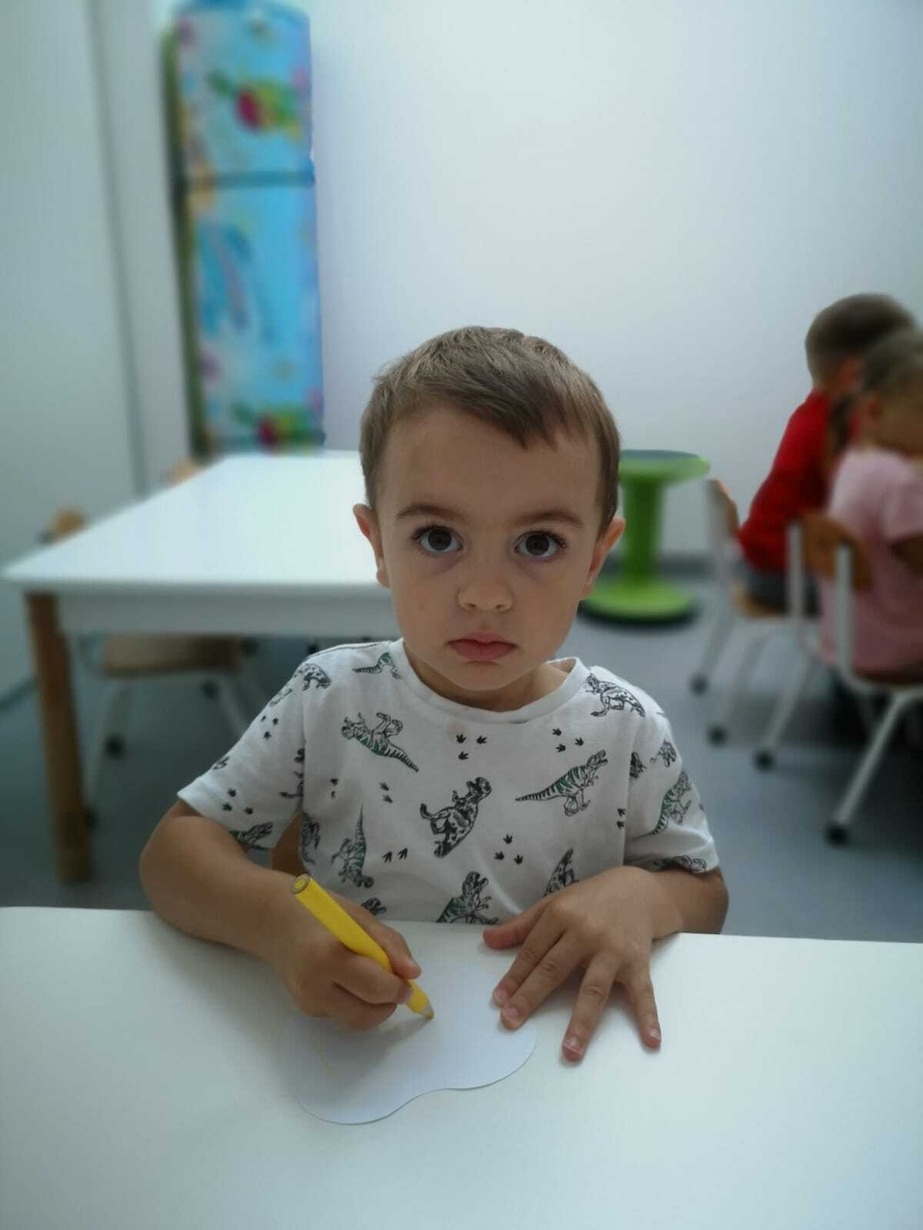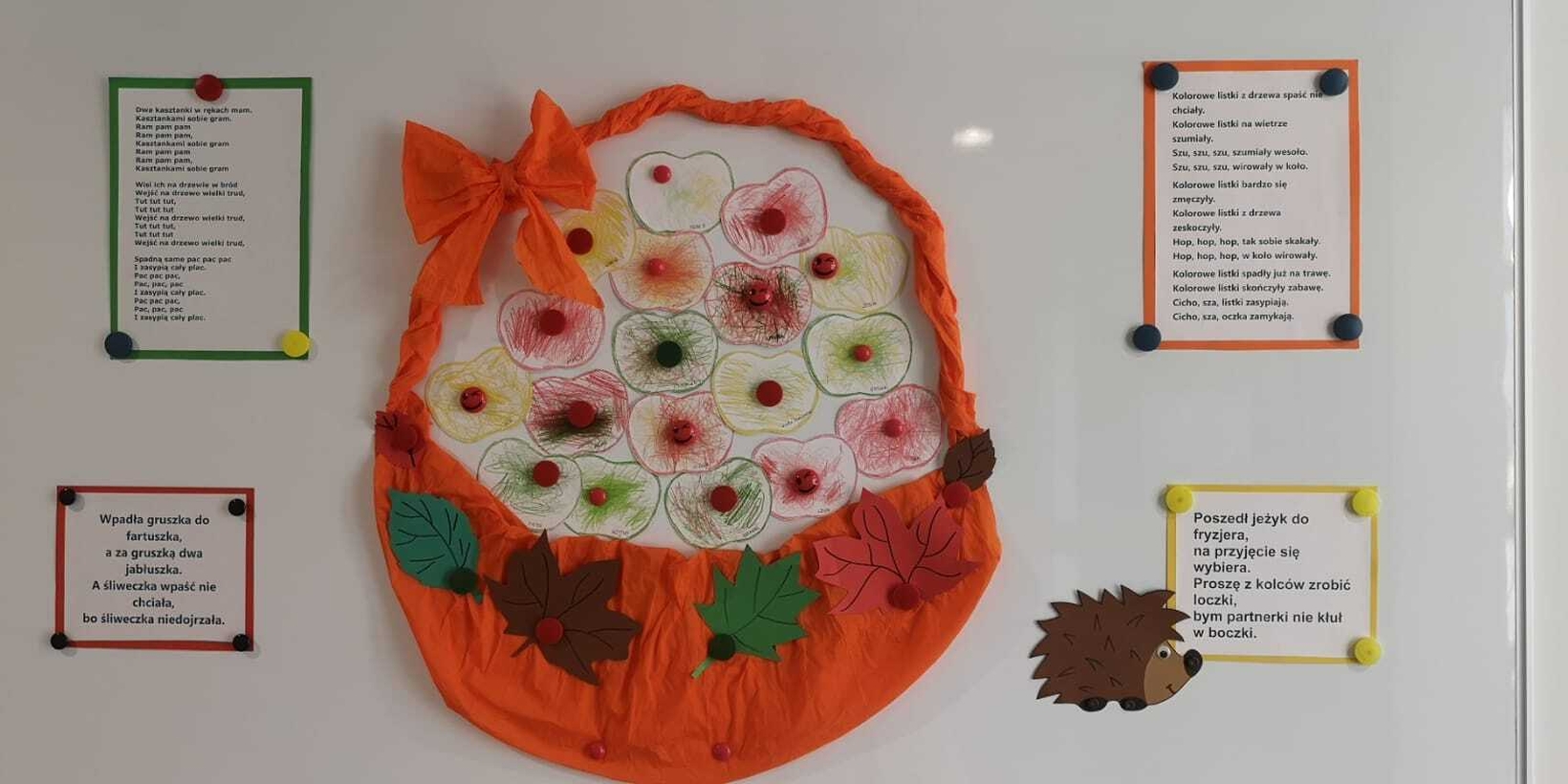 Dzisiaj Rybki świętowały Dzień Jabłka. Z tej okazji każde dziecko wykonały kolorowe jabłuszka, które potem pięknie udekorowały nasz jesienny koszyczek na tablicy z pracami plastycznymi.