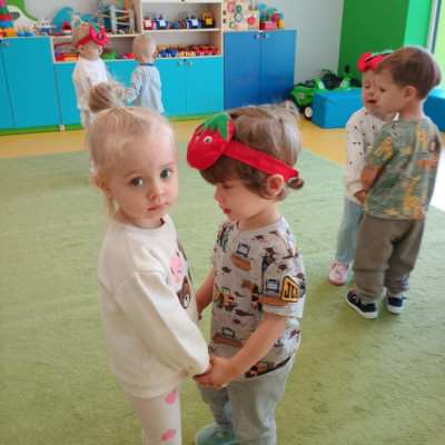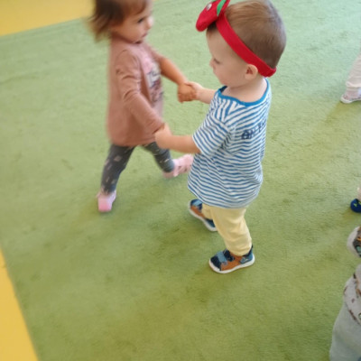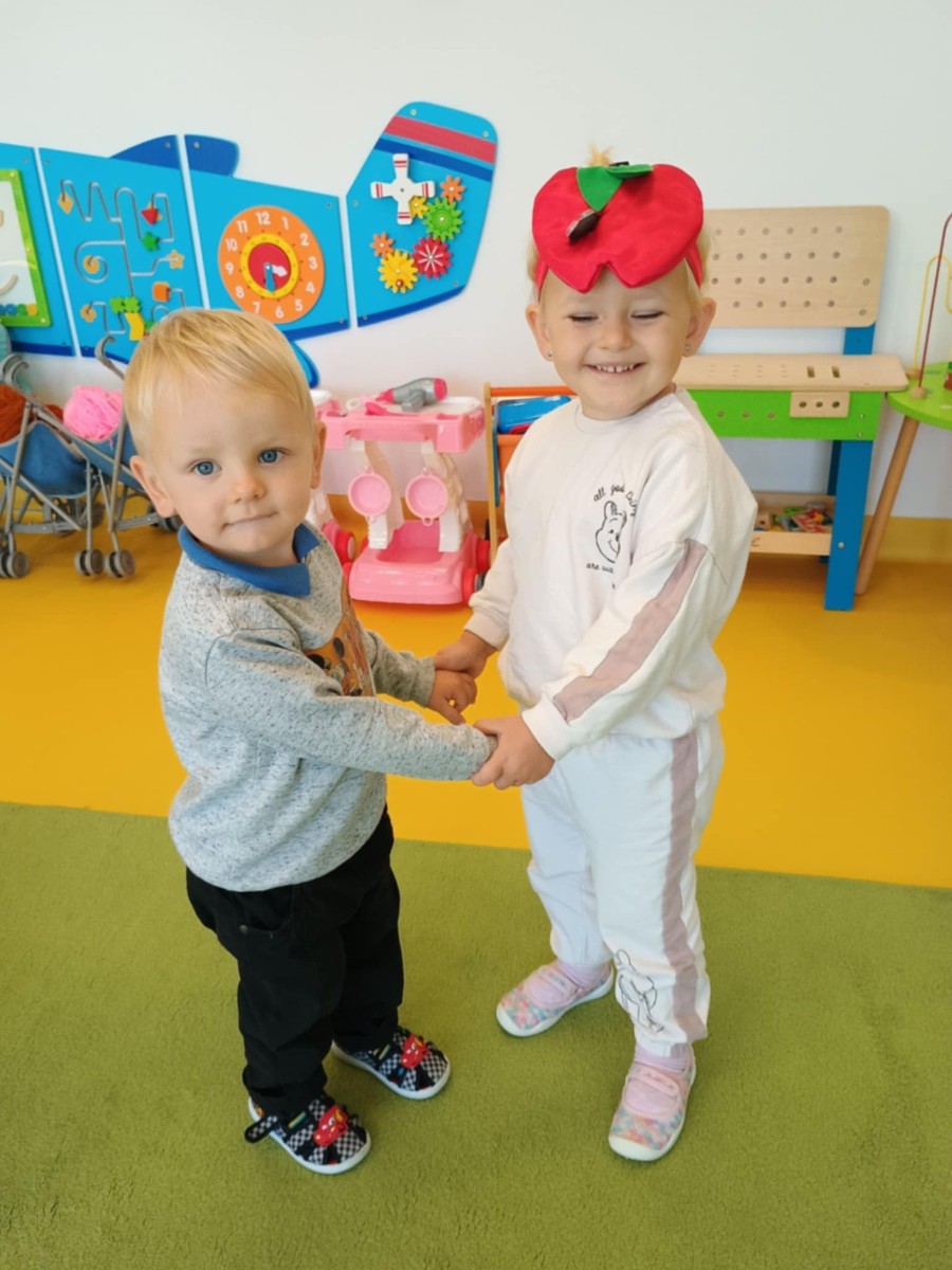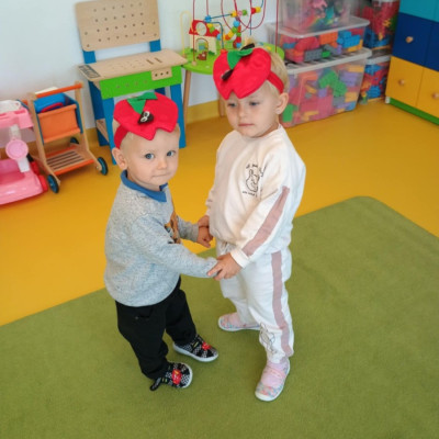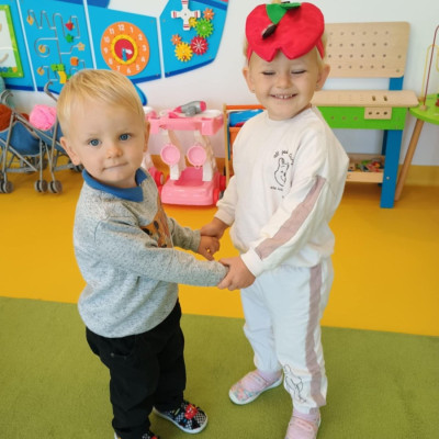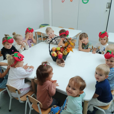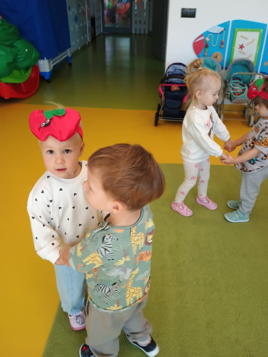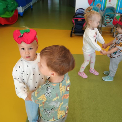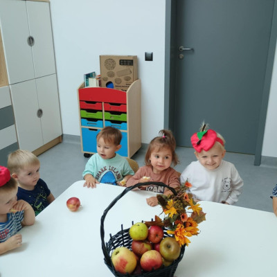 Dzieci poznały różne gatunki jabłek, ich kształt , zapach, kolor i smak . Wszystkie zabawy tego dnia dominowały pod znakiem jabłka, były tańce w parach do słów piosenki " Małe czerwone jabłuszko, tańczy dziś pod drzewem z gruszką ..."