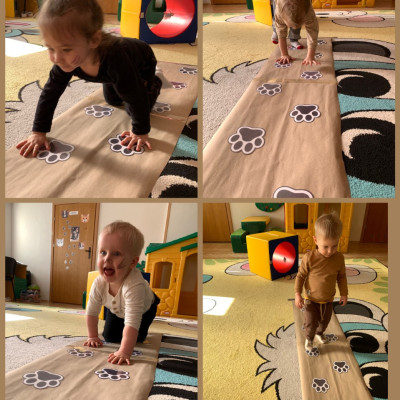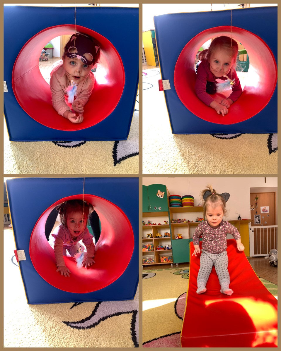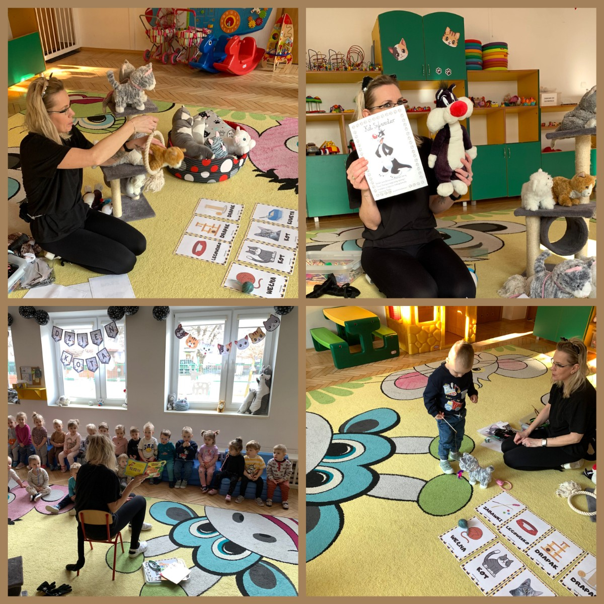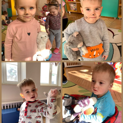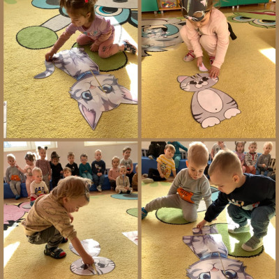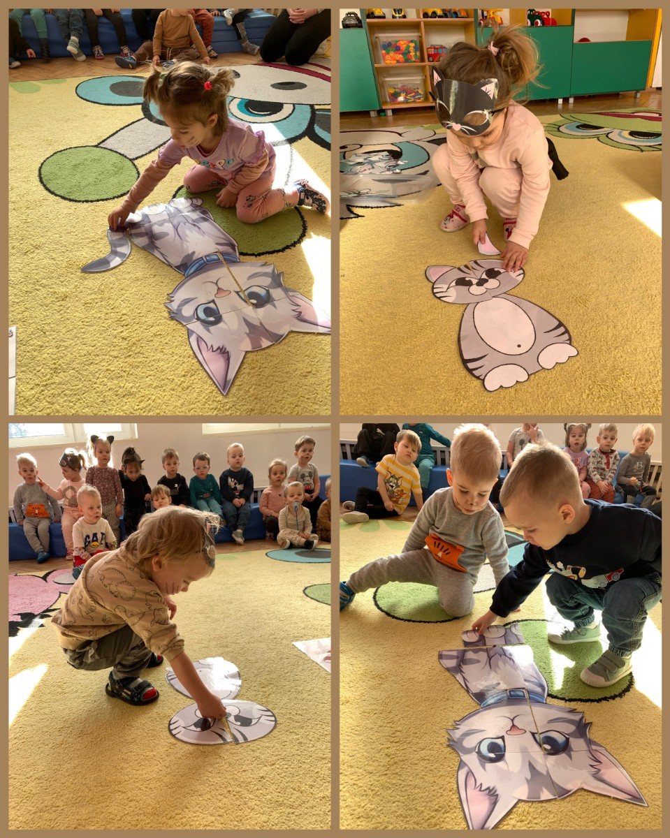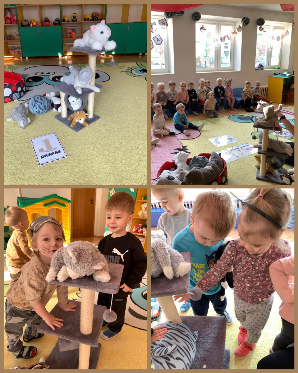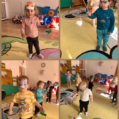 Nasza sala zamieniła się w kocie królestwo, a Maluszki przeobraziły się w urocze kociaki: maski, opaski z uszkami, pomalowane wąsiki oraz ogonki. Dzieci słuchały bajeczki o kotkach, poznały rasy oraz ich obyczaje. Były też wesołe ,,kocie zabawy”przy znanych piosenkach oraz koci tor przeszkód. 🐈