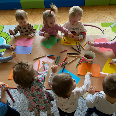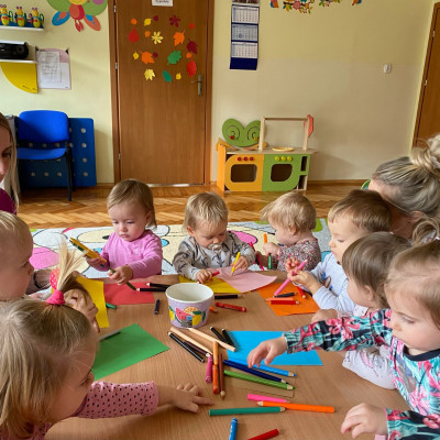 Grupa Biedronek 22.11 obchodziła Dzień Kredki 🖍️🖍️🖍️Z tej okazji dzieci próbowały swoich możliwości w rysowaniu kredkami, przy pomocy Cioć wykonały prace plastyczne mające na celu naukę rozróżniania kolorów.
