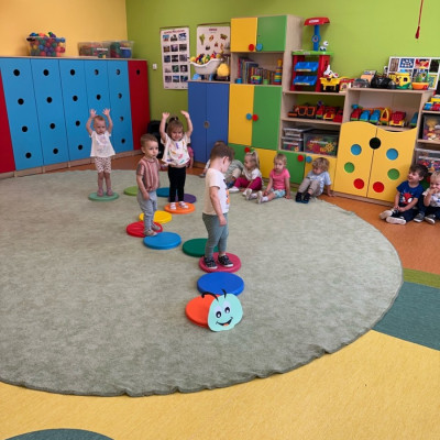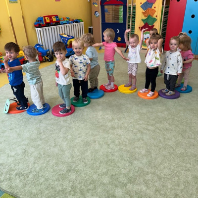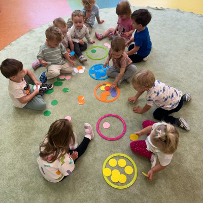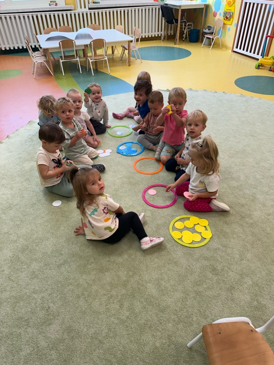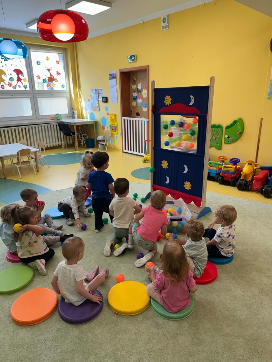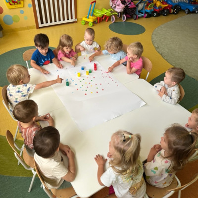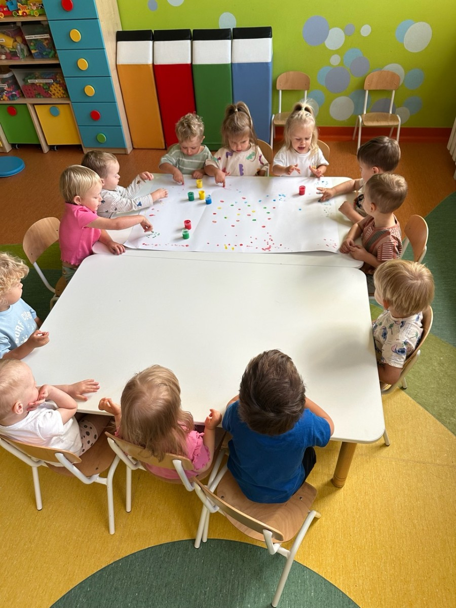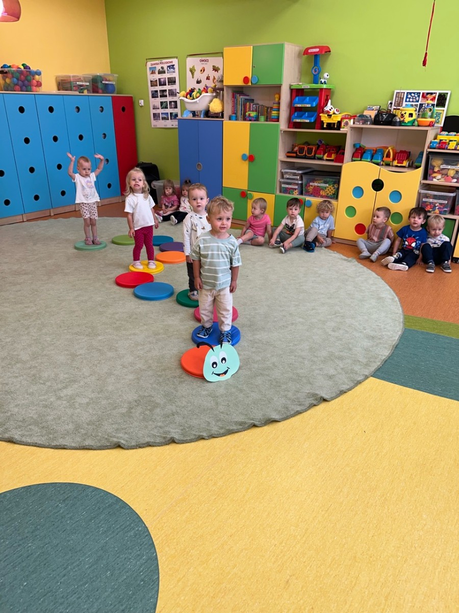 Dziś na gr Rybek obchodziliśmy Międzynarodowy dzień kropki. Dzieci uczestniczyły w kolorowych zajęciach, malując paluszkami kropkowy plakat. Po zajęciach plastycznych, odbyły się zajęcia ruchowe: segregowanie kółek wg kolorów, rzut do celu kolorowymi piłkami oraz zabawy z gąsienicą. Celem naszych zajęć było rozbudzenie kreatywności i sprawności fizycznej, oraz dostarczenie dzieciom dużo radości i dobrej zabawy