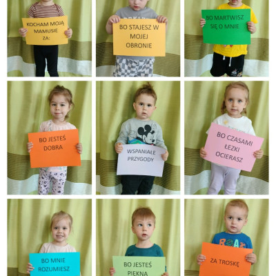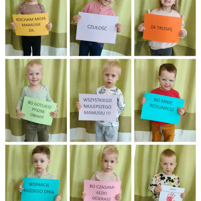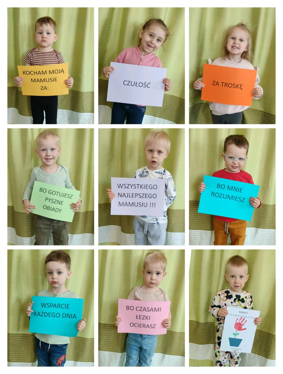 Zdjęcia przedstawiają dzieci obchodzące Dzień Mamy