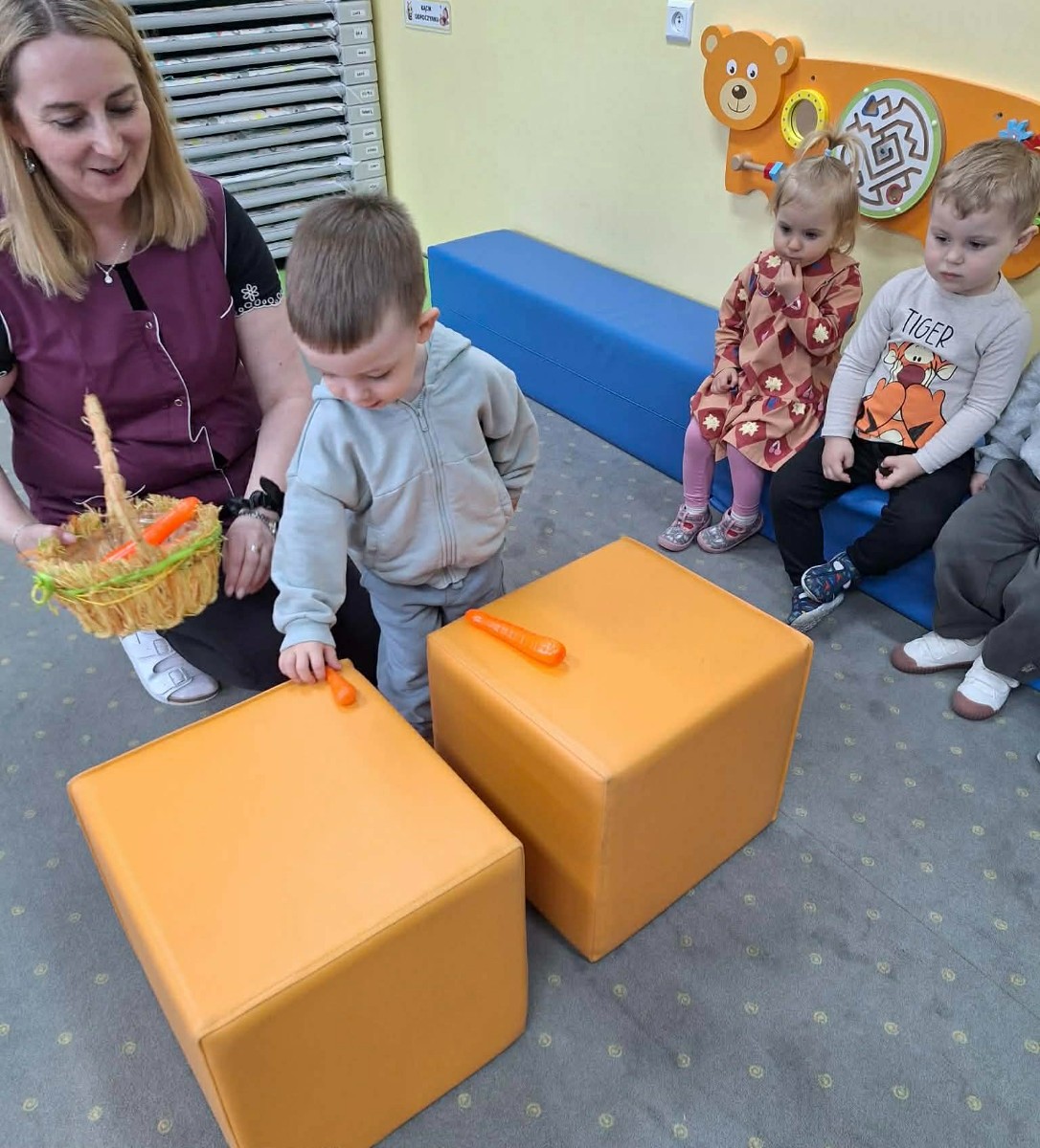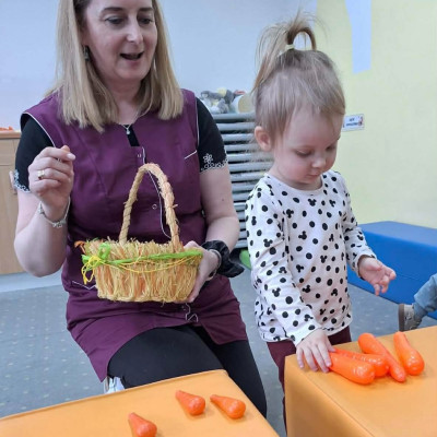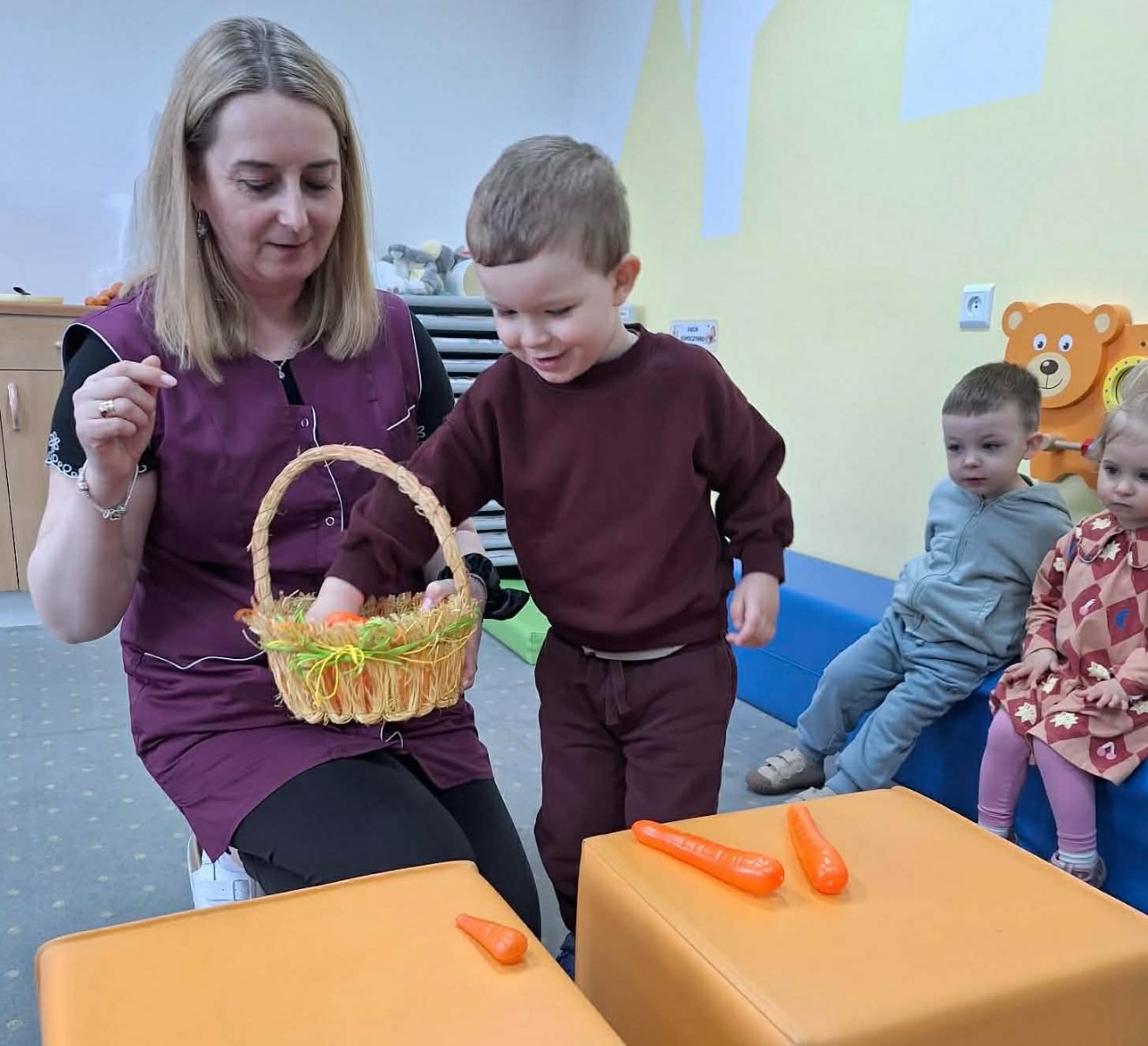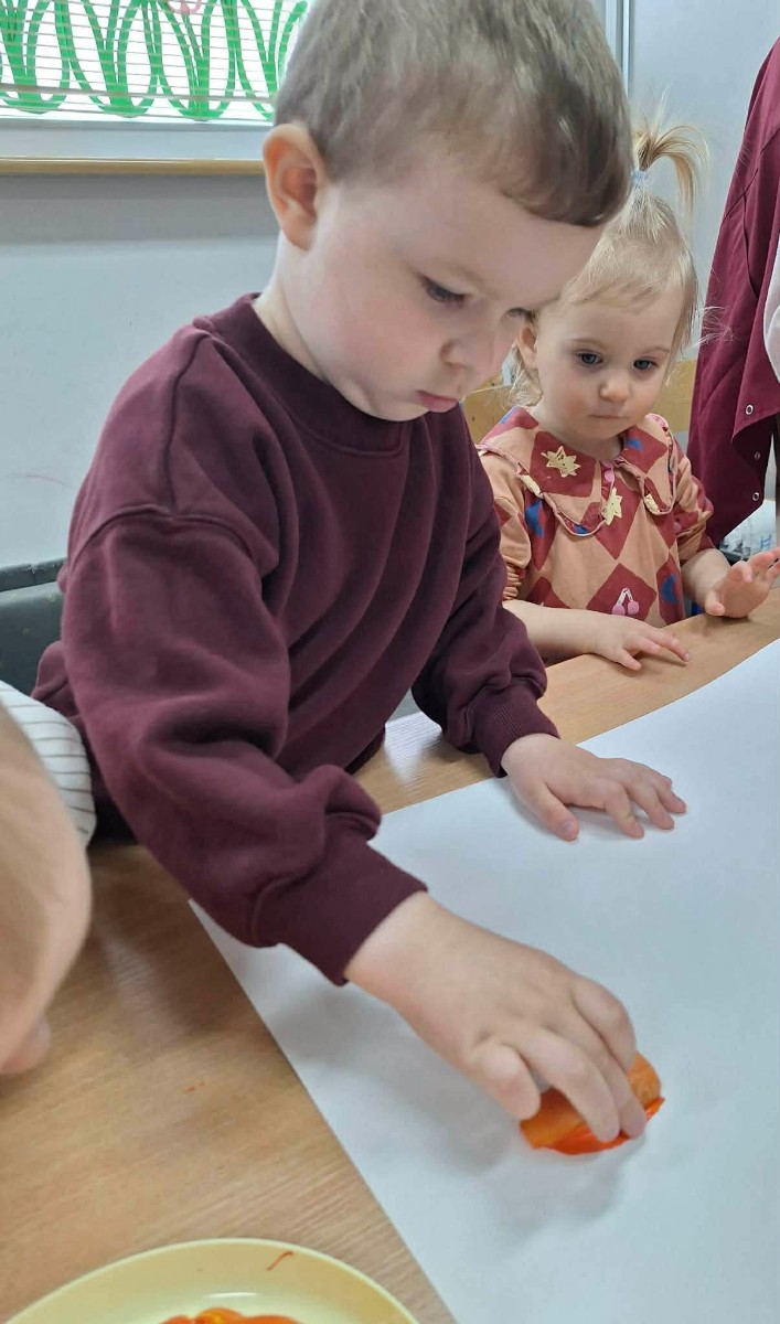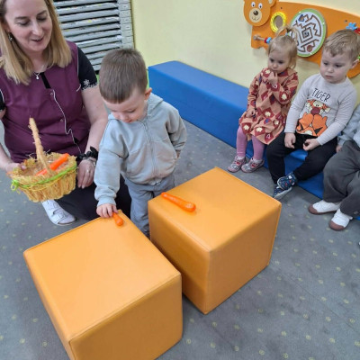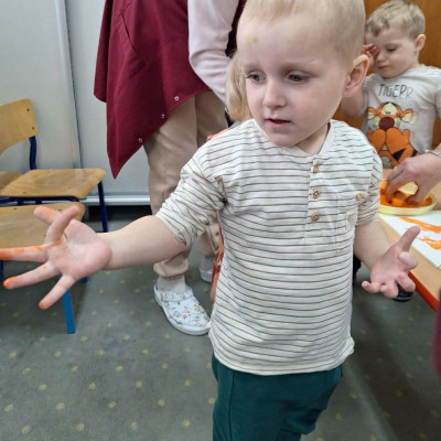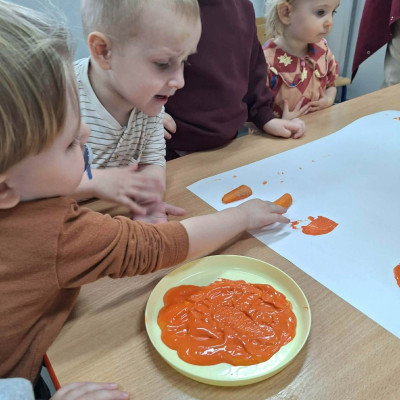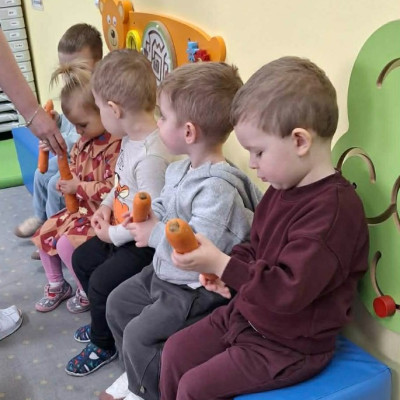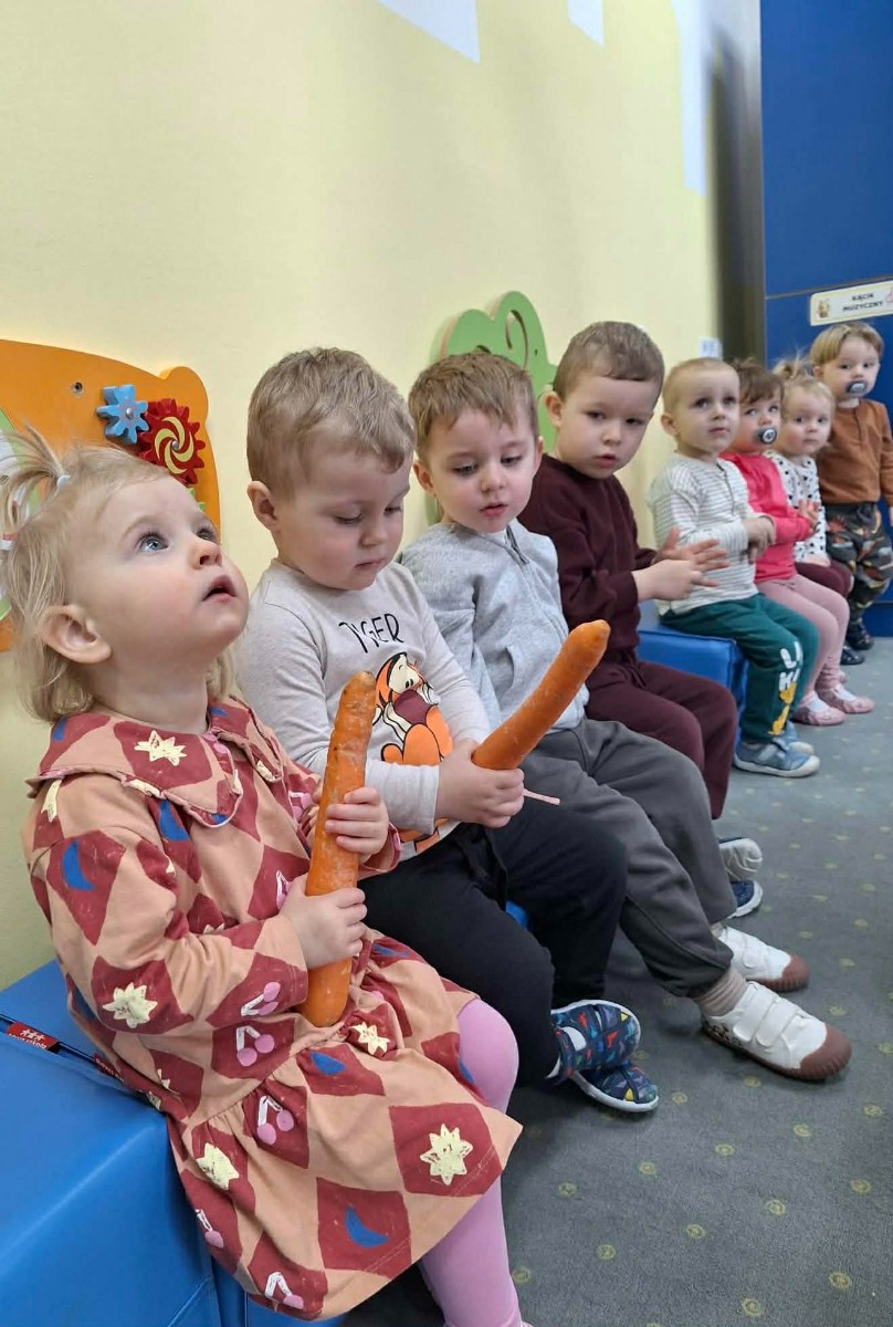 Grupa Pszczółek obchodziła „Dzień Marchewki”, oczywiście królowało to bardzo zdrowe warzywo. Były tańce i zabawy ruchowe, oglądanie, dotykanie i poznawanie właściwości zdrowotnych marchewki, porównywanie wielkości i tworzenie pracy z marchewkowych pieczątek. Na koniec odbyła się degustacja pysznego soku.