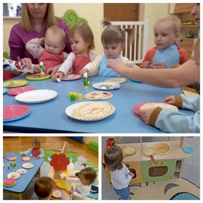 Zdjęcia przedstawiają dzieci podczas zajęć z okazji ,,Dnia naleśnika"