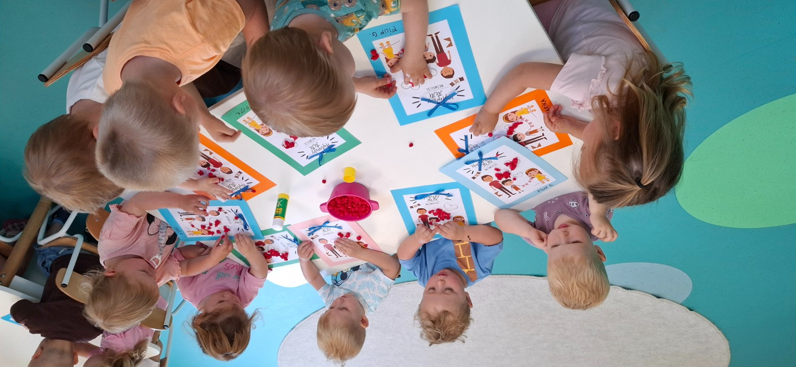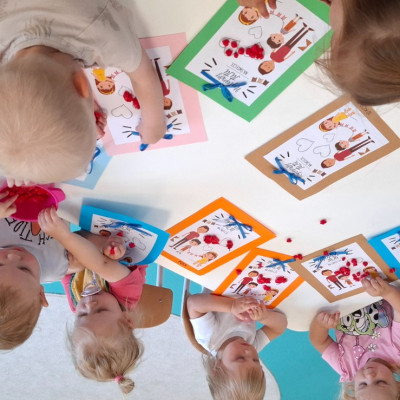 Zdjęcie przedstawia dzieci przygotowujące laurki dla taty.