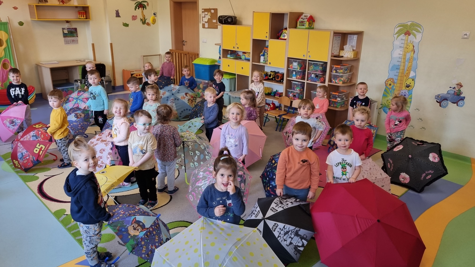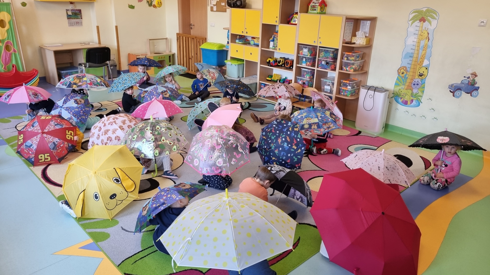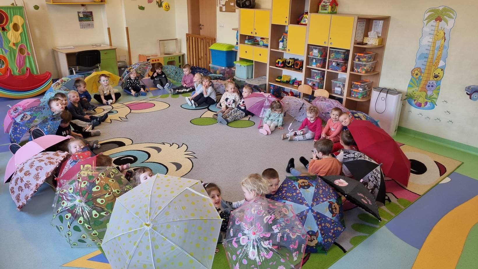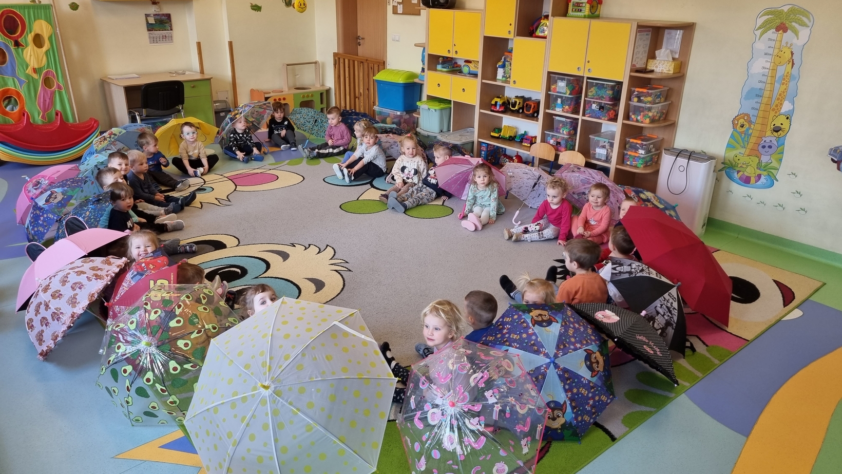 Dzisiaj w żłobku w gr. Pszczółek obchodziliśmy "Dzień Parasola". Dzieci w tym dniu przyniosły Swoje kolorowe parasolki. Bawiliśmy się w różne wesołe zabawy: wirowanie parasoli, tańczyliśmy z parasolkami i chowaliśmy się pod nimi. Był też czas na zabawy integracyjne tutaj za parasol posłużyła nam kolorowa chusta animacyjna. Radości było co niemiara, uśmiech nie znikał z dziecięcych twarzy. To był bardzo ciekawy dzień.