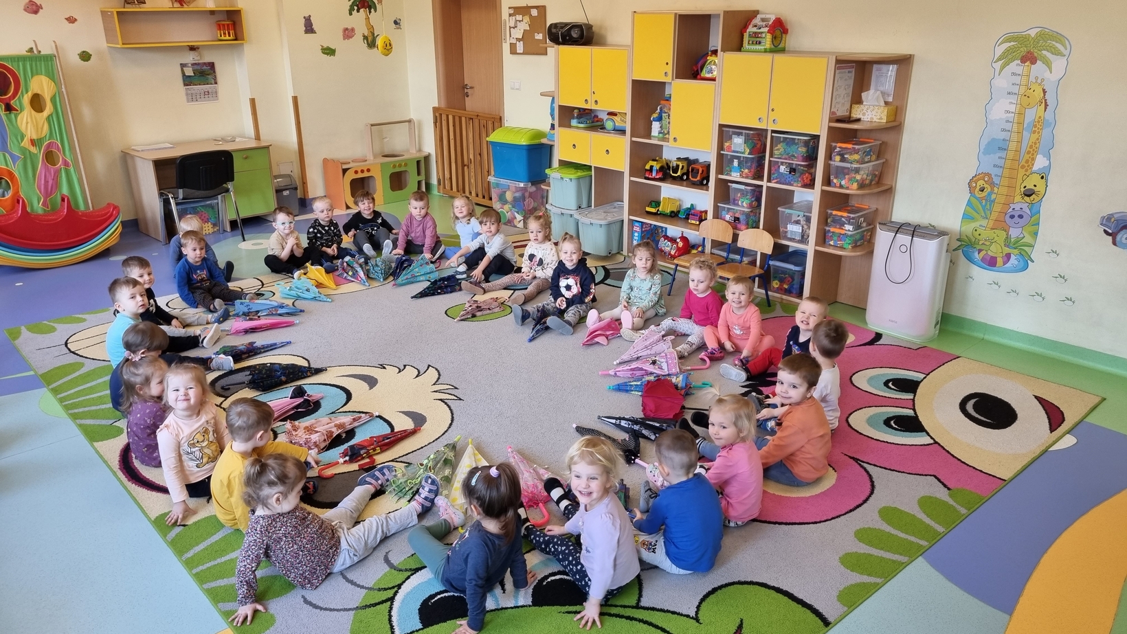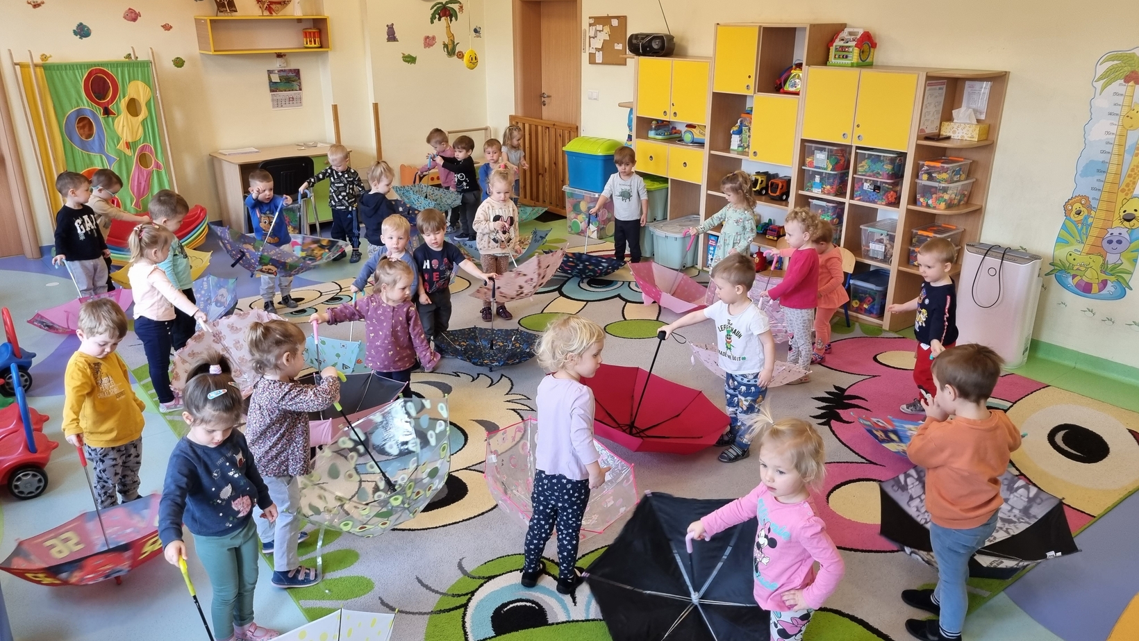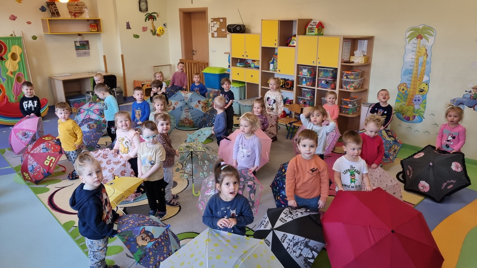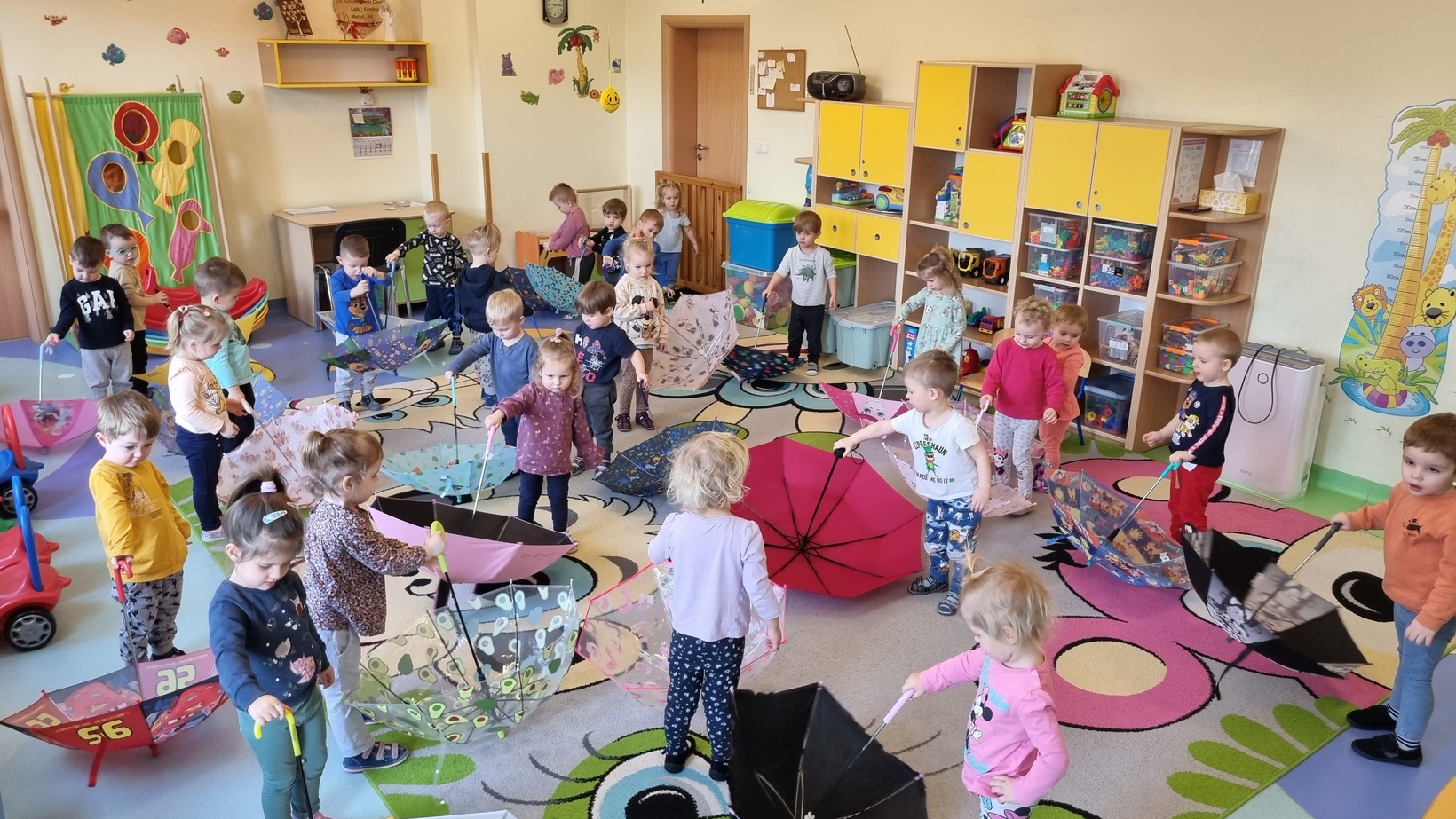 Dzisiaj w żłobku w gr. Pszczółek obchodziliśmy "Dzień Parasola". Dzieci w tym dniu przyniosły Swoje kolorowe parasolki. Bawiliśmy się w różne wesołe zabawy: wirowanie parasoli, tańczyliśmy z parasolkami i chowaliśmy się pod nimi. Był też czas na zabawy integracyjne tutaj za parasol posłużyła nam kolorowa chusta animacyjna. Radości było co niemiara, uśmiech nie znikał z dziecięcych twarzy. To był bardzo ciekawy dzień.