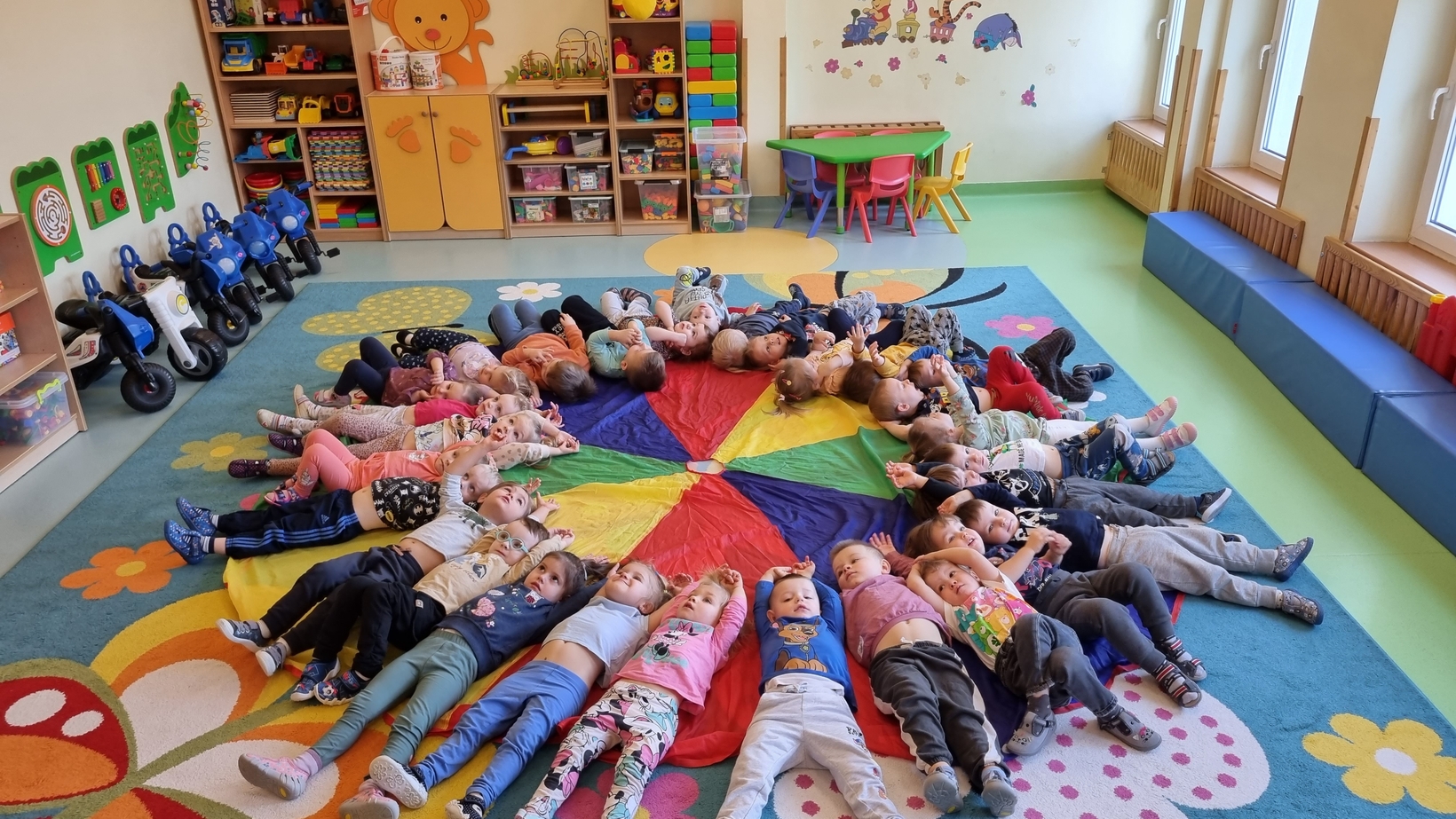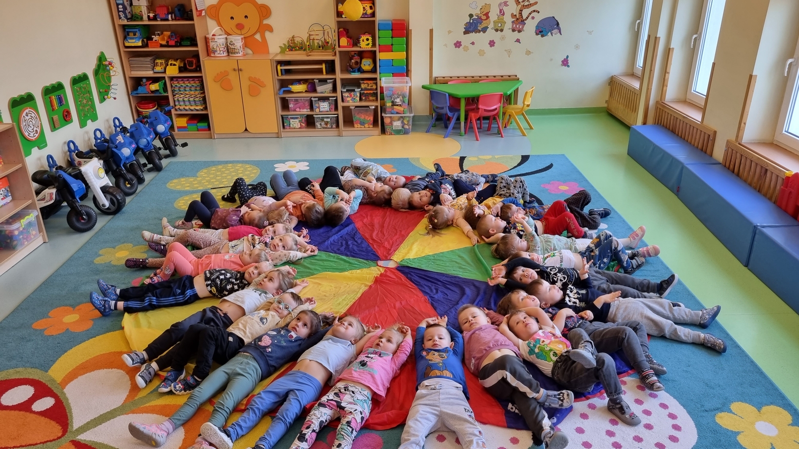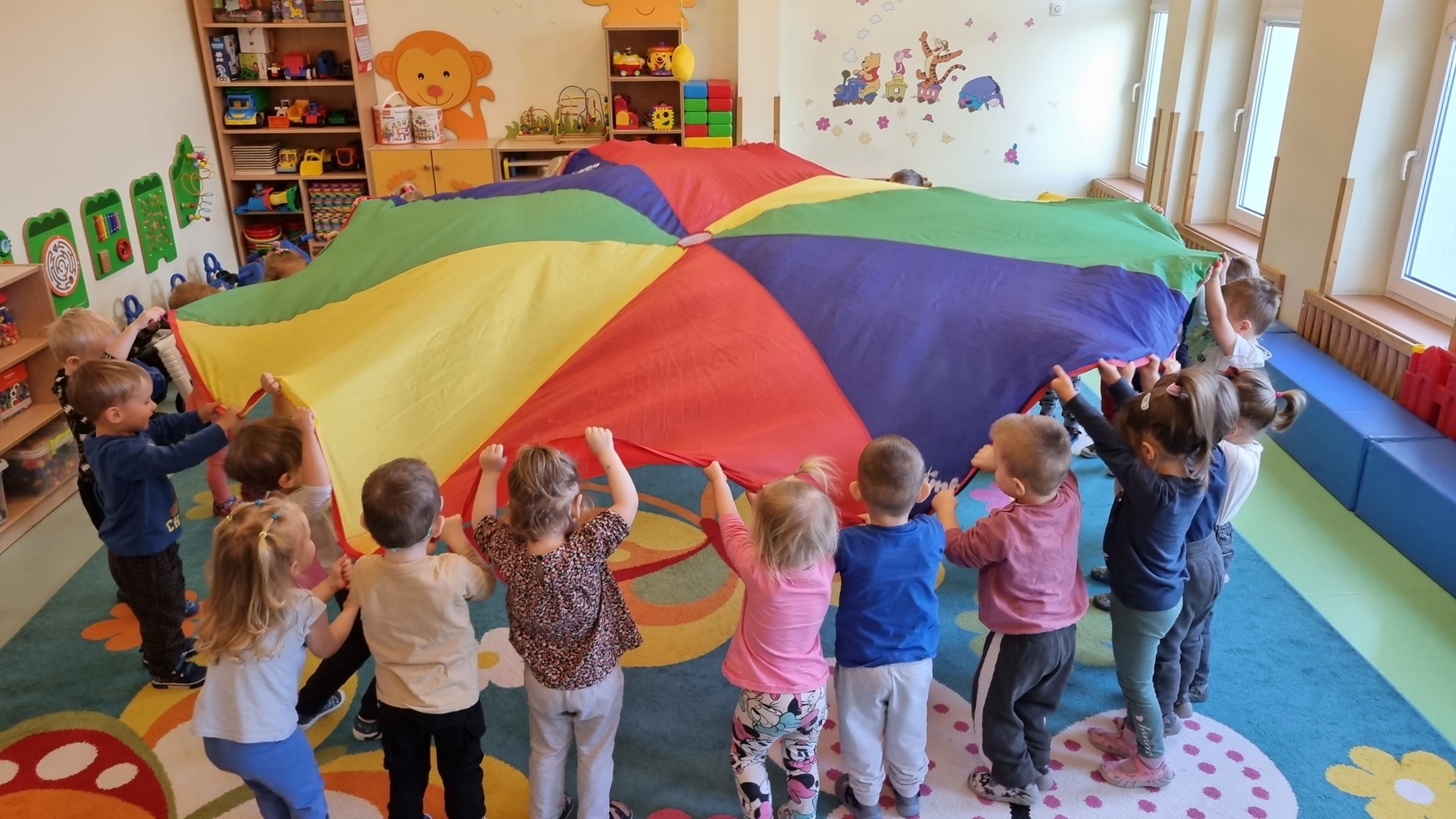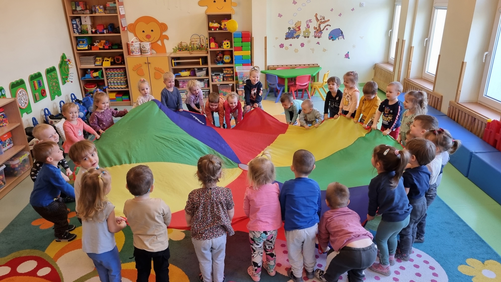 Dzisiaj w żłobku w gr. Pszczółek obchodziliśmy "Dzień Parasola". Dzieci w tym dniu przyniosły Swoje kolorowe parasolki. Bawiliśmy się w różne wesołe zabawy: wirowanie parasoli, tańczyliśmy z parasolkami i chowaliśmy się pod nimi. Był też czas na zabawy integracyjne tutaj za parasol posłużyła nam kolorowa chusta animacyjna. Radości było co niemiara, uśmiech nie znikał z dziecięcych twarzy. To był bardzo ciekawy dzień.