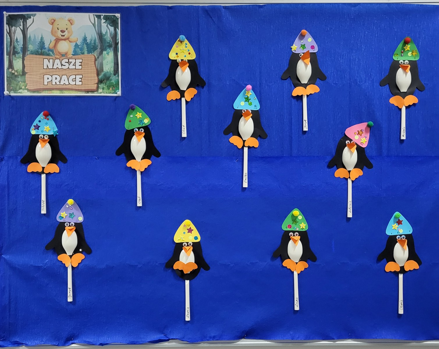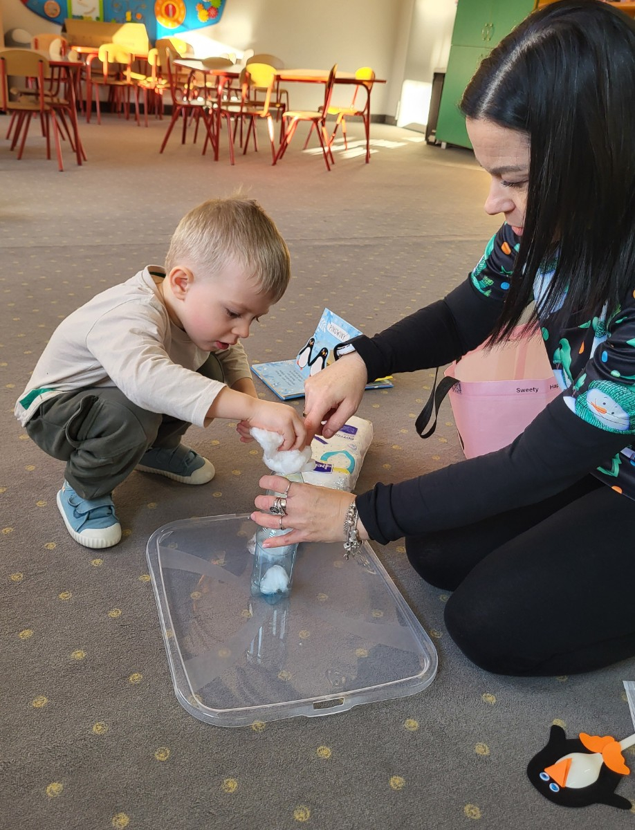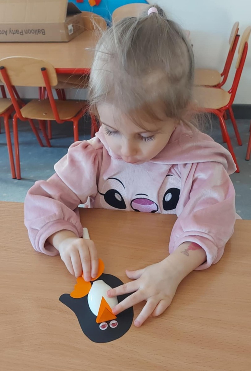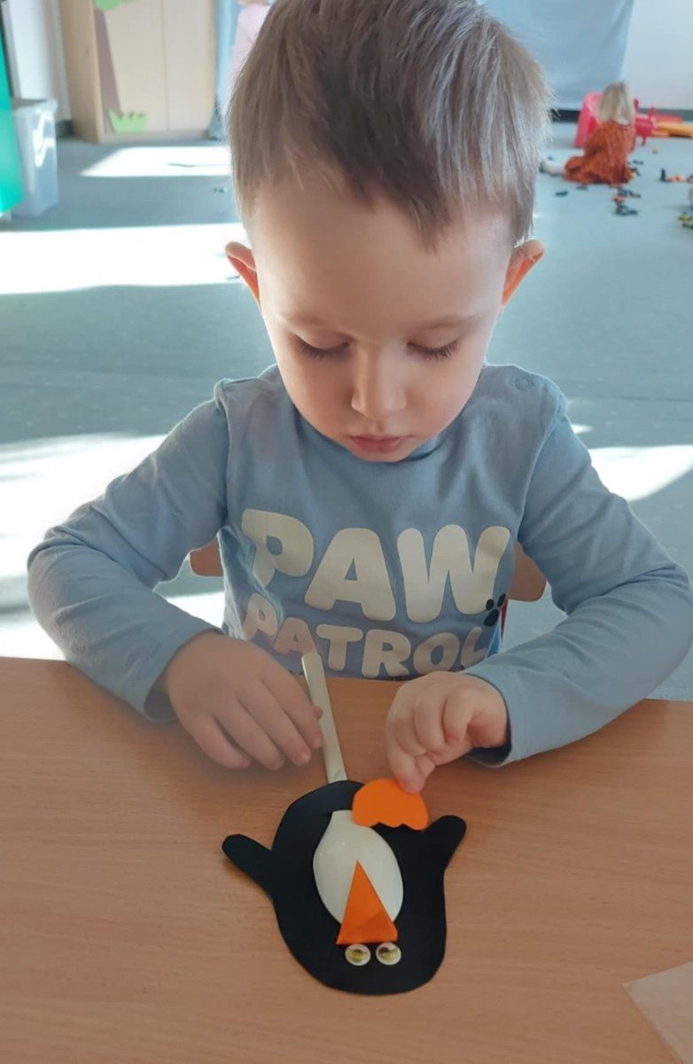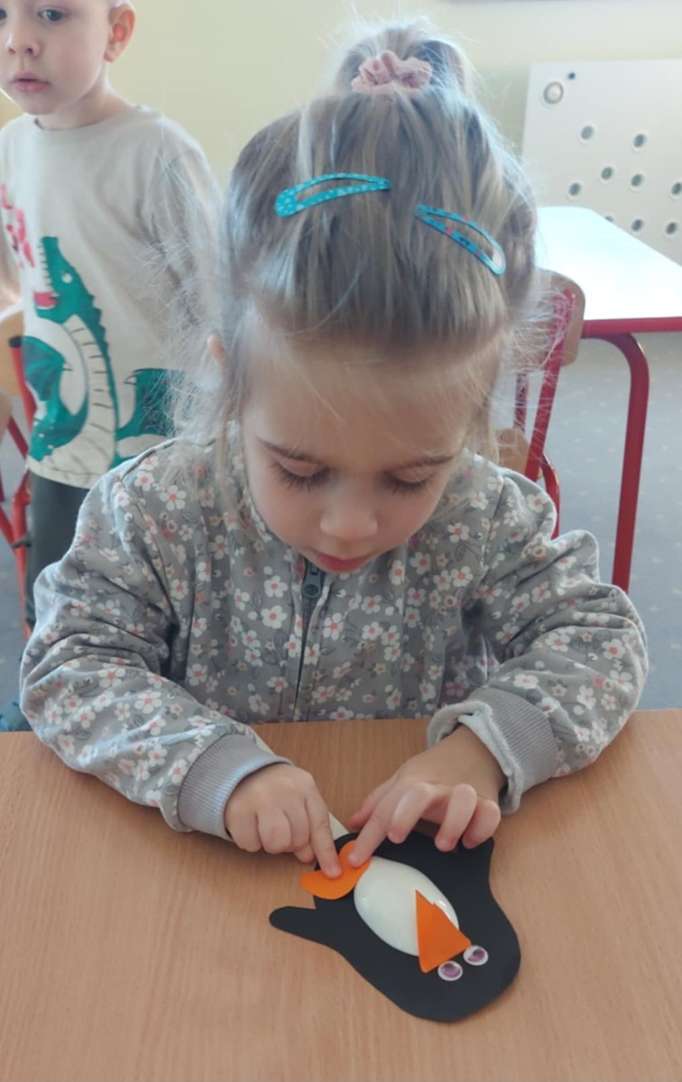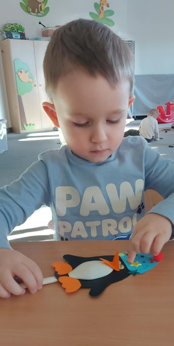 Dzień z pingwinkiem to super okazja do ćwiczenia motoryki dużej - chodzenie jak pingwin, kołysanie się na boki oraz leżenie na brzuszku i naśladowanie zjazdu z górki. Dzieci wykonały pracę plastyczną oraz pingwinka z butelki .