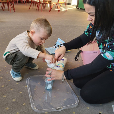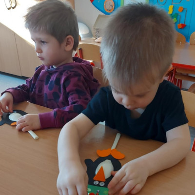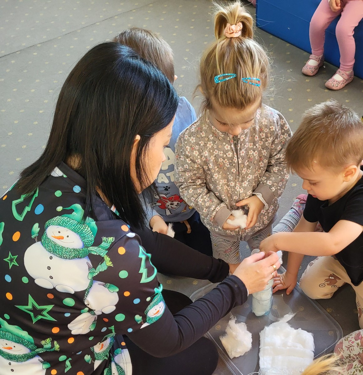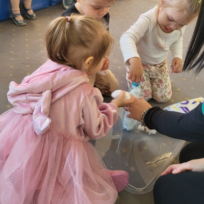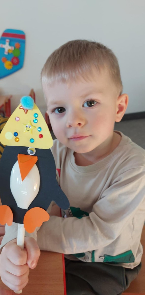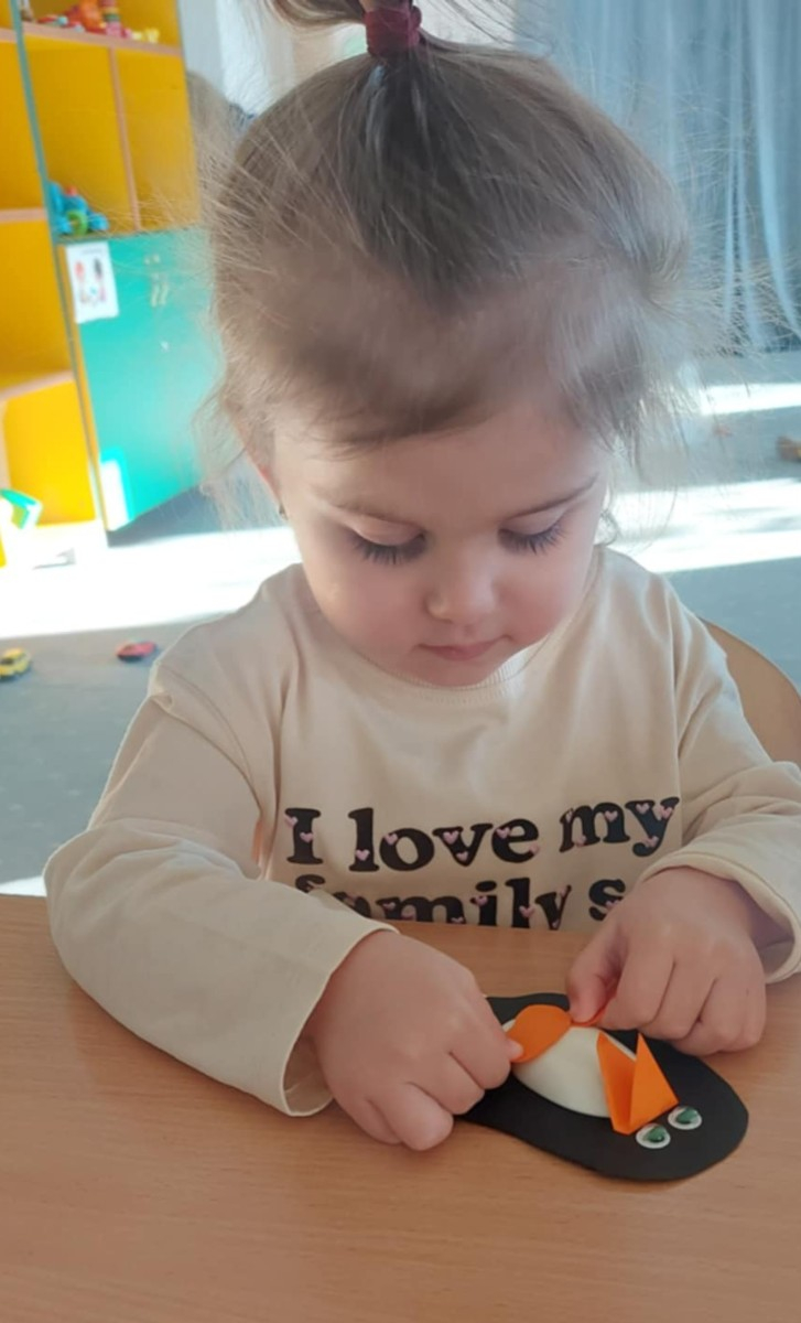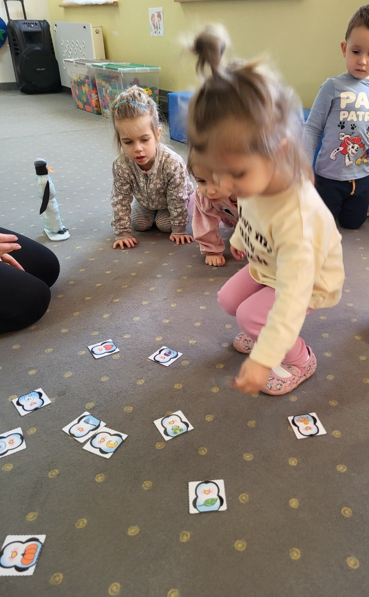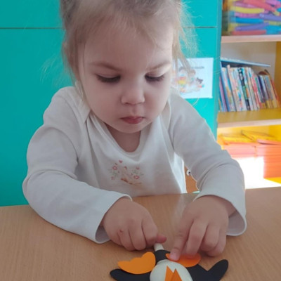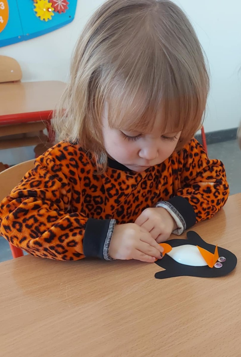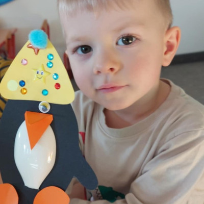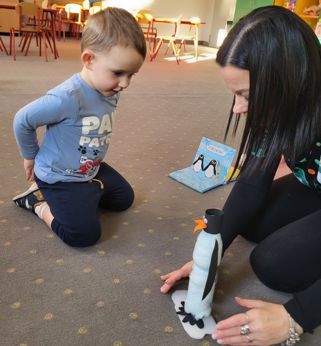 Dzień z pingwinkiem to super okazja do ćwiczenia motoryki dużej - chodzenie jak pingwin, kołysanie się na boki oraz leżenie na brzuszku i naśladowanie zjazdu z górki. Dzieci wykonały pracę plastyczną oraz pingwinka z butelki .