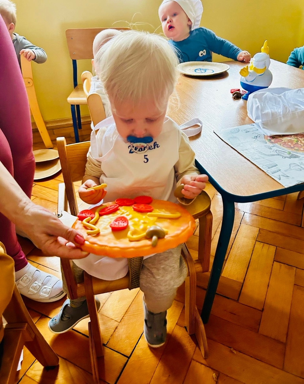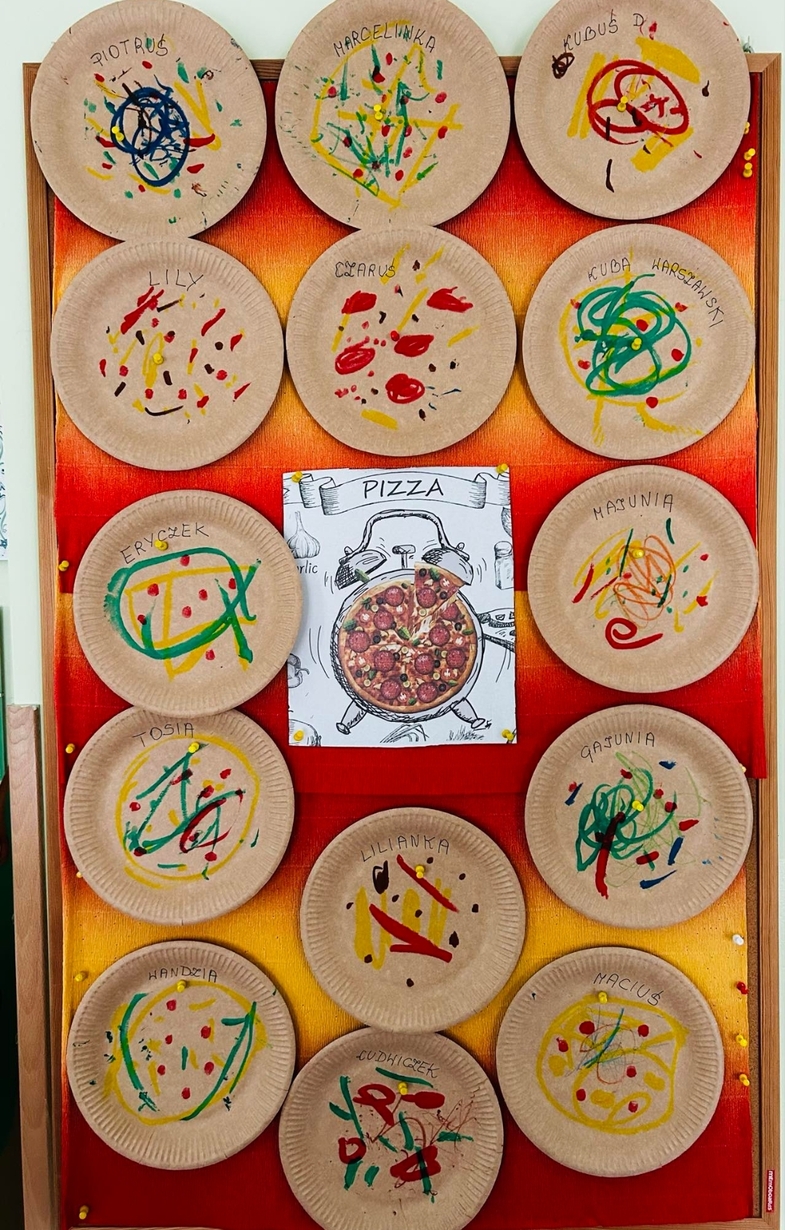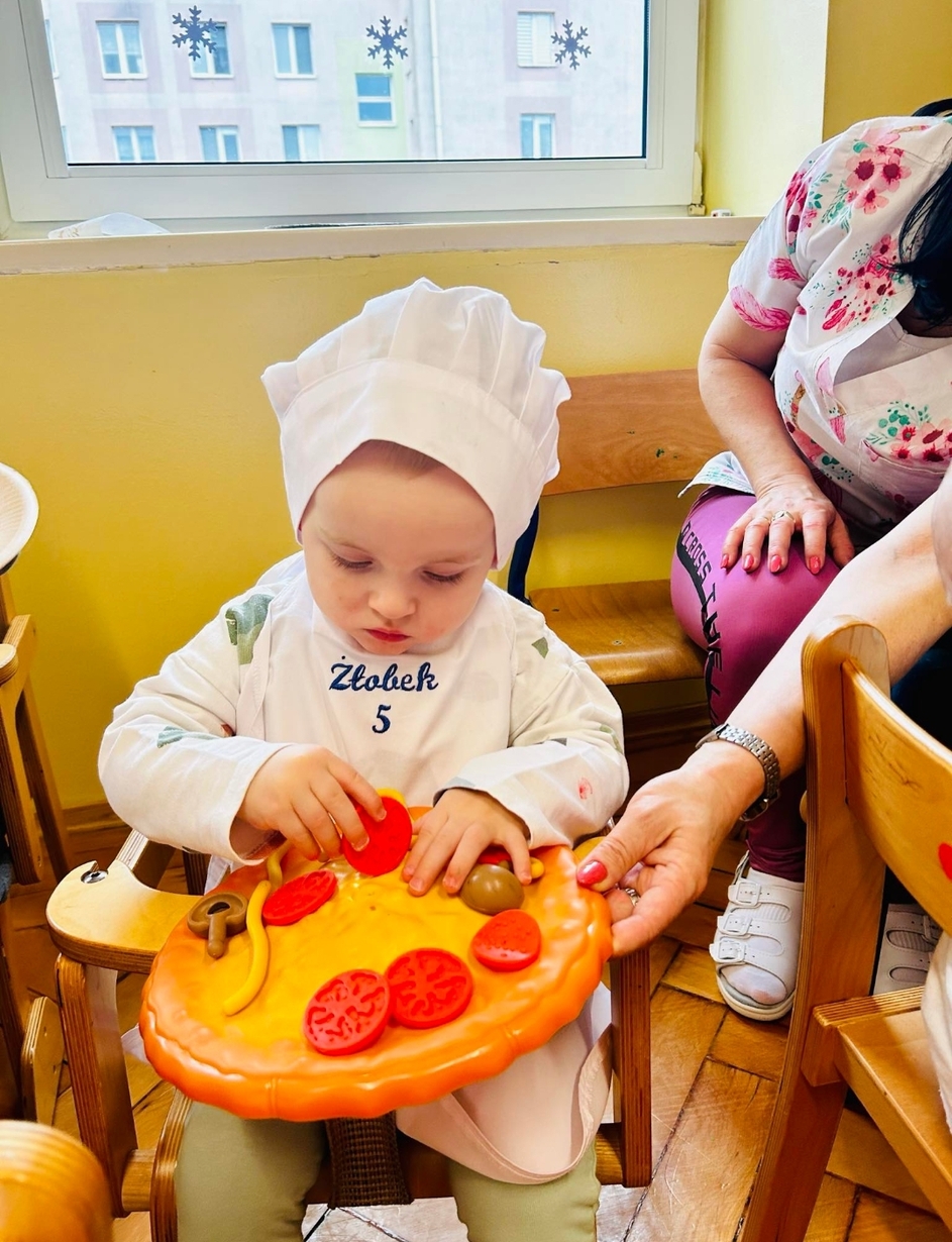 układały różne składniki ćwicząc przy tym koordynację wzrokowo - ruchową. Oczywiście tworzenie pizzy odbywało się jak na prawdziwych kucharzy
