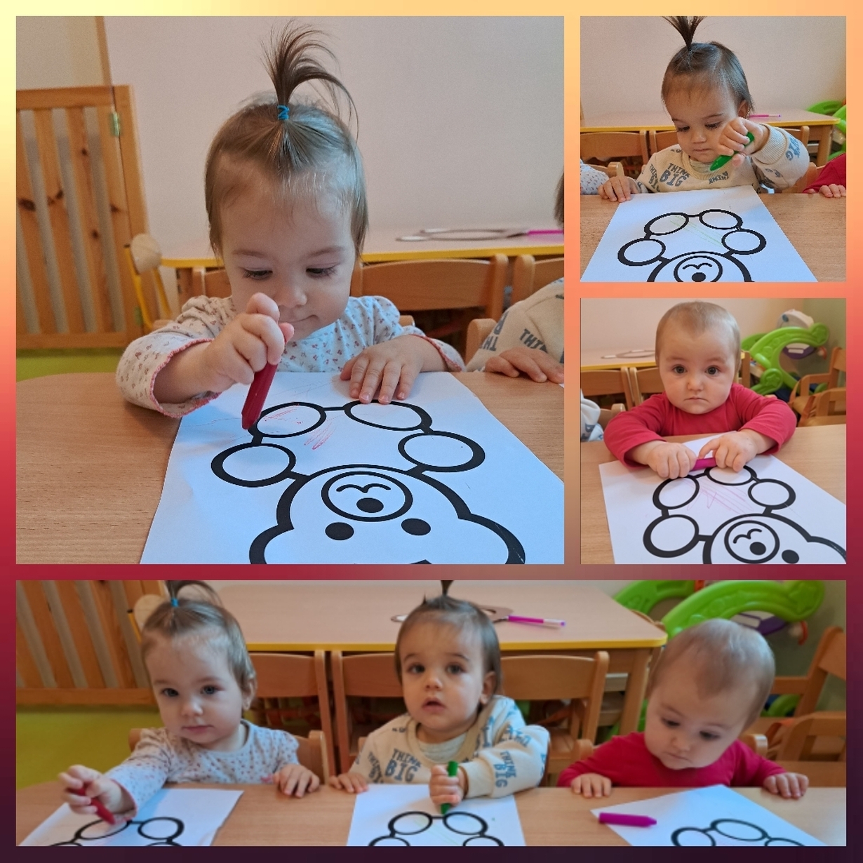 A następnie rozpoczęły swoją przygodę plastyczną kolorując misie. Dzieci uczyły się trzymać odpowiednio w dłoni kredki oraz stawiać kreski i kółeczka.