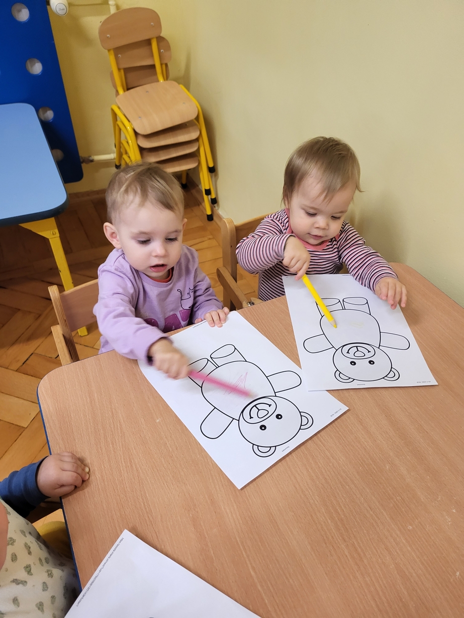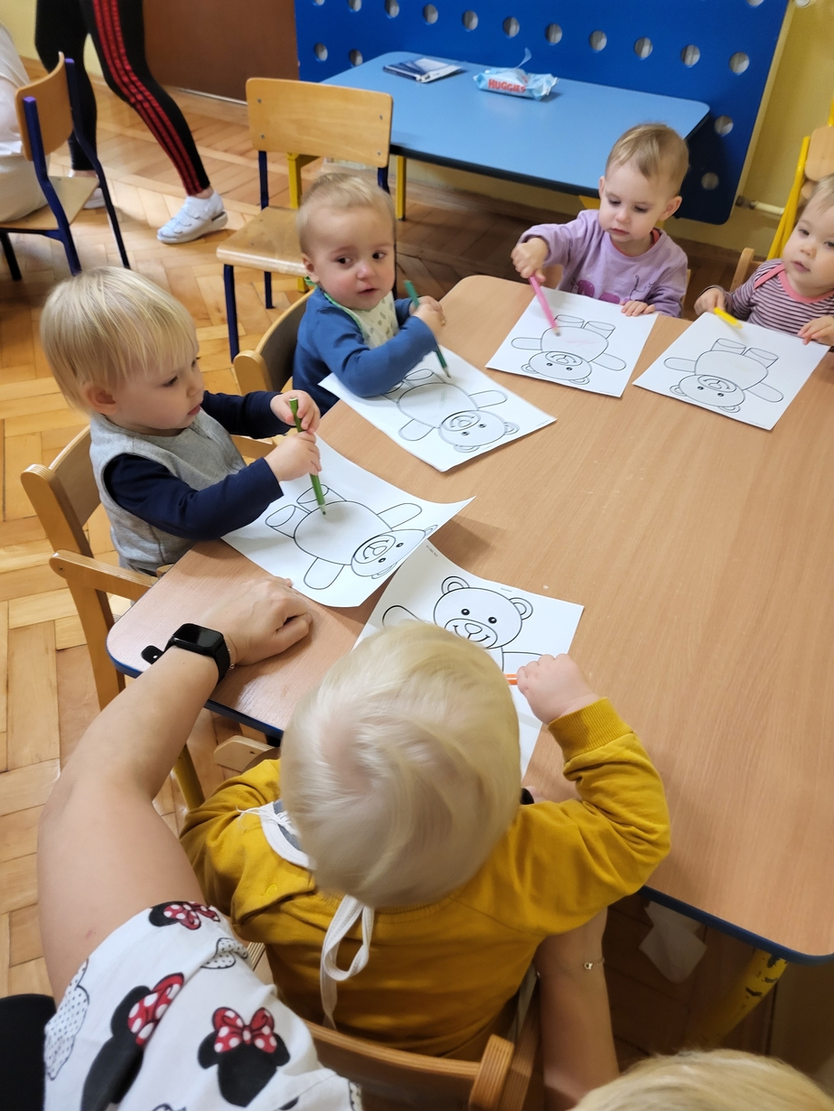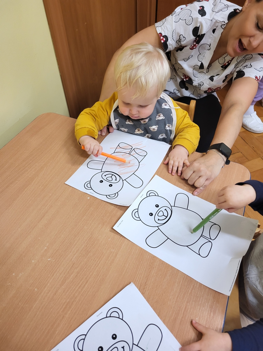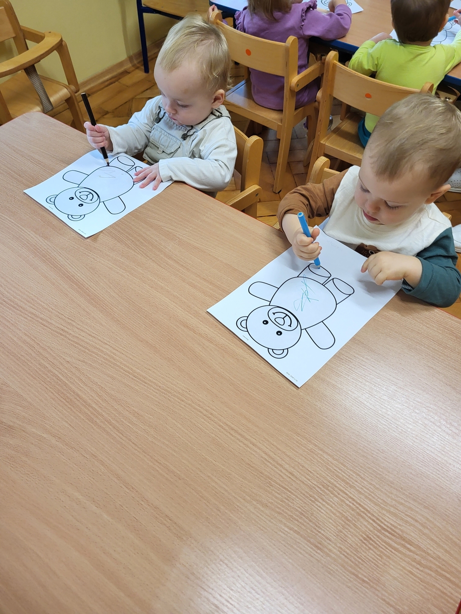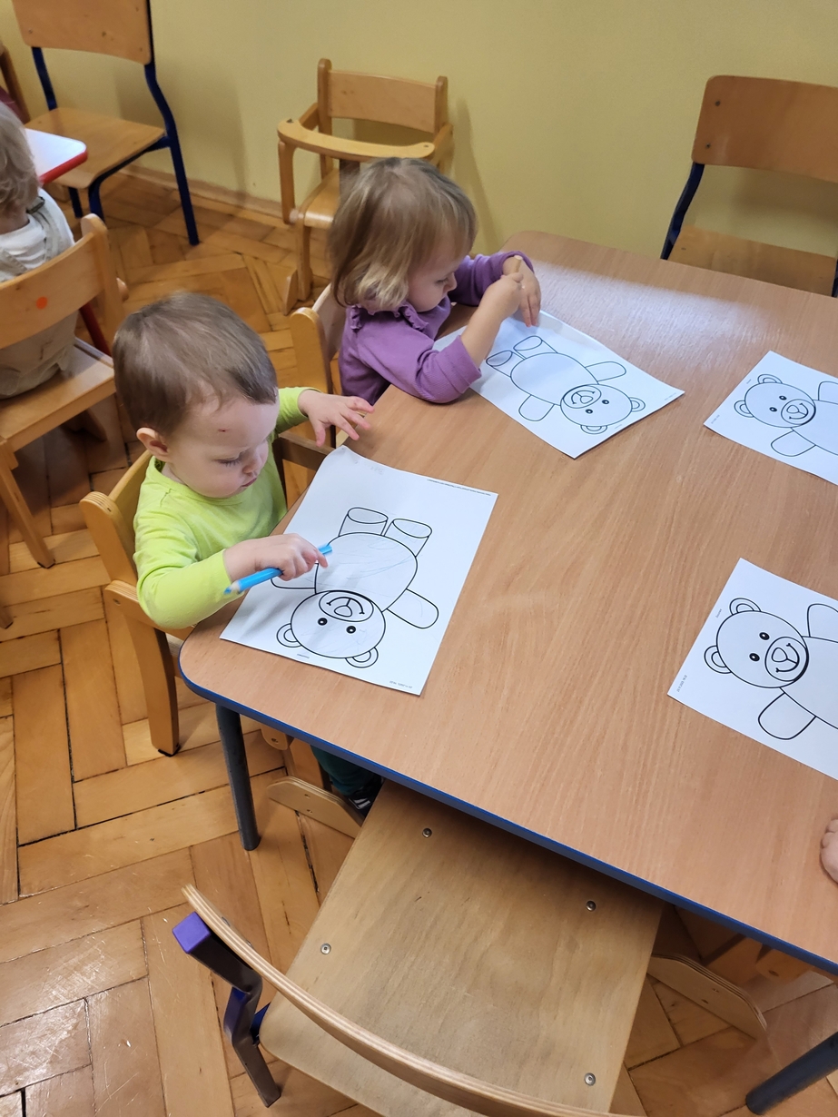Dzieci przyniosły do żłobka Swoje ukochane pluszaczki. Podczas zajęć słuchały bajeczki o Kubusiu puchatku, próbowały miodu, oraz składaliśmy Misia z kółeczek.