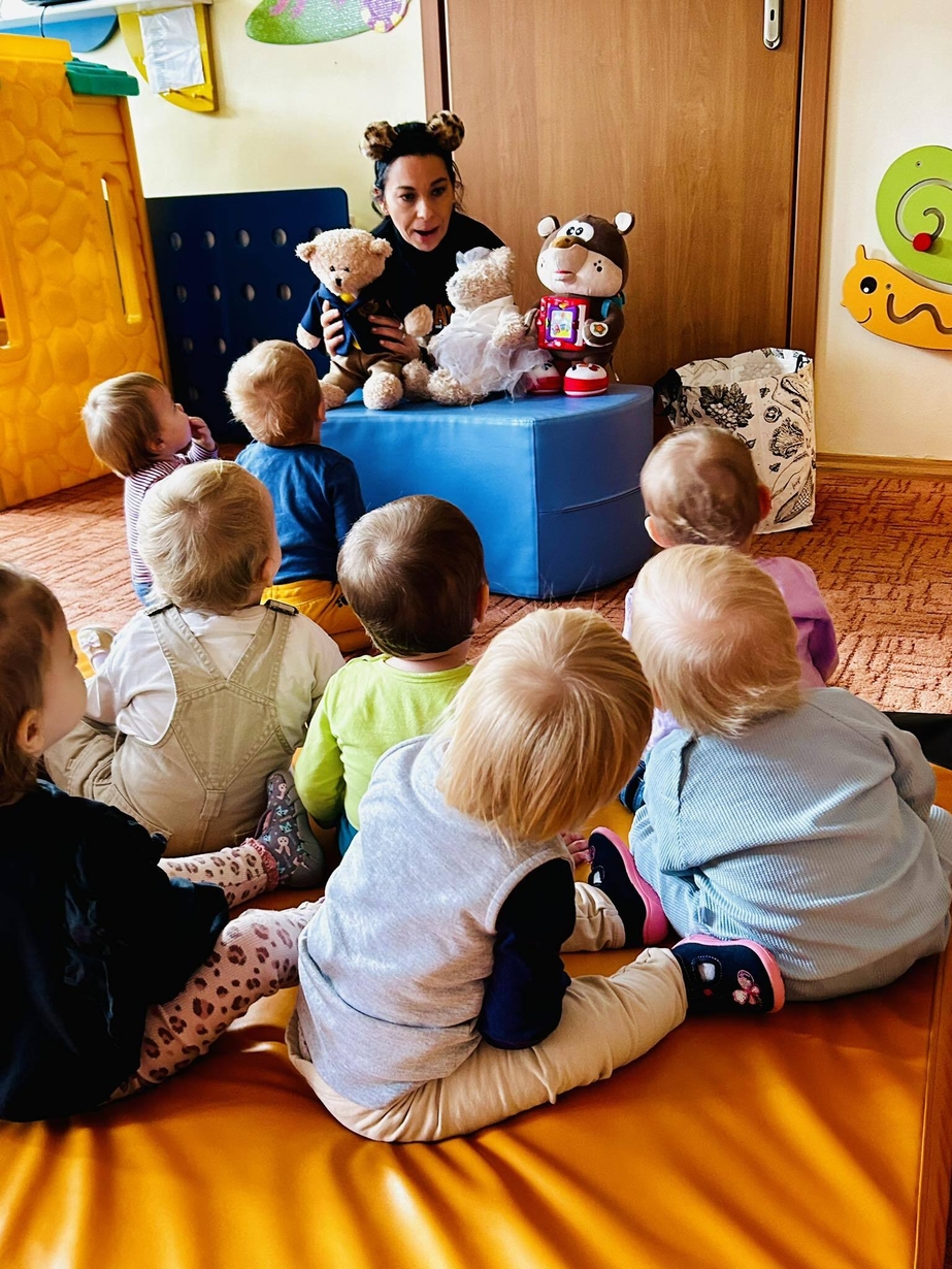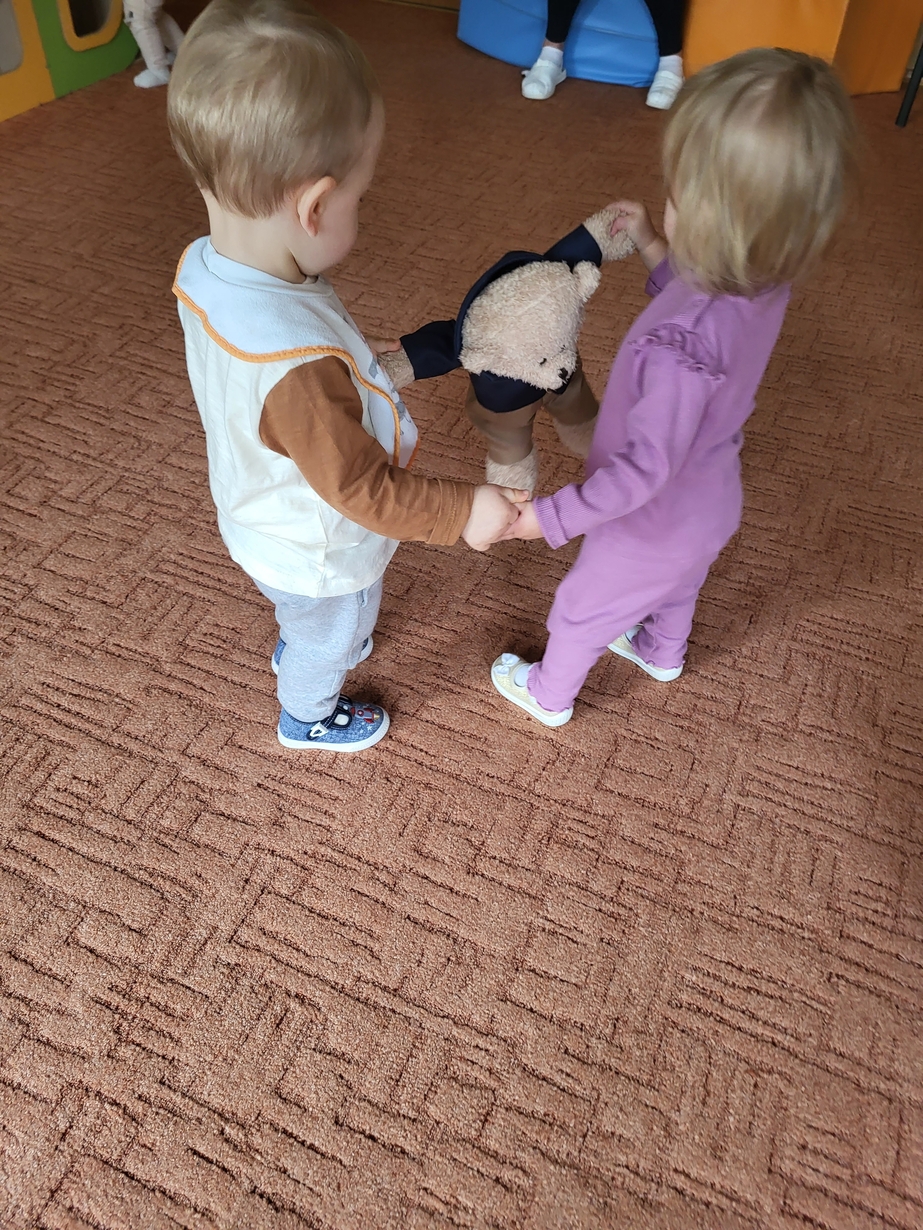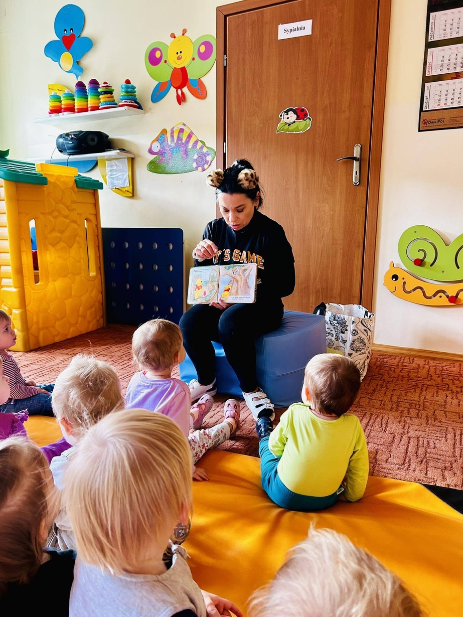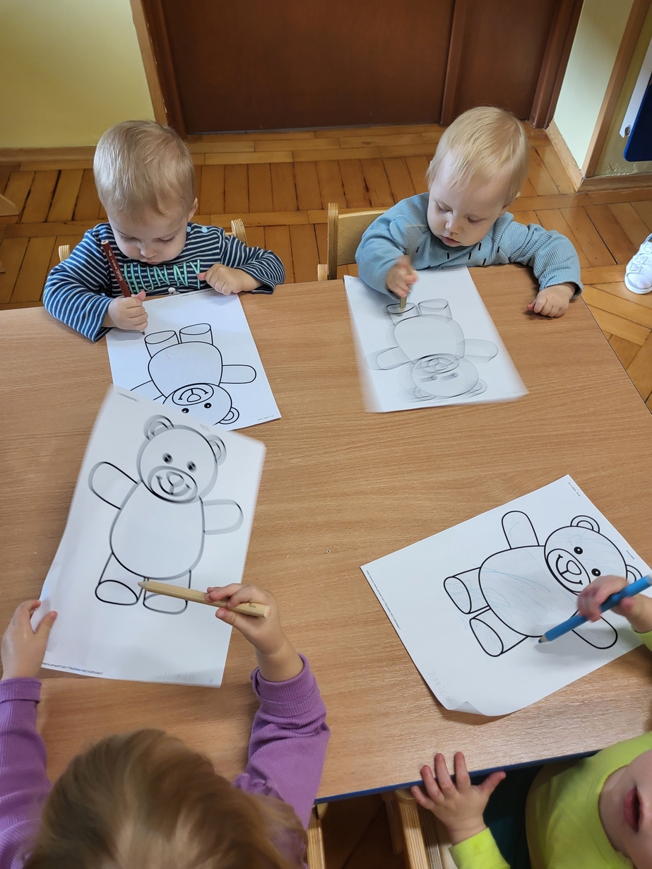 Dzieci przyniosły do żłobka Swoje ukochane pluszaczki. Podczas zajęć słuchały bajeczki o Kubusiu puchatku, próbowały miodu, oraz składaliśmy Misia z kółeczek.