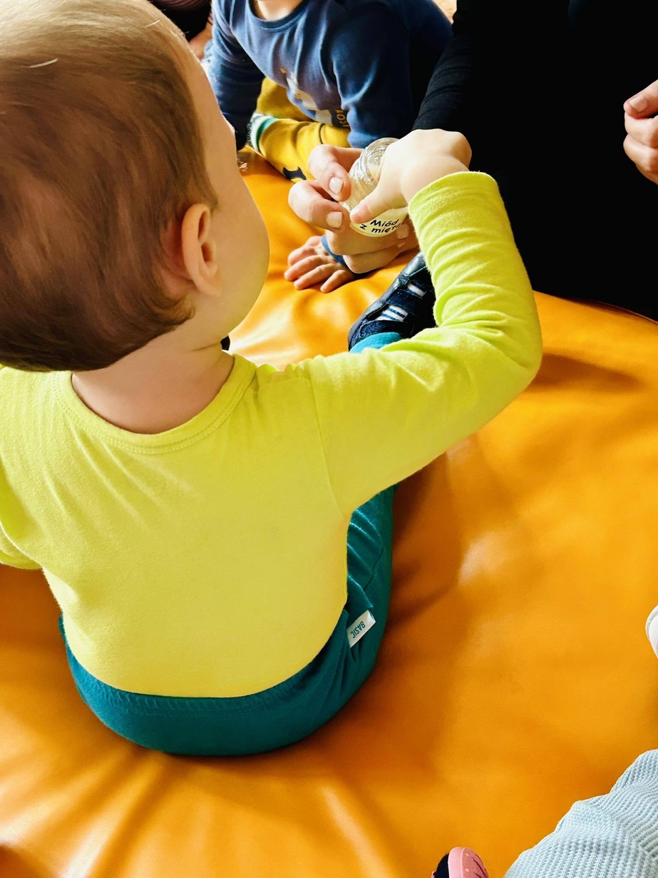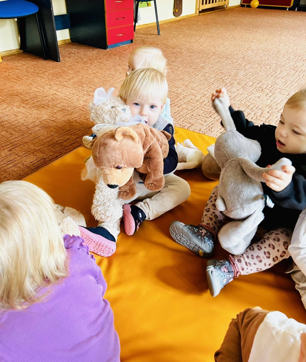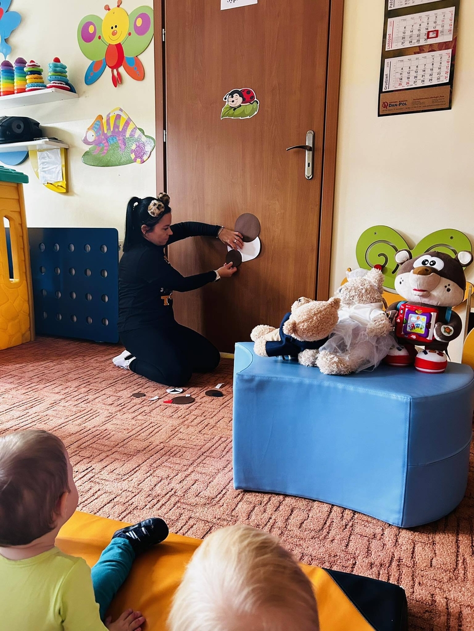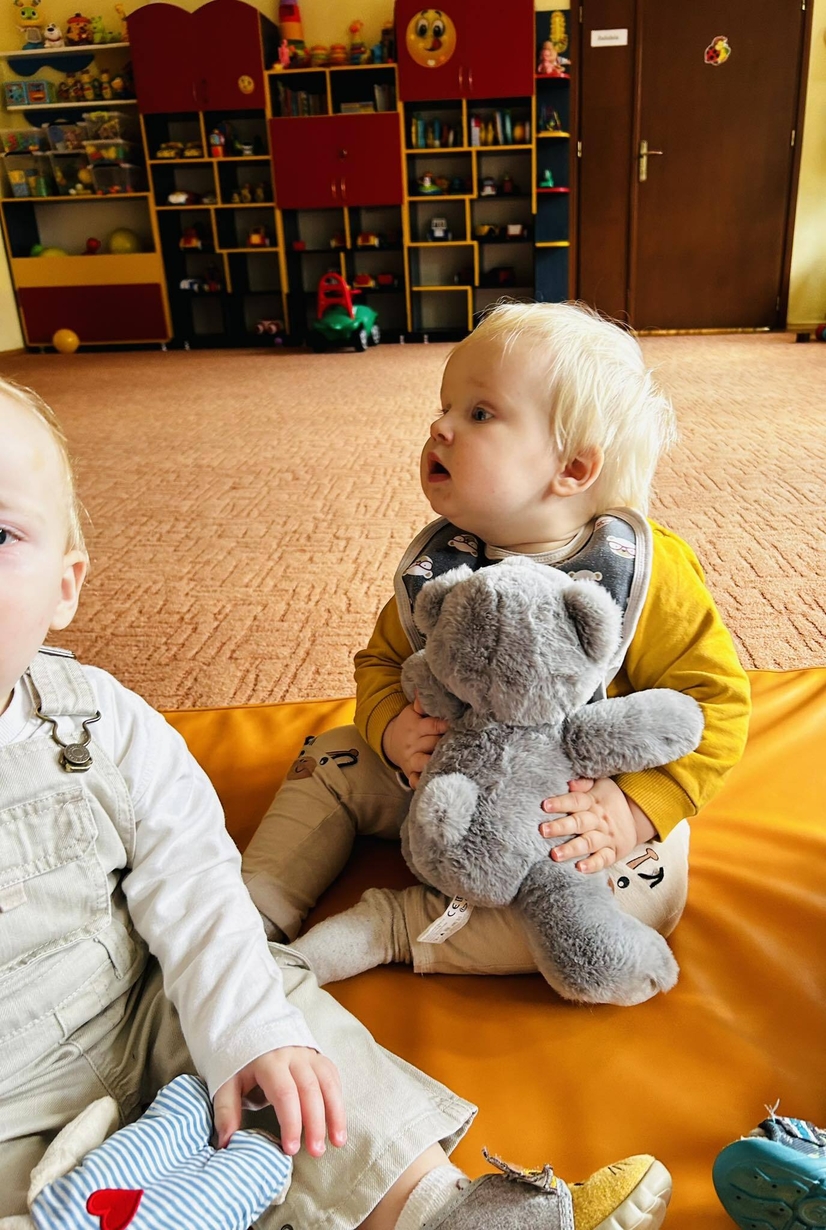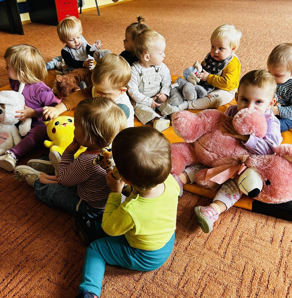 Dzieci przyniosły do żłobka Swoje ukochane pluszaczki. Podczas zajęć słuchały bajeczki o Kubusiu puchatku, próbowały miodu, oraz składaliśmy Misia z kółeczek.
