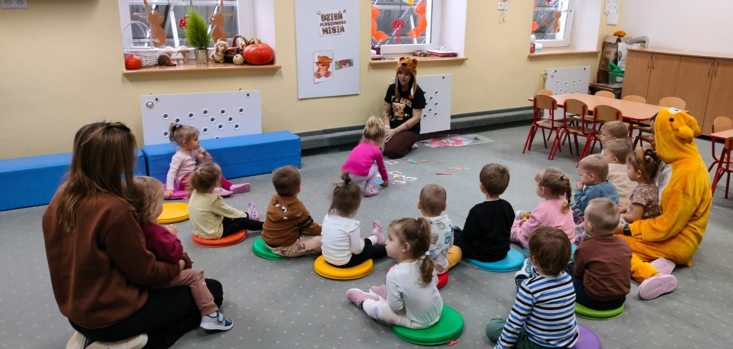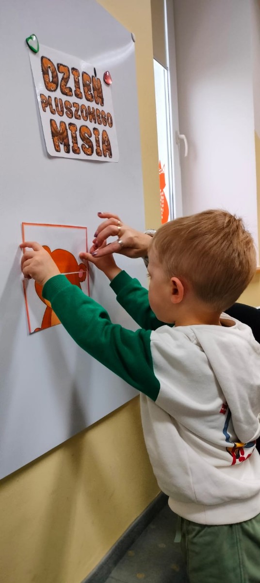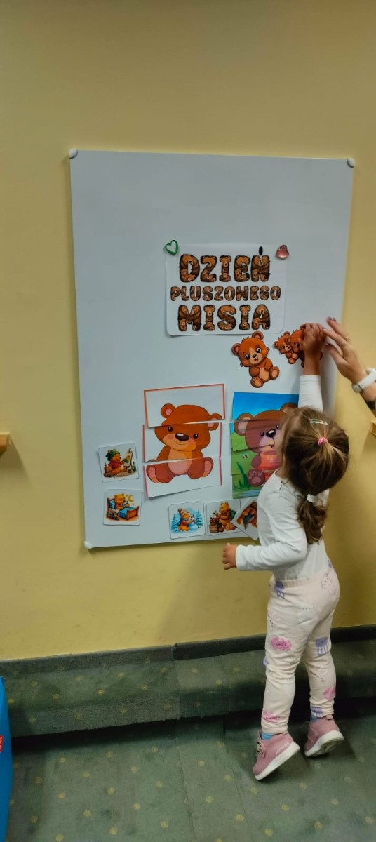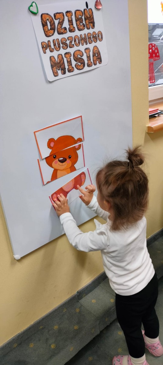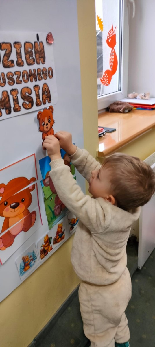DZIEŃ PLUSZOWEGO MISIA" to radosne święto,podczas którego maluchy przynoszą swoje ulubione misie. Dzieci brały udział w zabawach ruchowych i muzycznych, układały puzzle oraz śpiewały piosenkę o misiu.