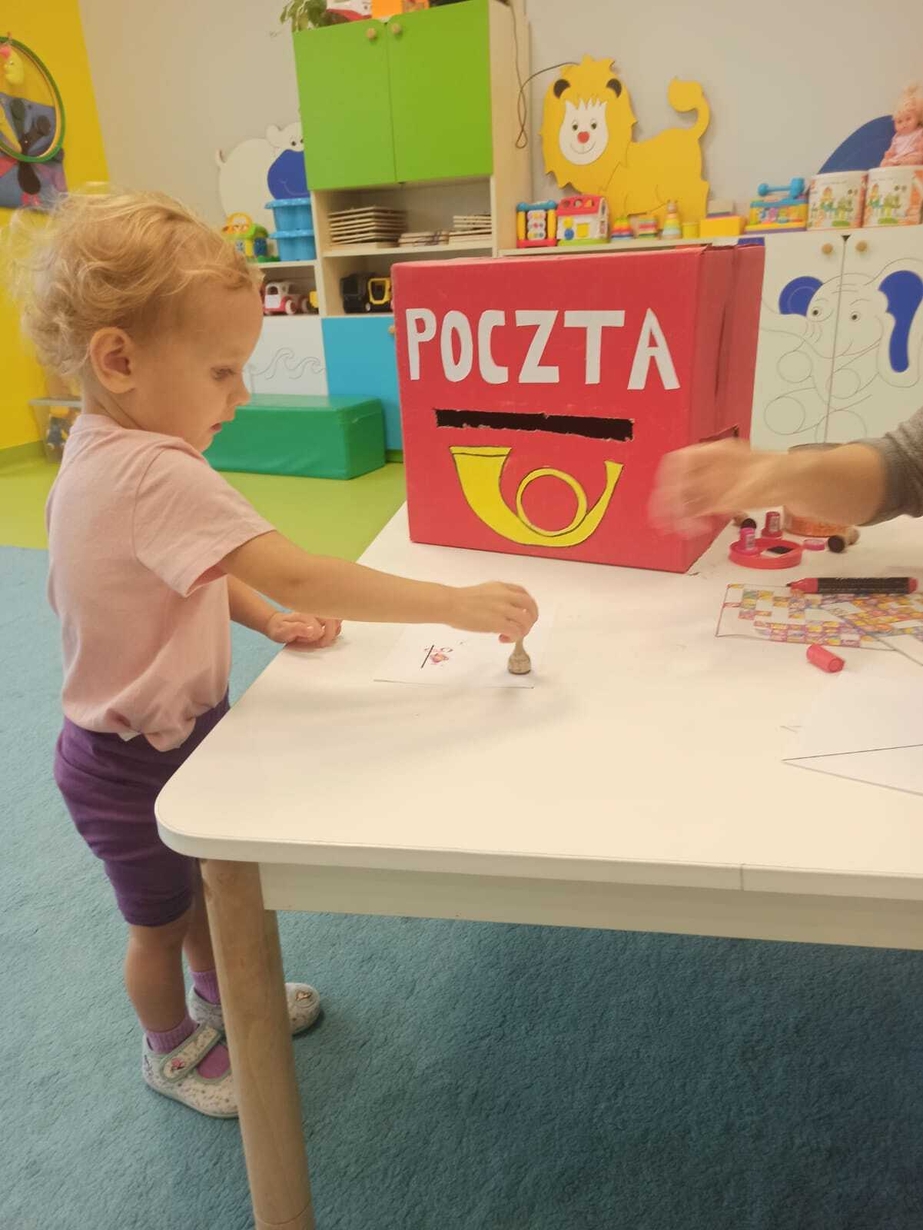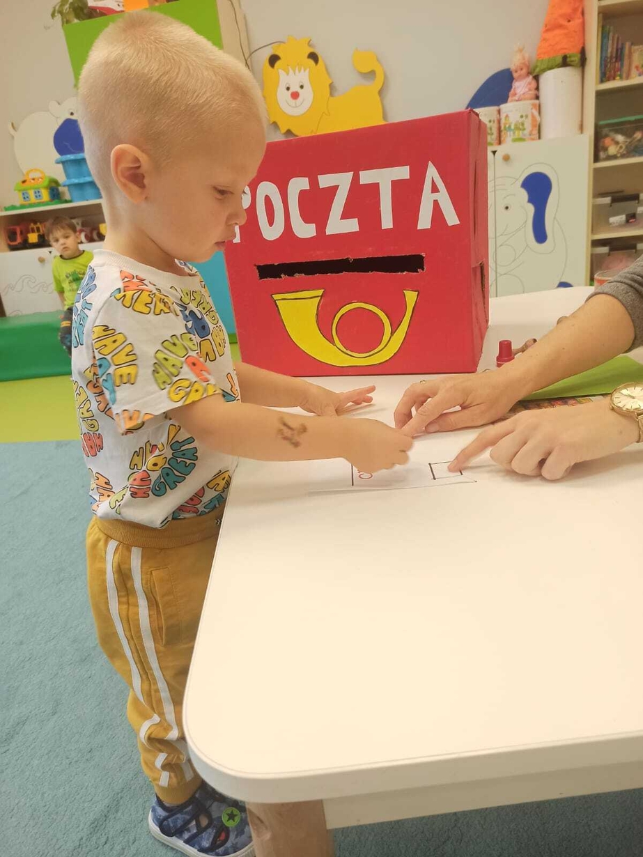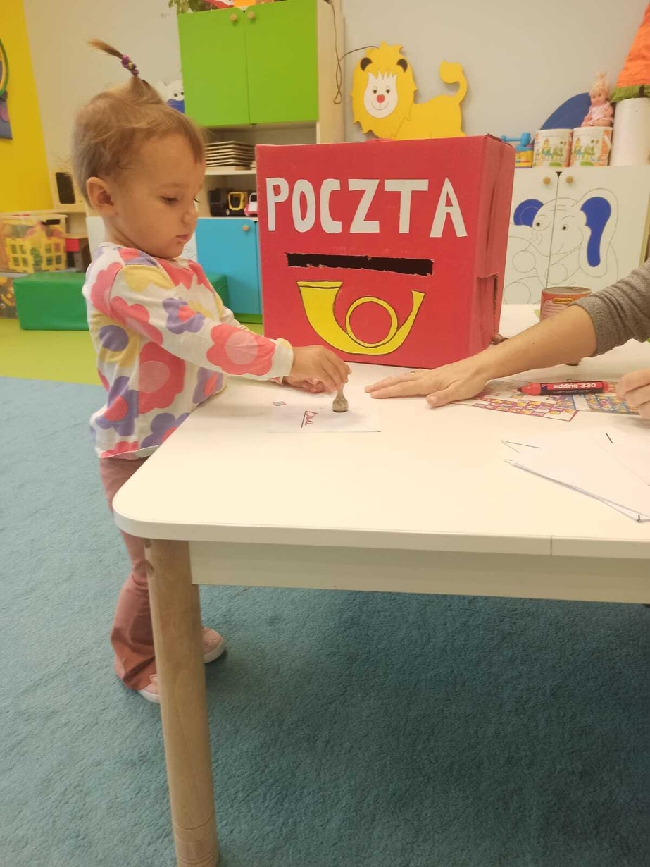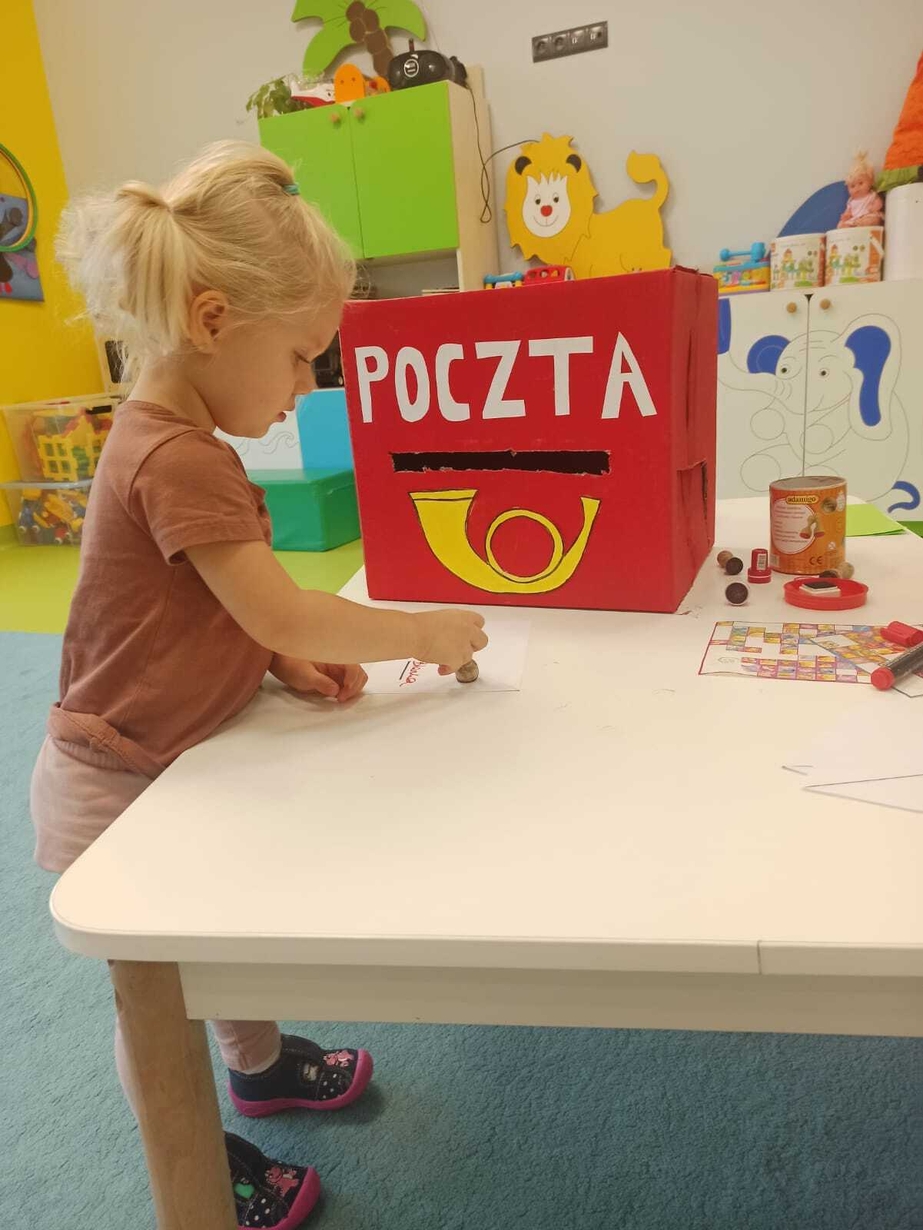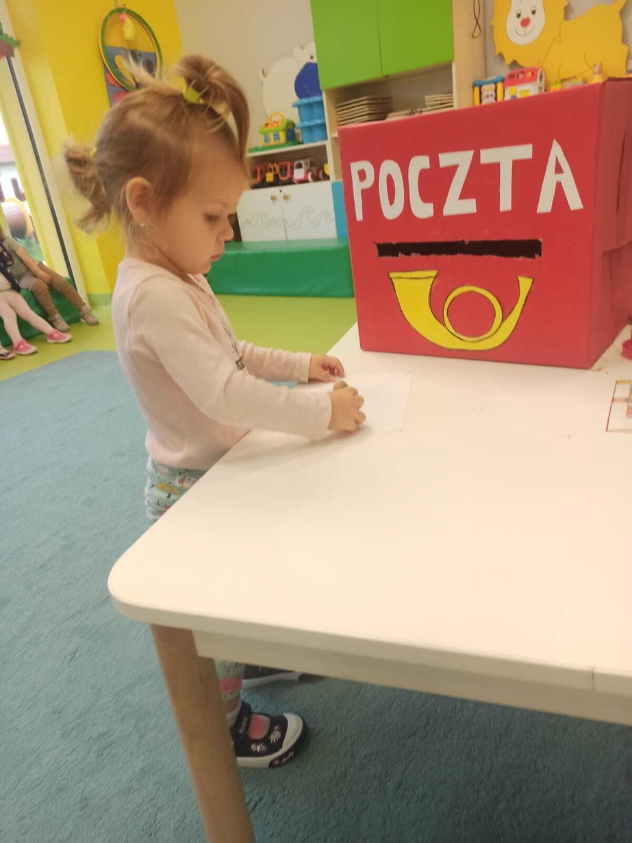 Podczas zajęć dydaktycznych dzieci zapoznały się ze specyfiką pracy listonosza, jego obowiązkami oraz dowiedziały się czym zajmuje się poczta. Każde z dzieci miało okazję przykleić znaczek i przybić stempel na kopertę, a następnie włożyć go do skrzynki pocztowej.