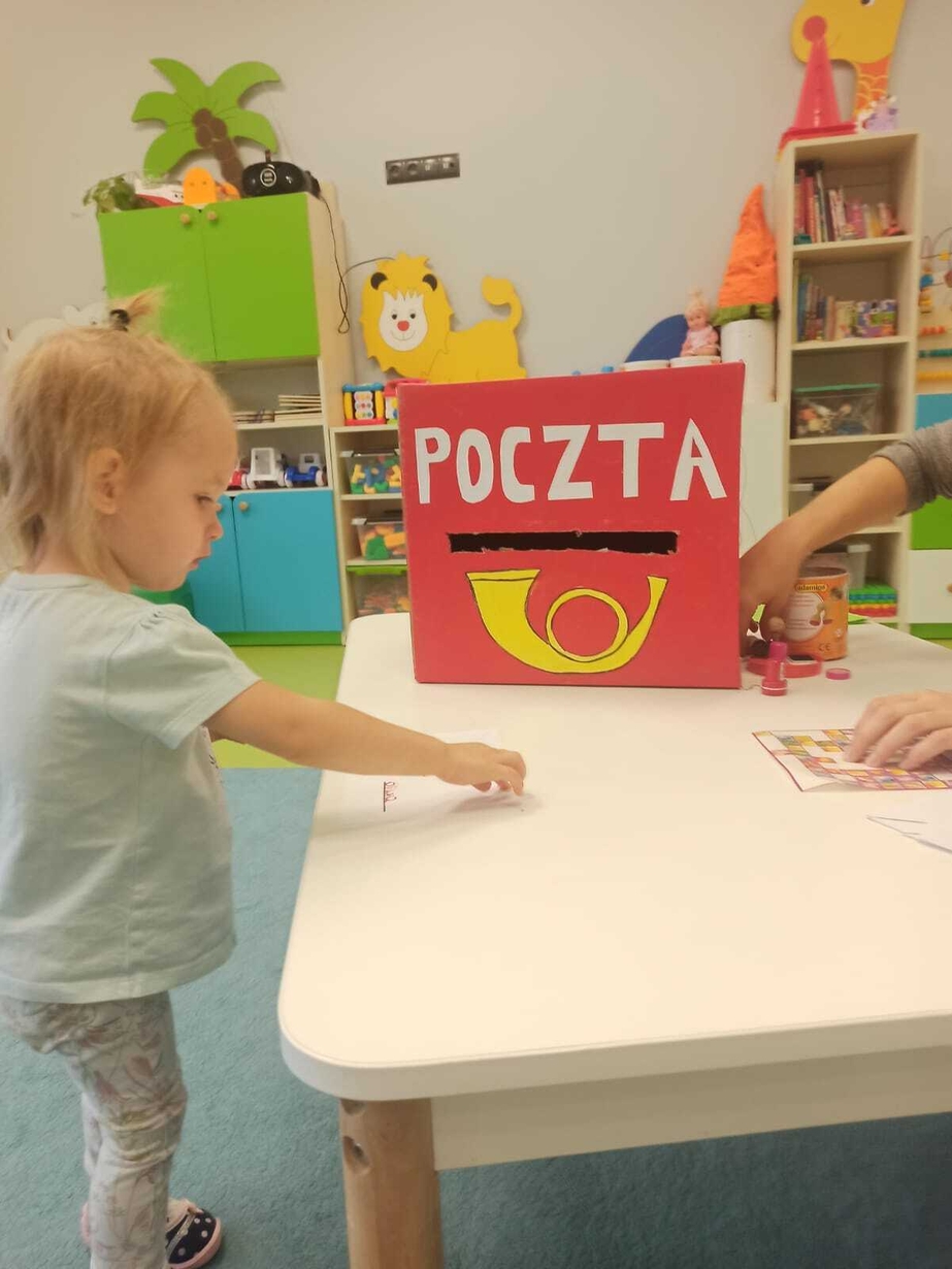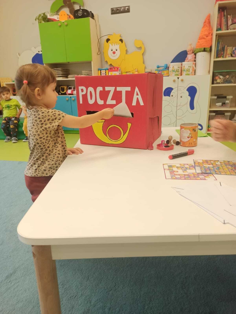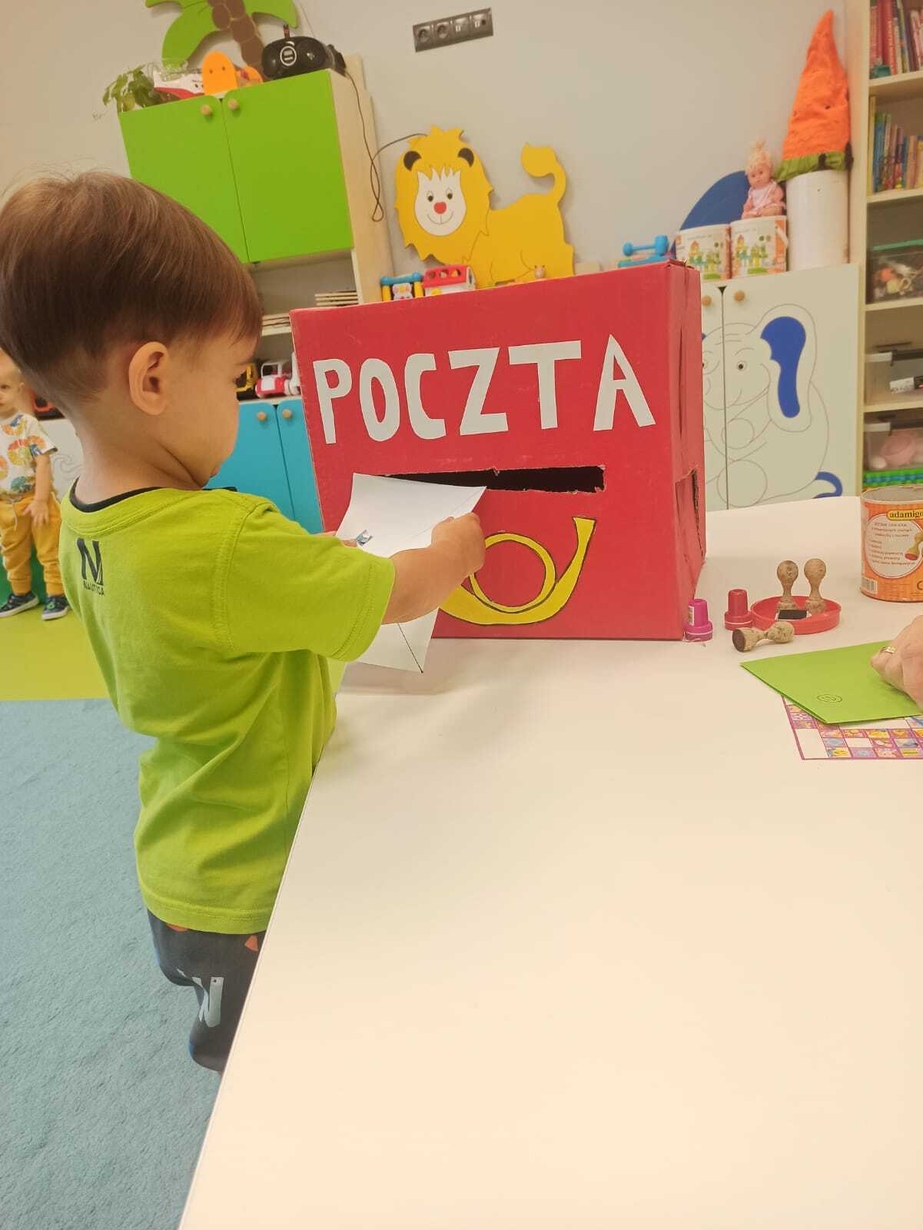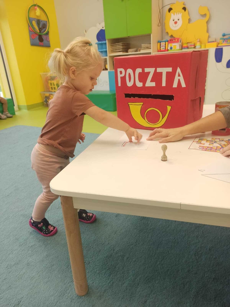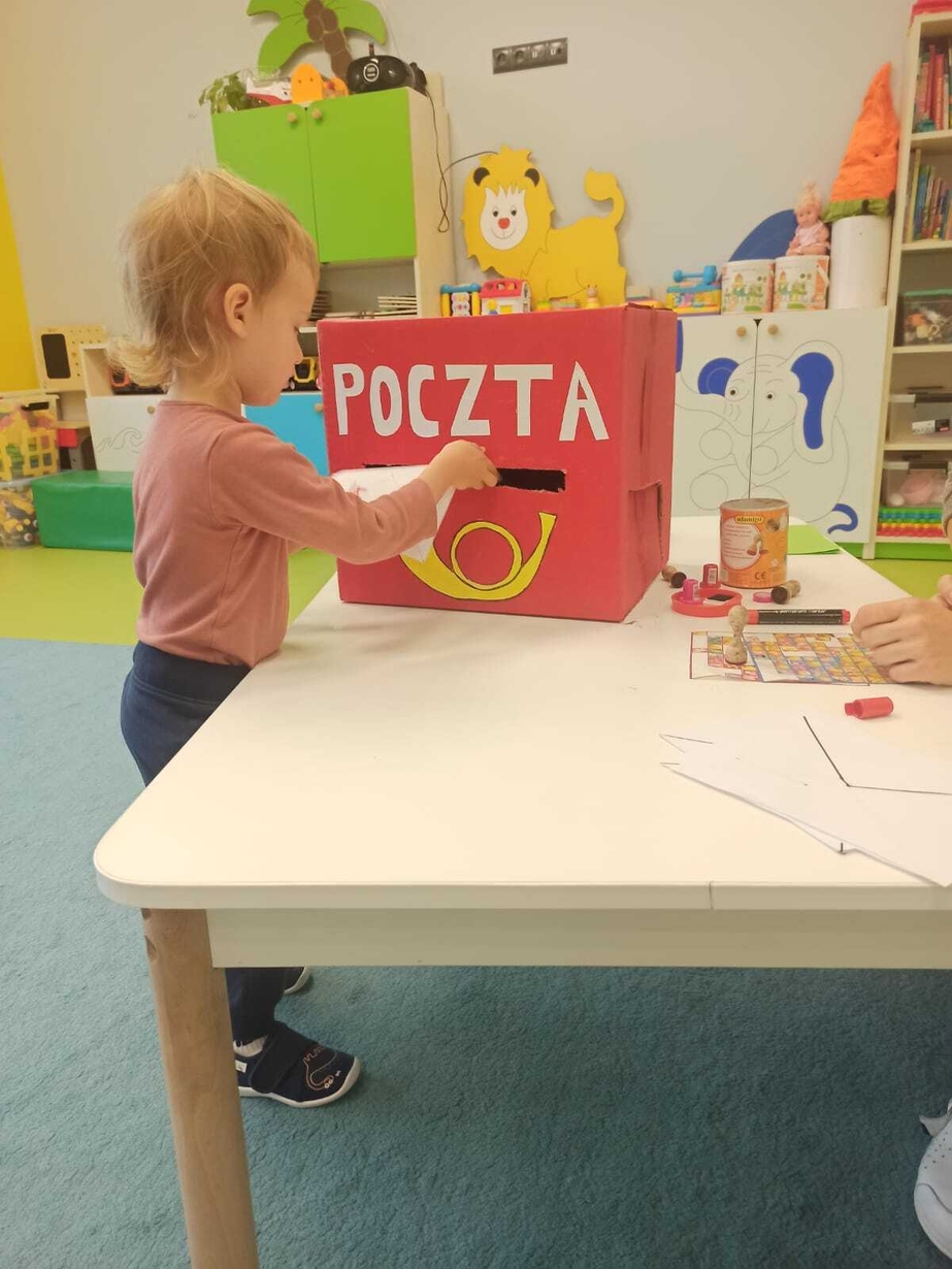 Podczas zajęć dydaktycznych dzieci zapoznały się ze specyfiką pracy listonosza, jego obowiązkami oraz dowiedziały się czym zajmuje się poczta. Każde z dzieci miało okazję przykleić znaczek i przybić stempel na kopertę, a następnie włożyć go do skrzynki pocztowej.