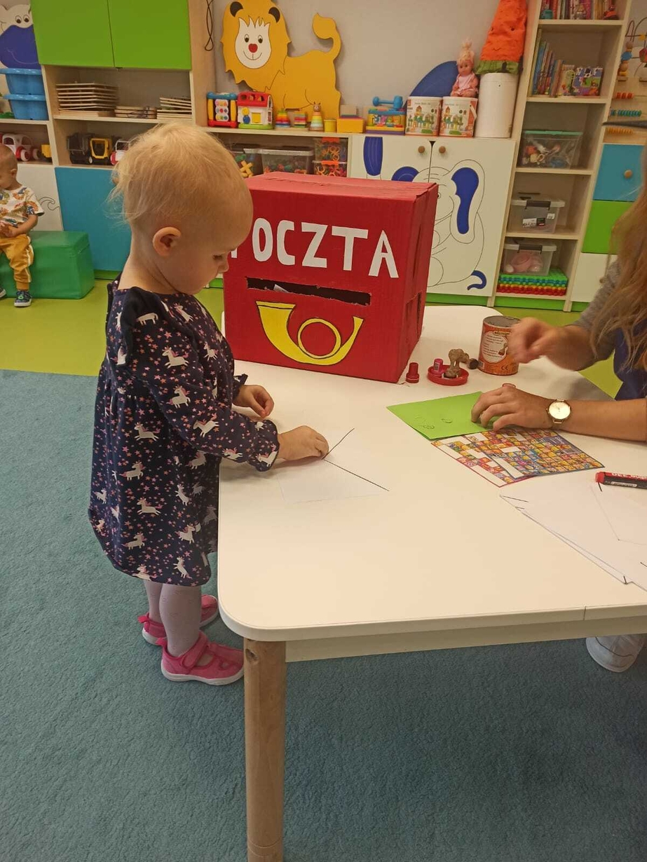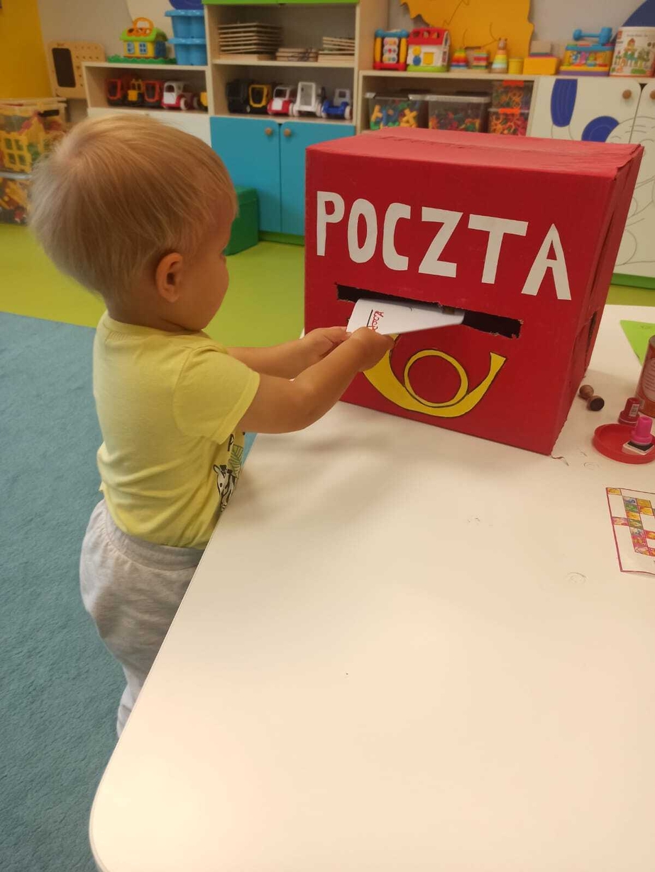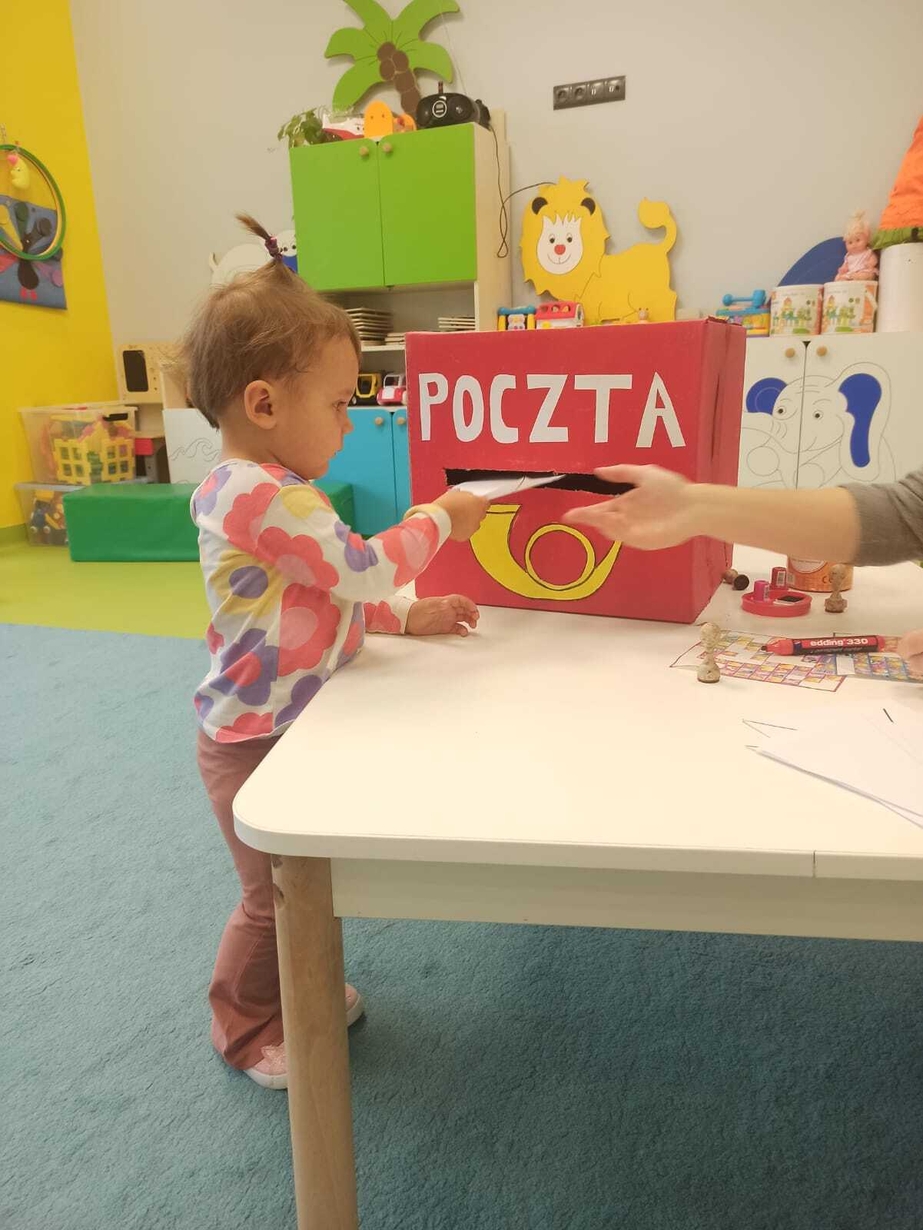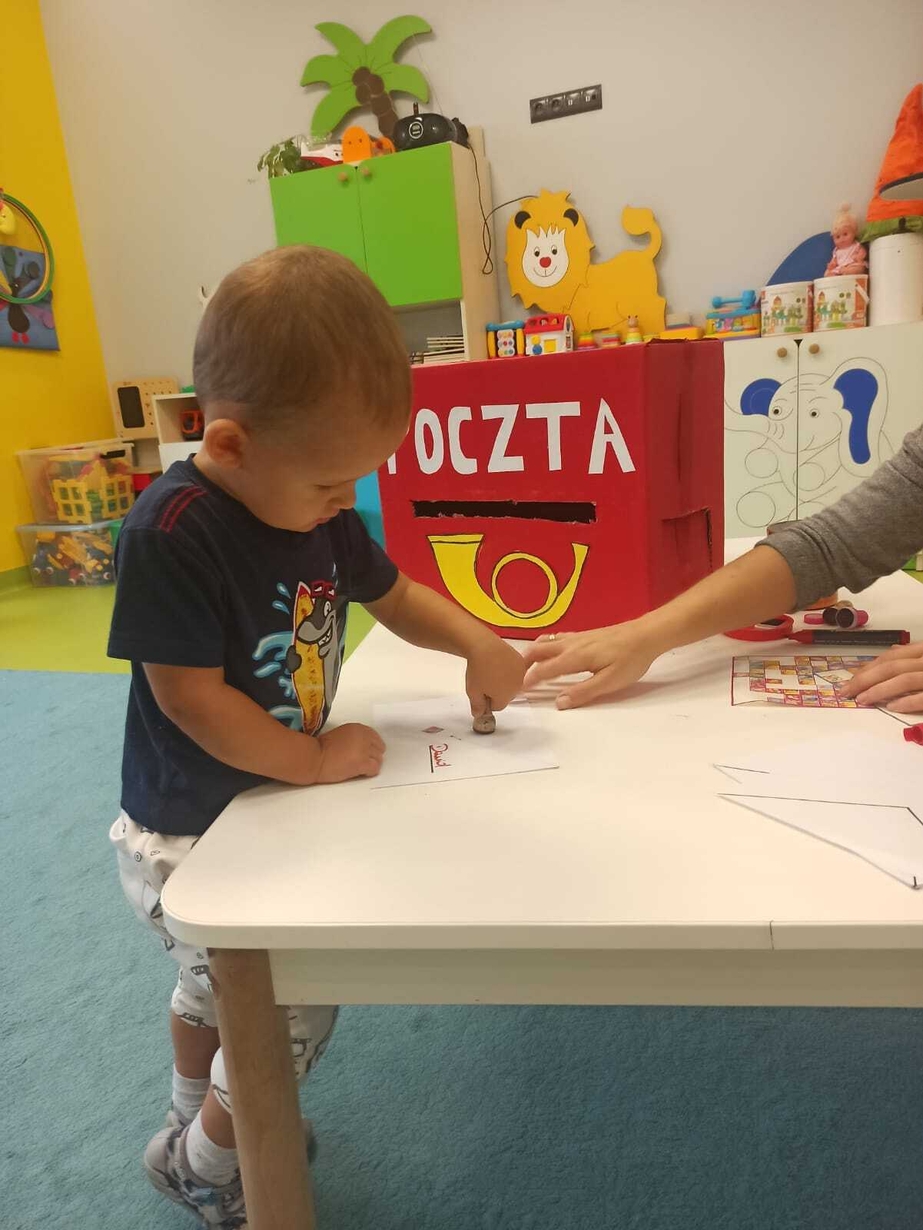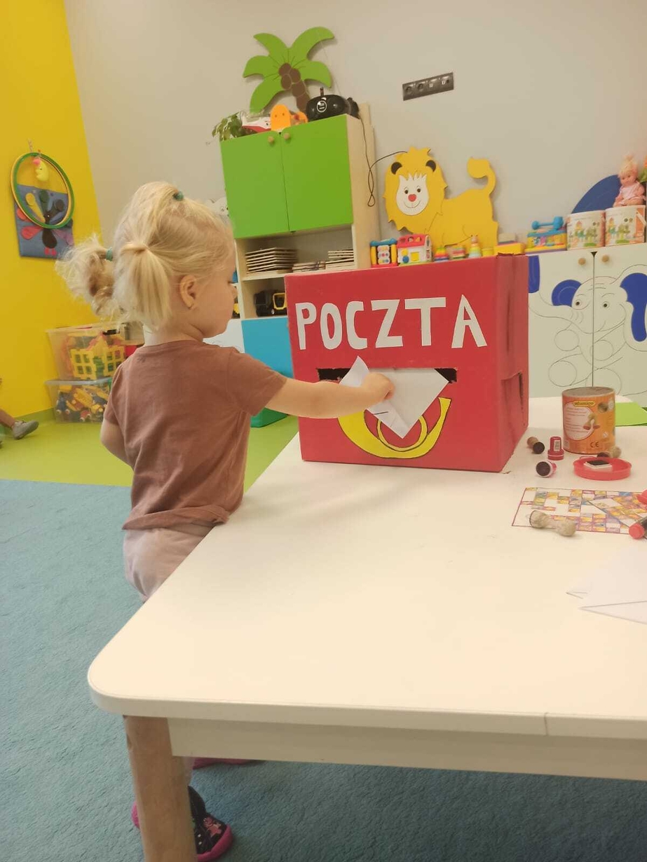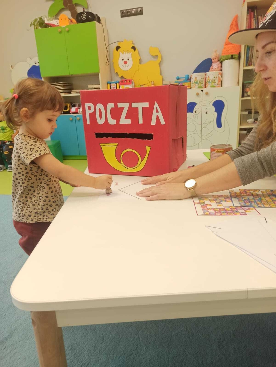 Podczas zajęć dydaktycznych dzieci zapoznały się ze specyfiką pracy listonosza, jego obowiązkami oraz dowiedziały się czym zajmuje się poczta. Każde z dzieci miało okazję przykleić znaczek i przybić stempel na kopertę, a następnie włożyć go do skrzynki pocztowej.