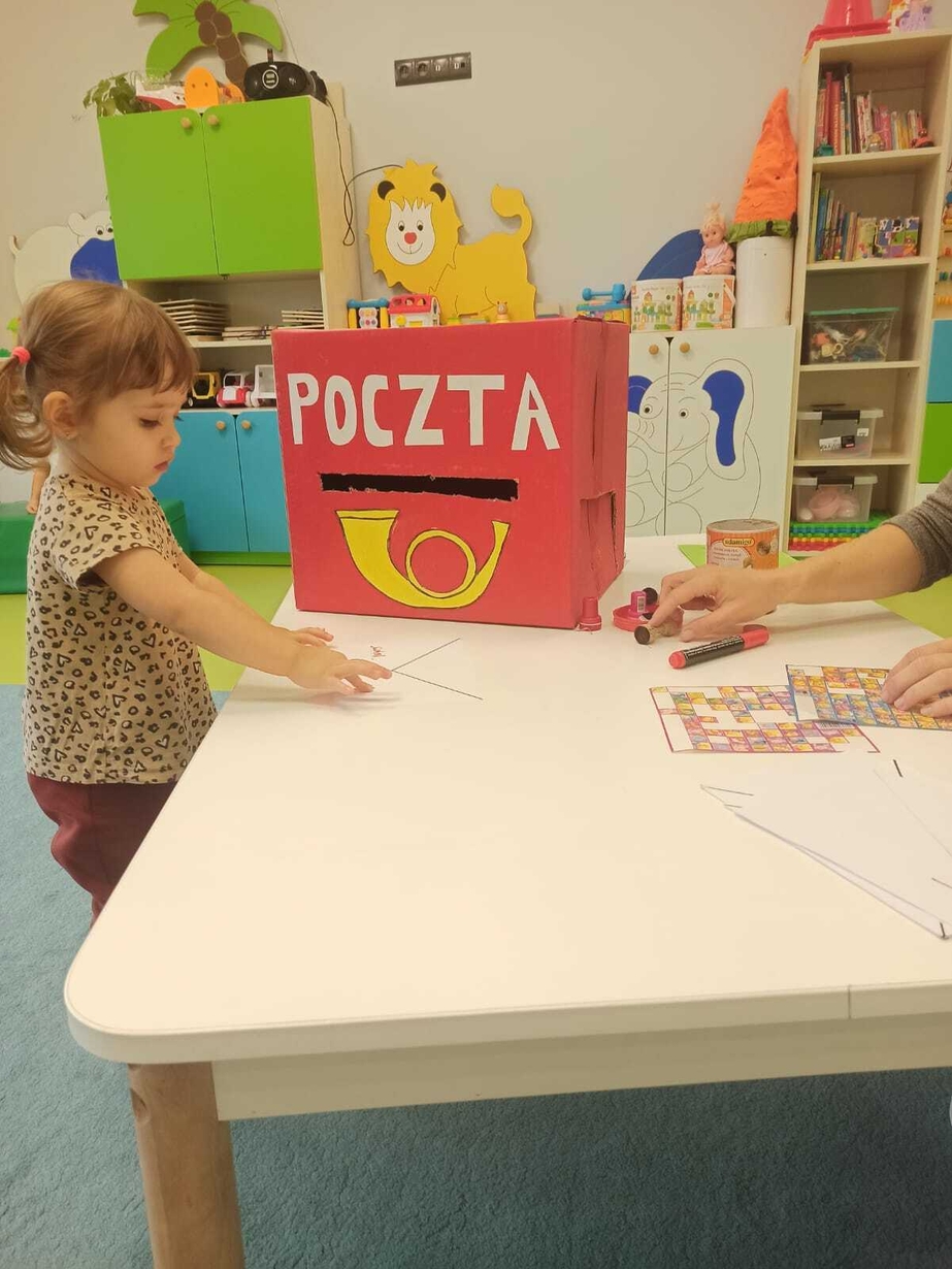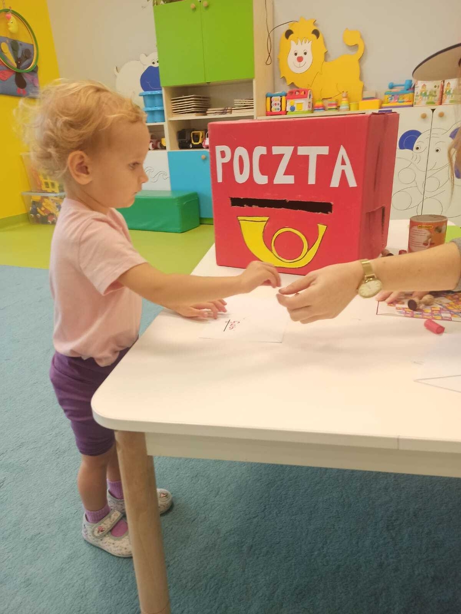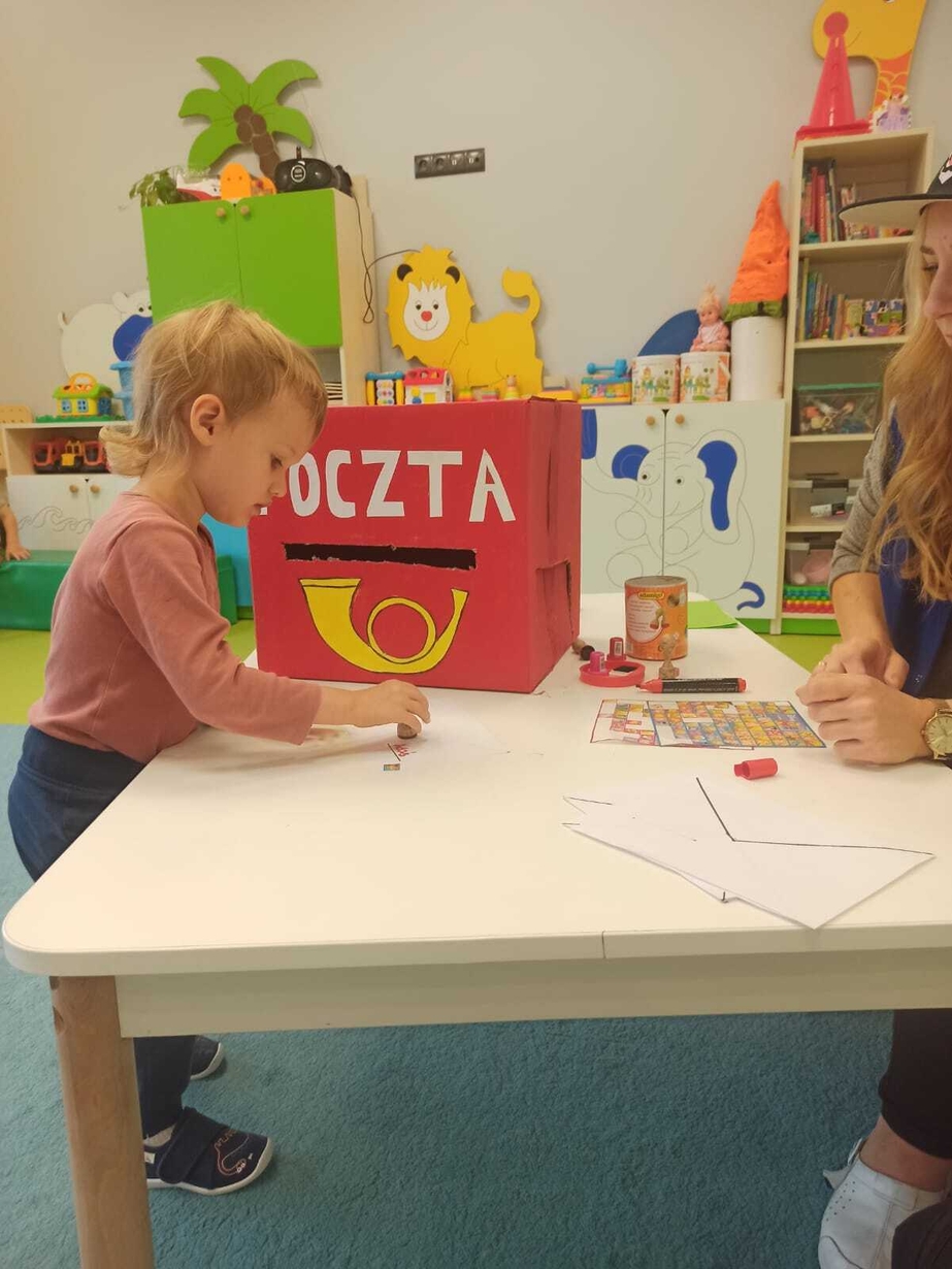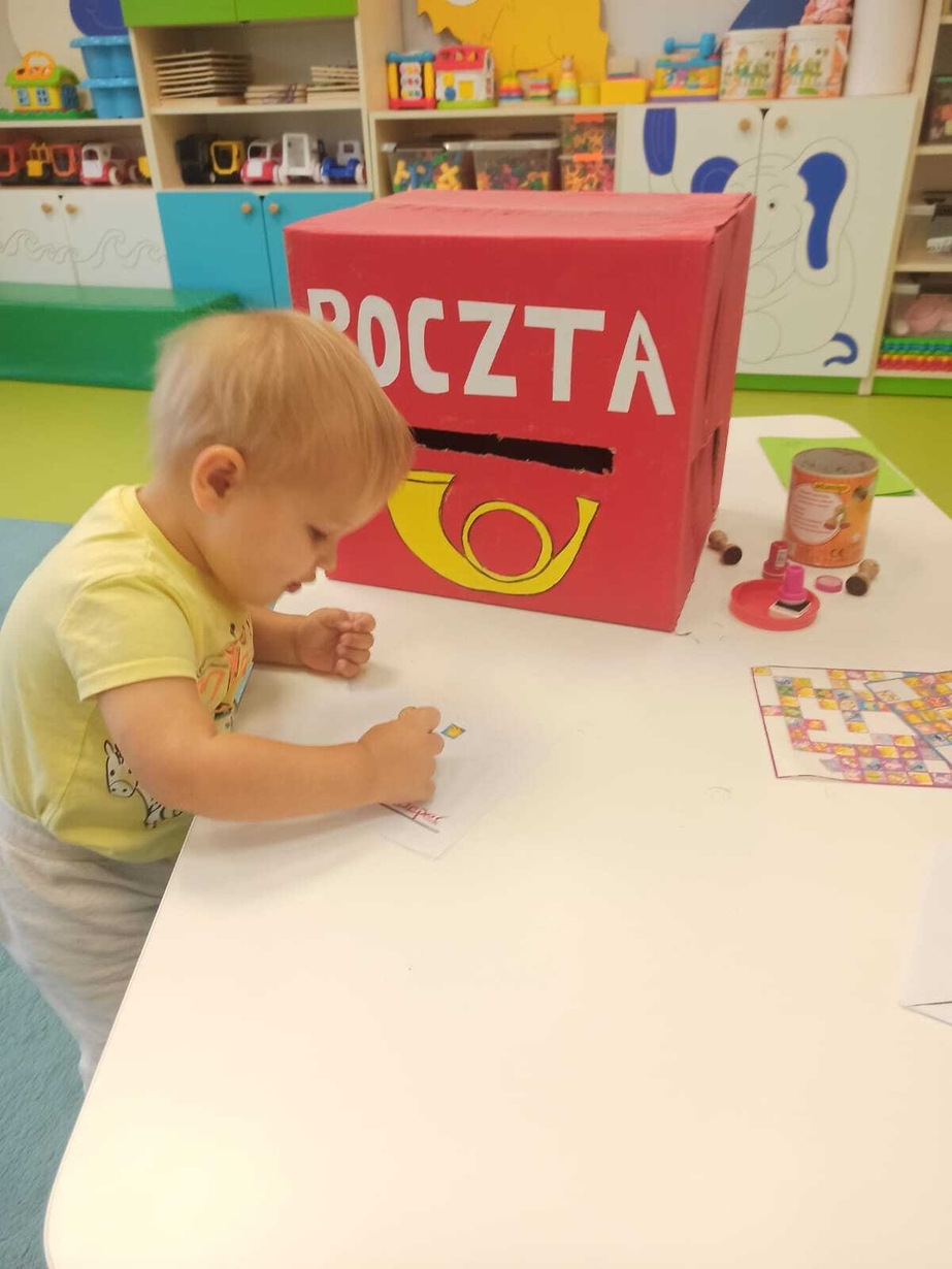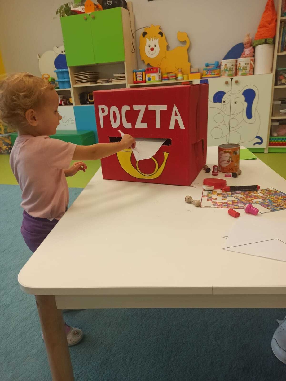 Podczas zajęć dydaktycznych dzieci zapoznały się ze specyfiką pracy listonosza, jego obowiązkami oraz dowiedziały się czym zajmuje się poczta. Każde z dzieci miało okazję przykleić znaczek i przybić stempel na kopertę, a następnie włożyć go do skrzynki pocztowej.