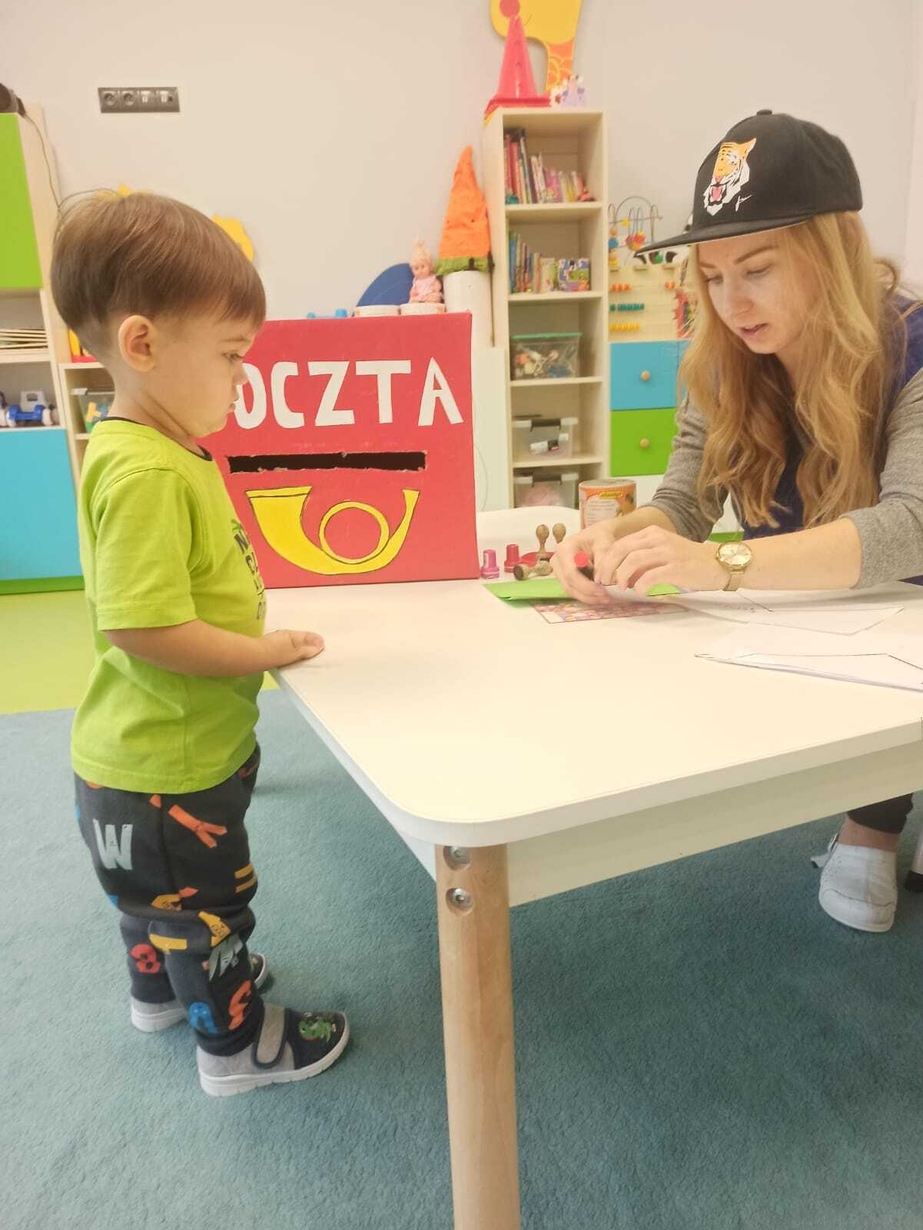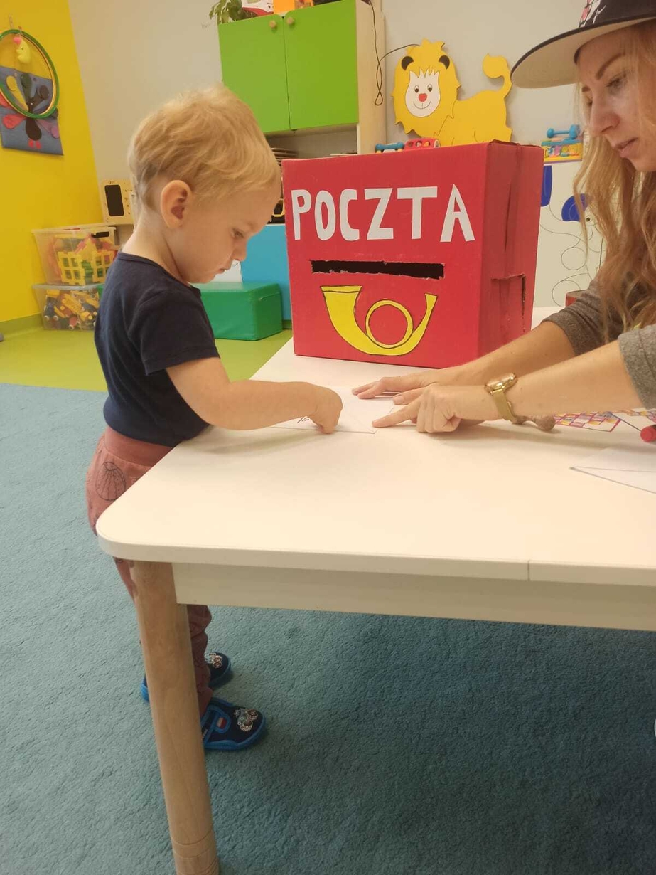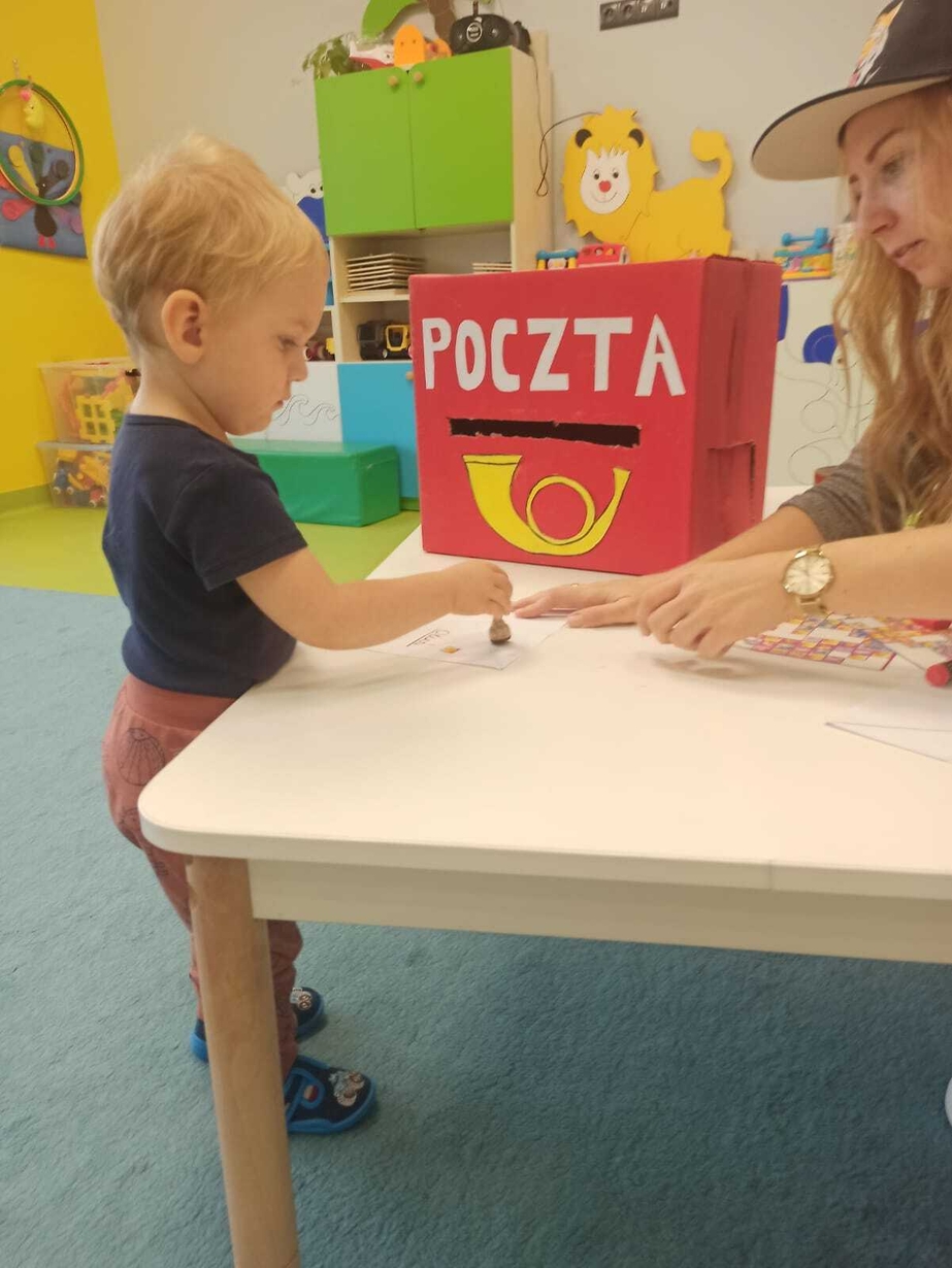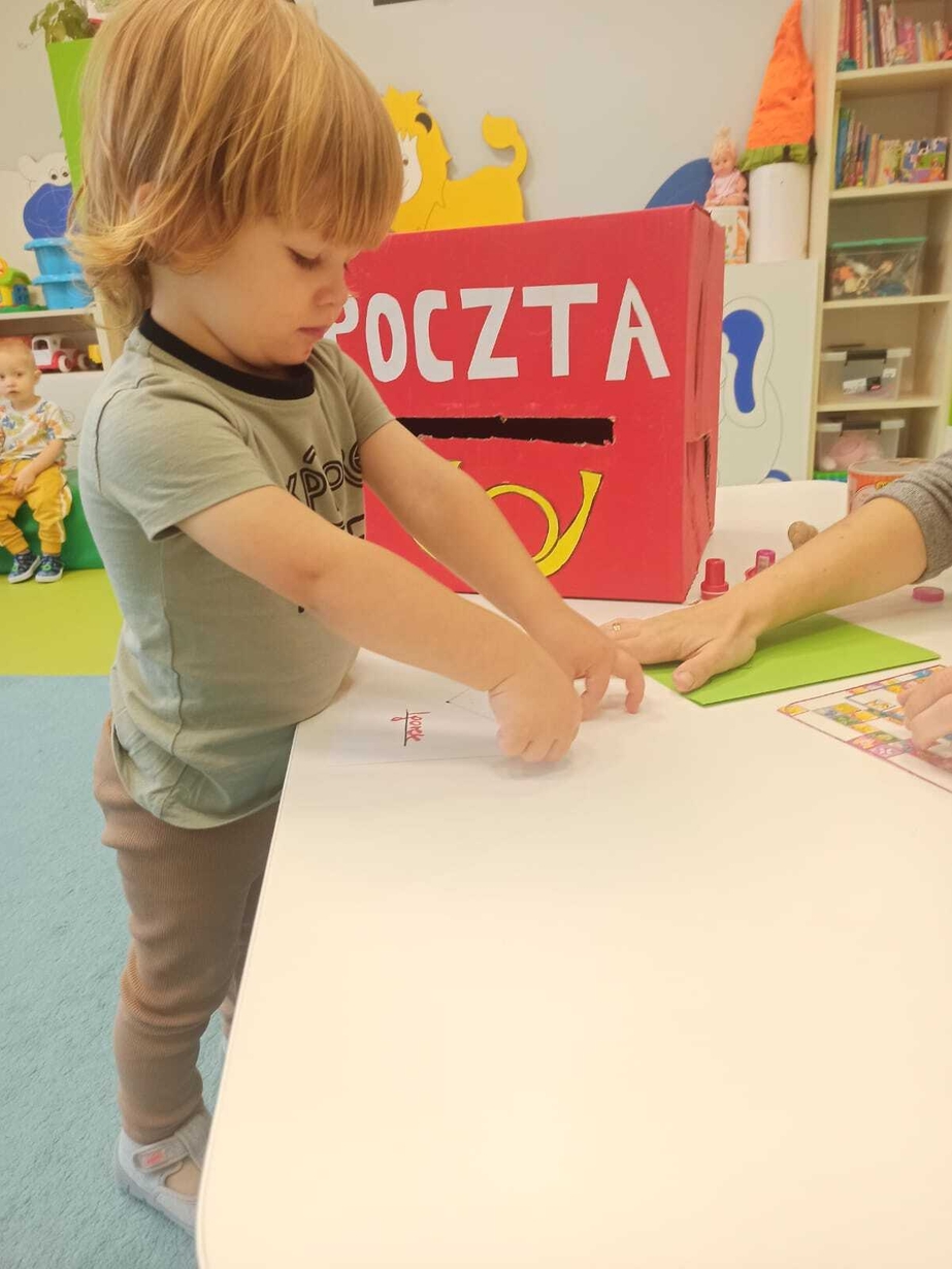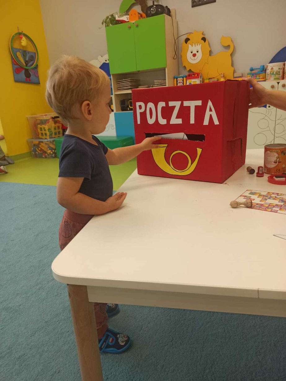 Podczas zajęć dydaktycznych dzieci zapoznały się ze specyfiką pracy listonosza, jego obowiązkami oraz dowiedziały się czym zajmuje się poczta. Każde z dzieci miało okazję przykleić znaczek i przybić stempel na kopertę, a następnie włożyć go do skrzynki pocztowej.