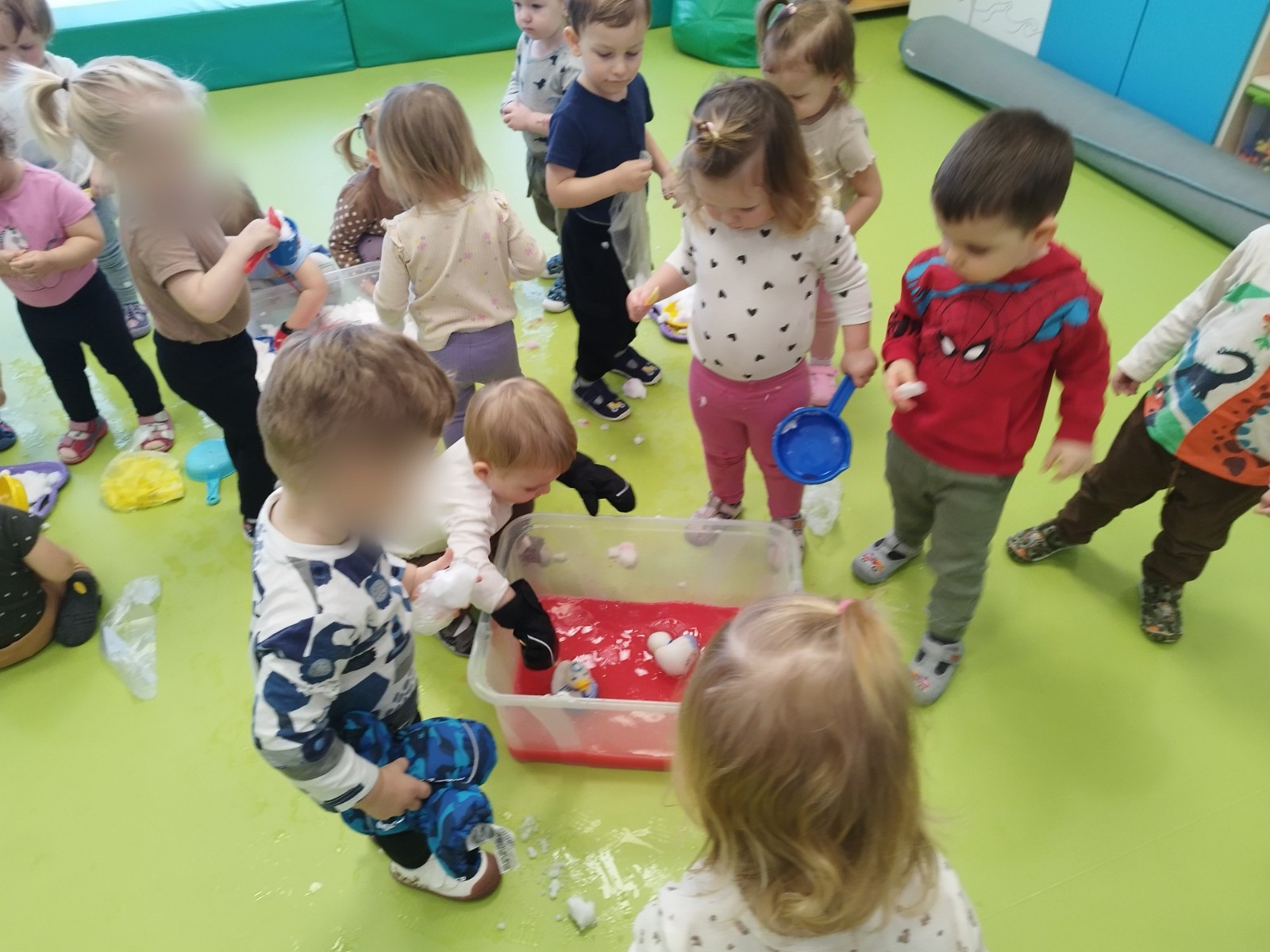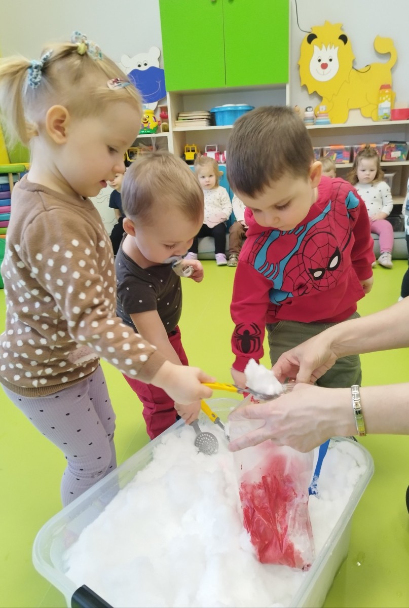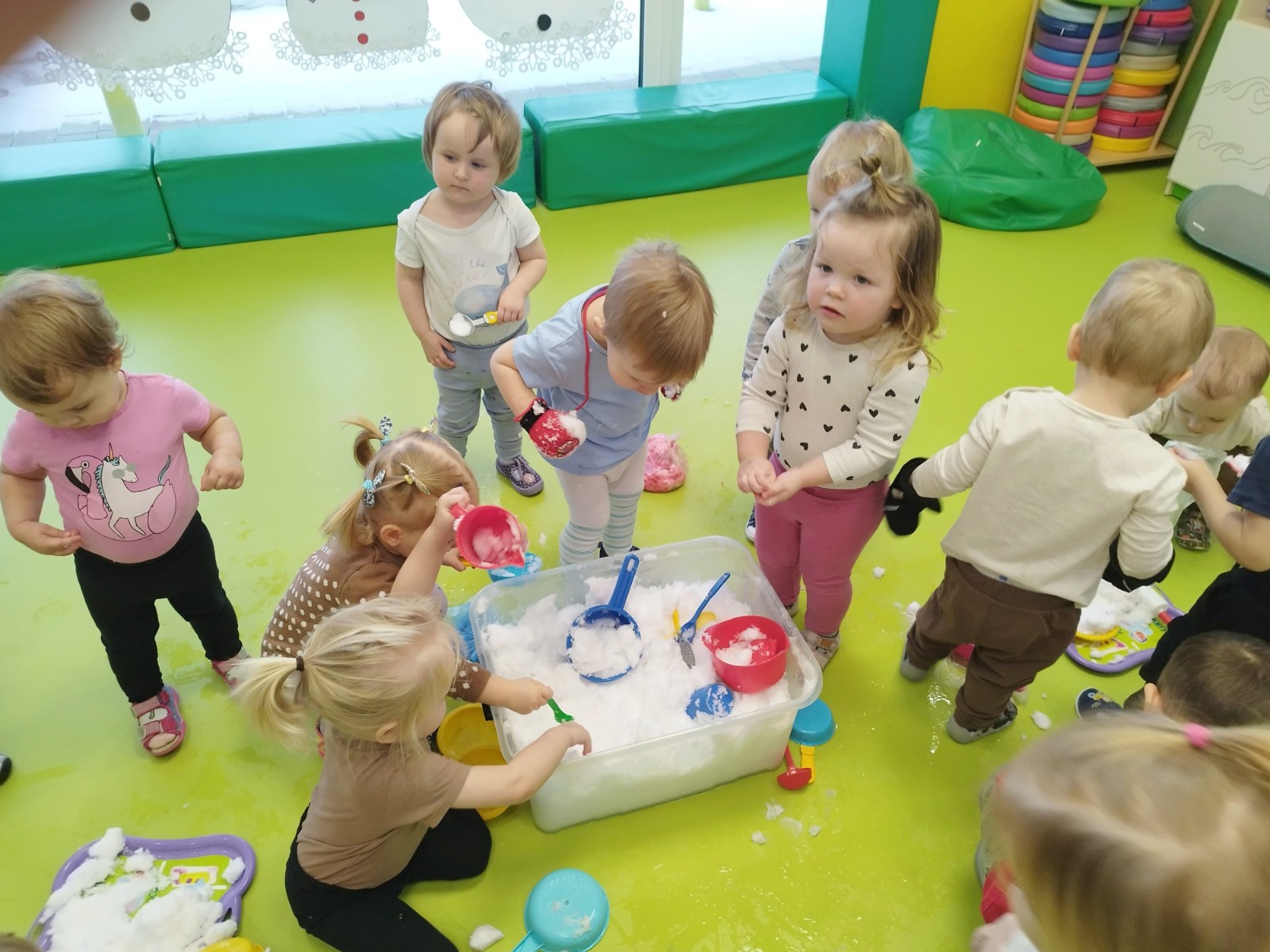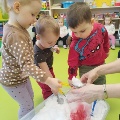 Przeprowadziliśmy ciekawe zajęcia sensoryczne, gdzie dzieci mogły zapoznać się ze strukturą śniegu oraz eksperyment ciepło-zimno. Dzieci wrzucały kulki śniegu do ciepłej wody obserwując ja topi się w niej śnieg. Bawiliśmy także śnieg na różne kolory.