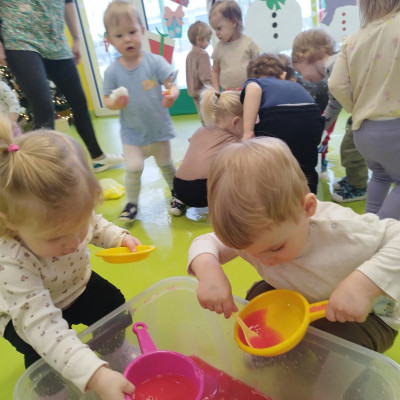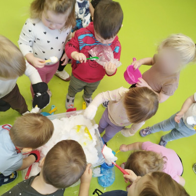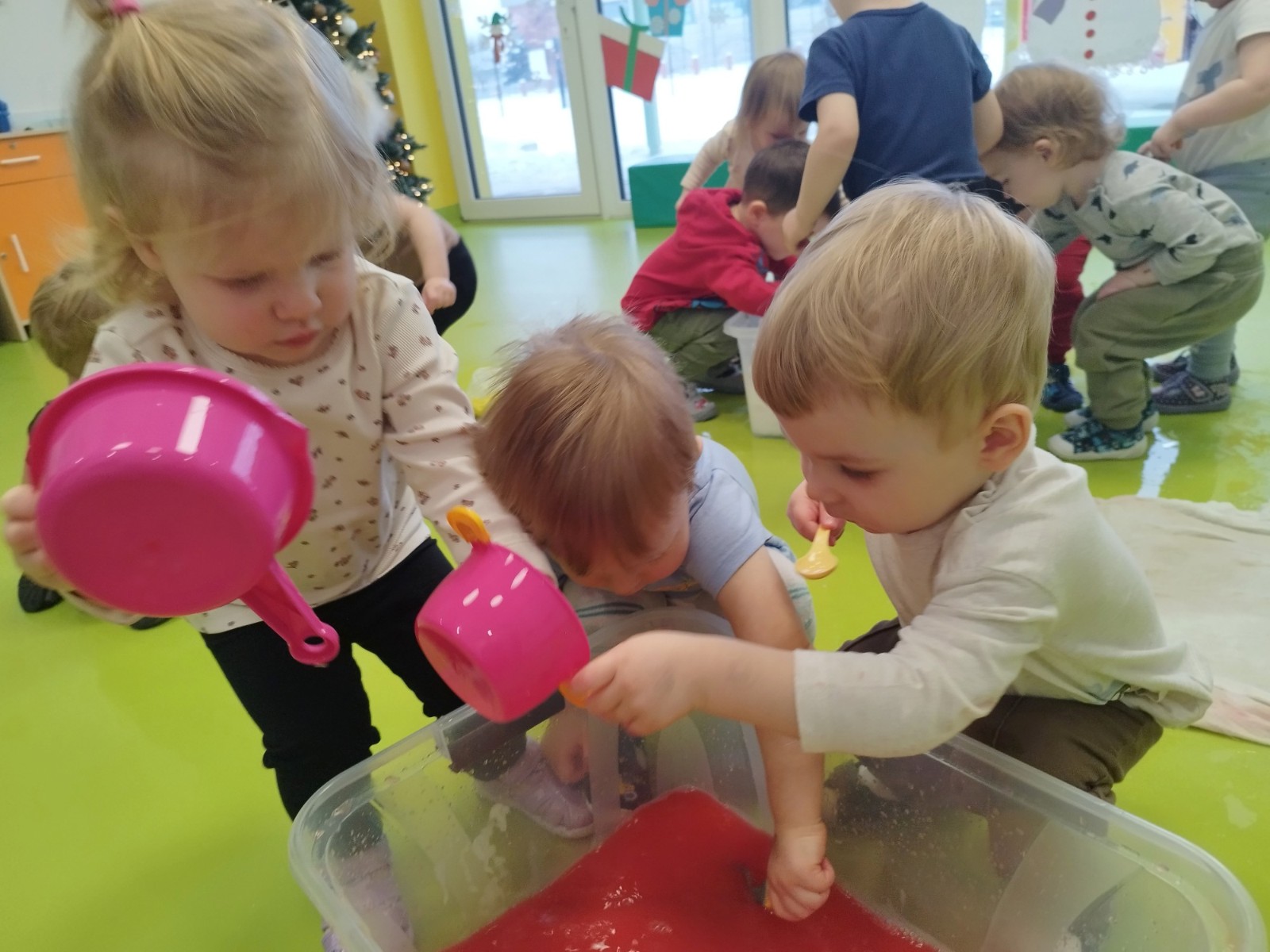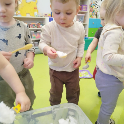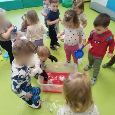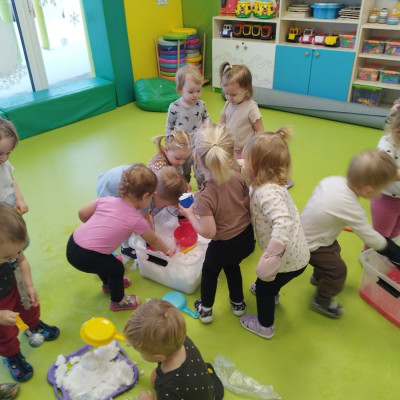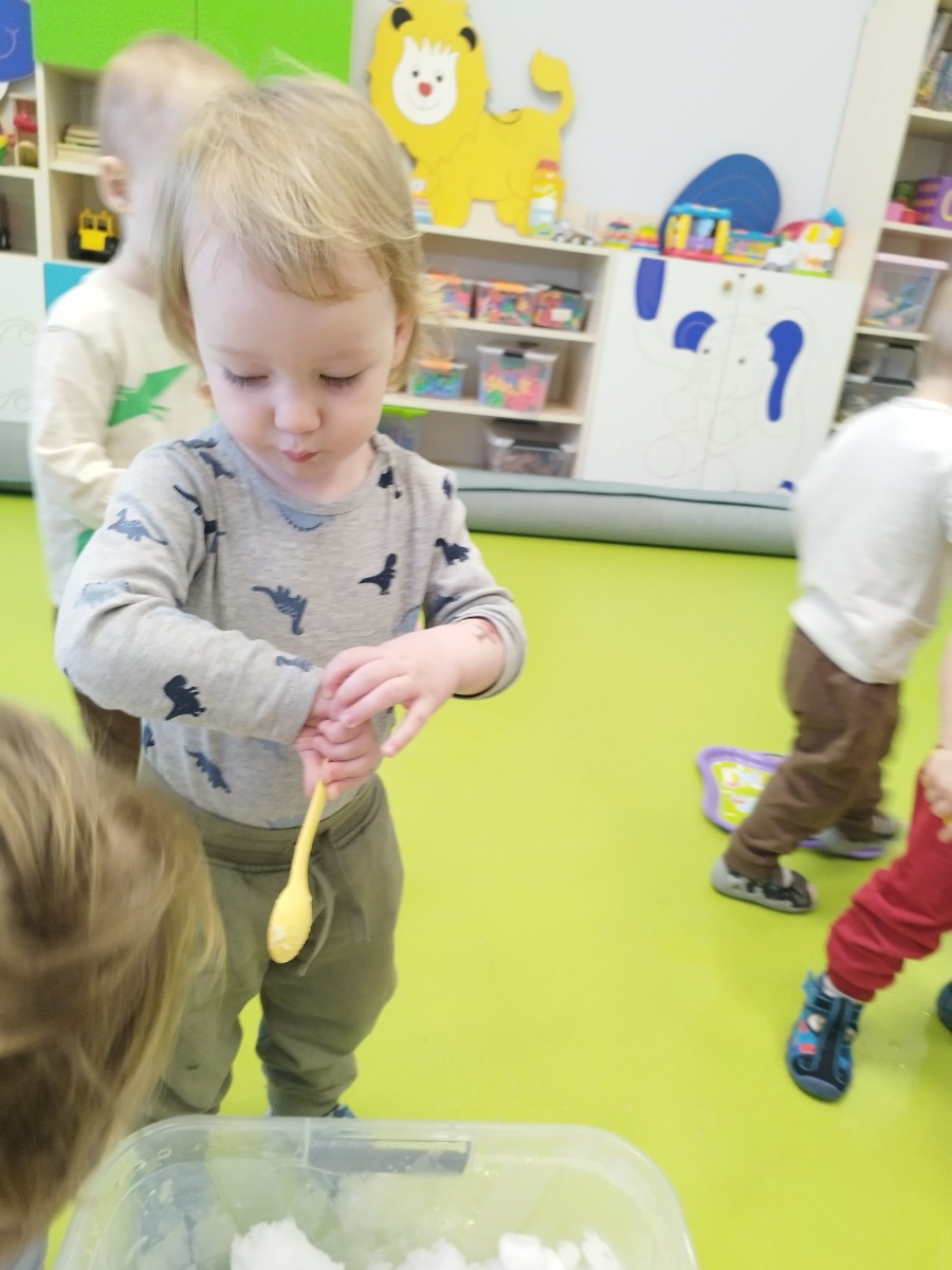 Przeprowadziliśmy ciekawe zajęcia sensoryczne, gdzie dzieci mogły zapoznać się ze strukturą śniegu oraz eksperyment ciepło-zimno. Dzieci wrzucały kulki śniegu do ciepłej wody obserwując ja topi się w niej śnieg. Bawiliśmy także śnieg na różne kolory.