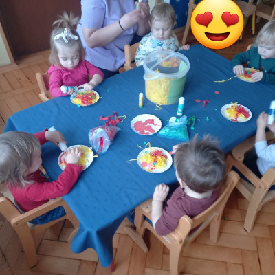 Dzieci wykonały również spaghetti z bibuły i papieru kolorowego z dodatkami według własnego pomysłu.