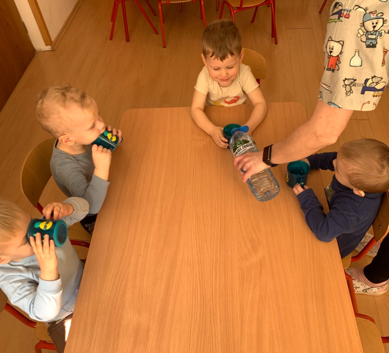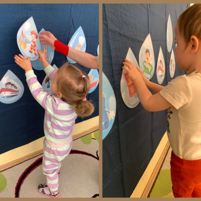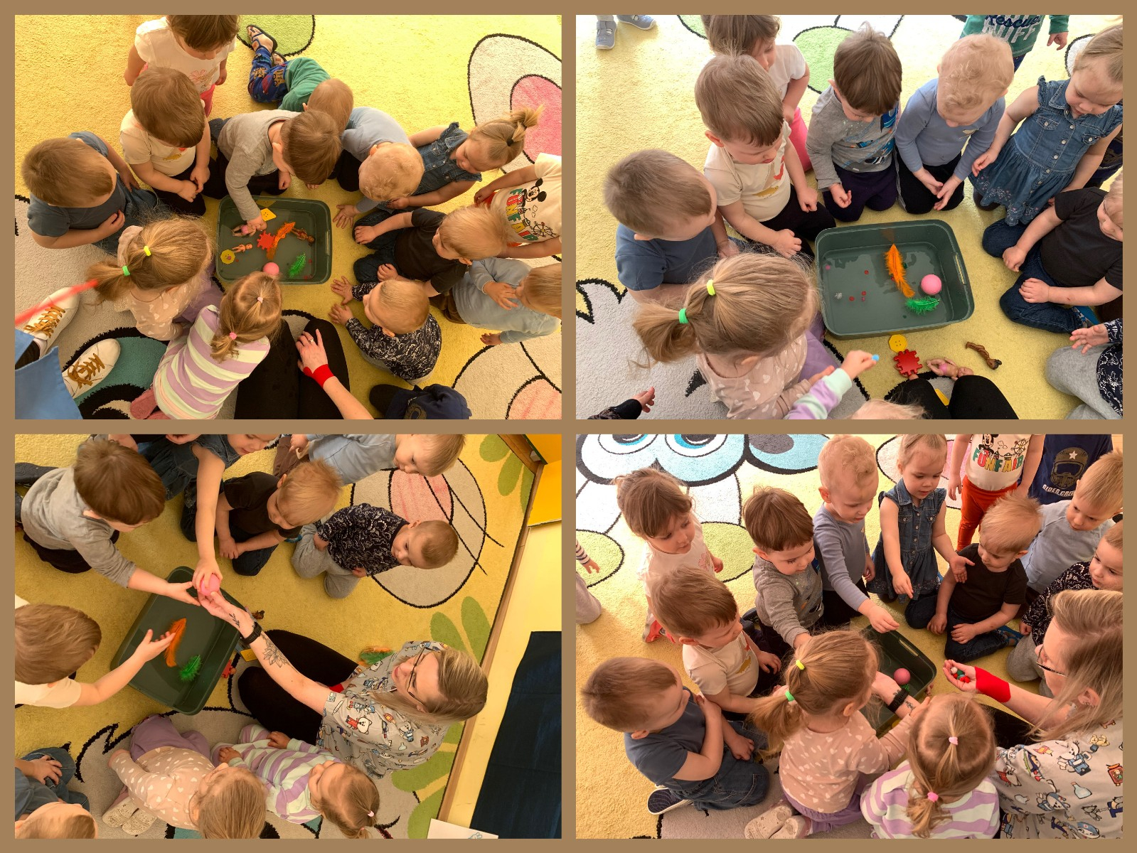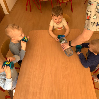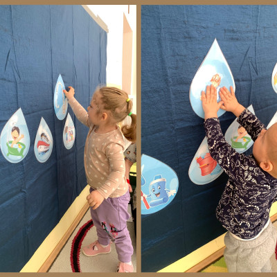 Maluszki poznały również znaczenie wody 💦 w codziennym życiu. Dzieci poznały wędrówkę kropel wody i dowiedziały się skąd się bierze deszcz. Eksperyment z wodą : co tonie a co się unosi na wodzie.