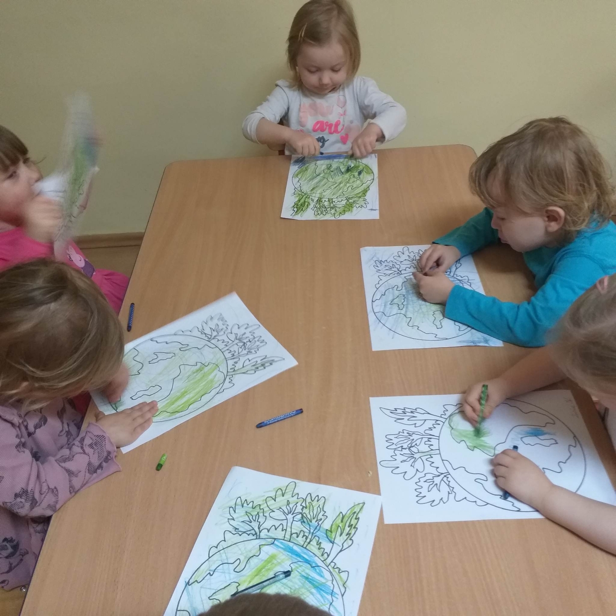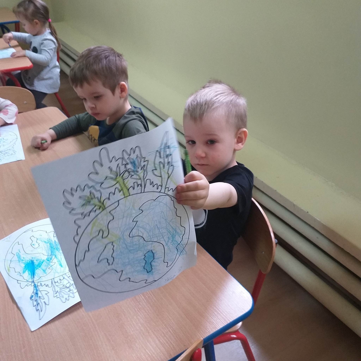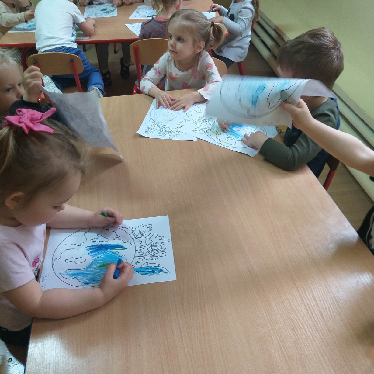 Dzieci miały też okazję porozmawiać o tym co sprawia, że Ziemia jest smutna (zanieczyszczona) oraz co możemy dla niej zrobić aby była szczęśliwa (czysta).