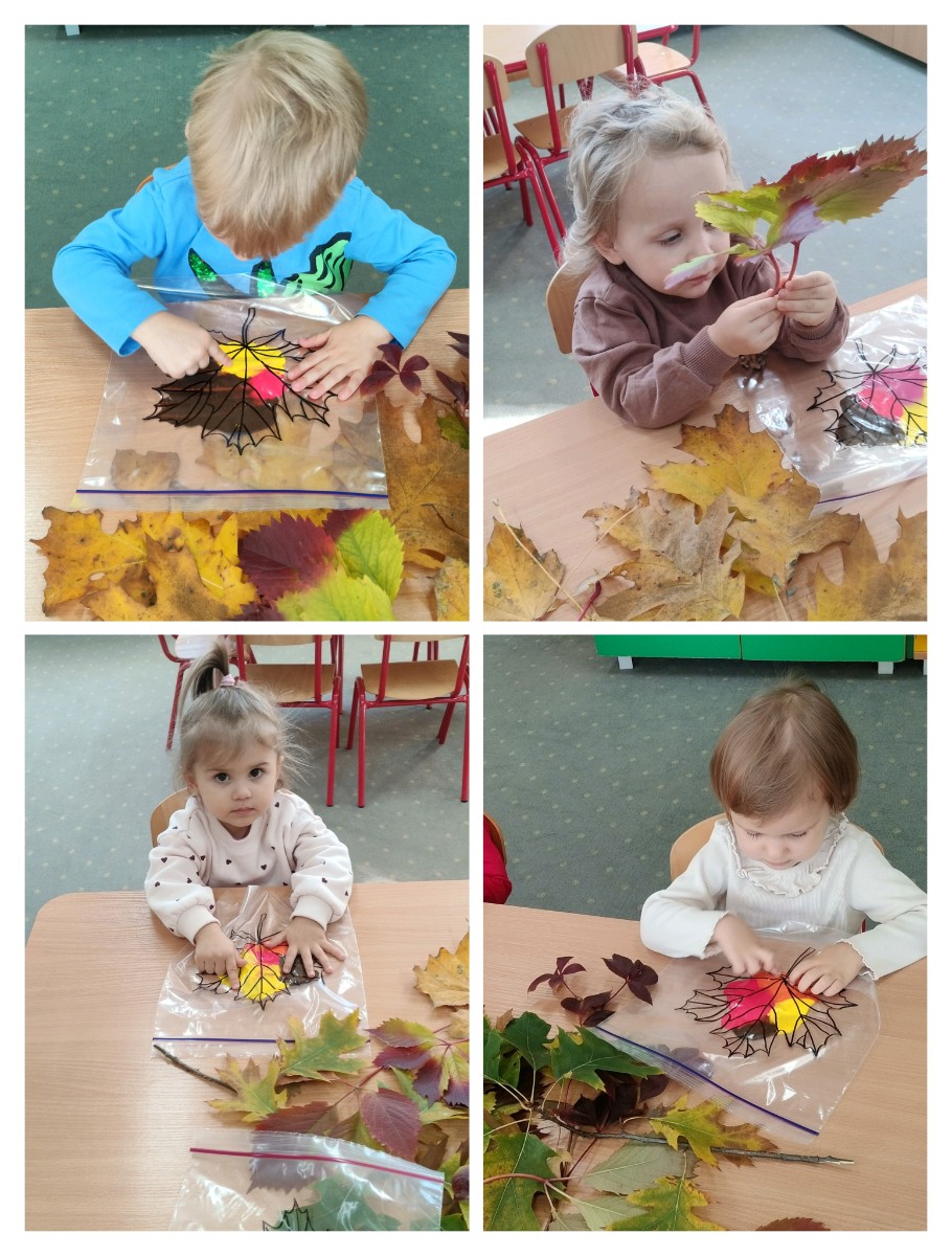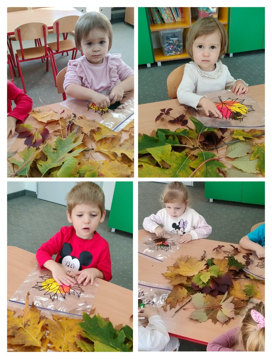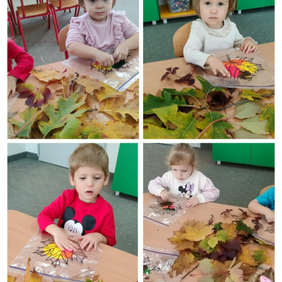 Zdjęcia przedstawiają dzieci podczas zajęć tematycznych o jesieni