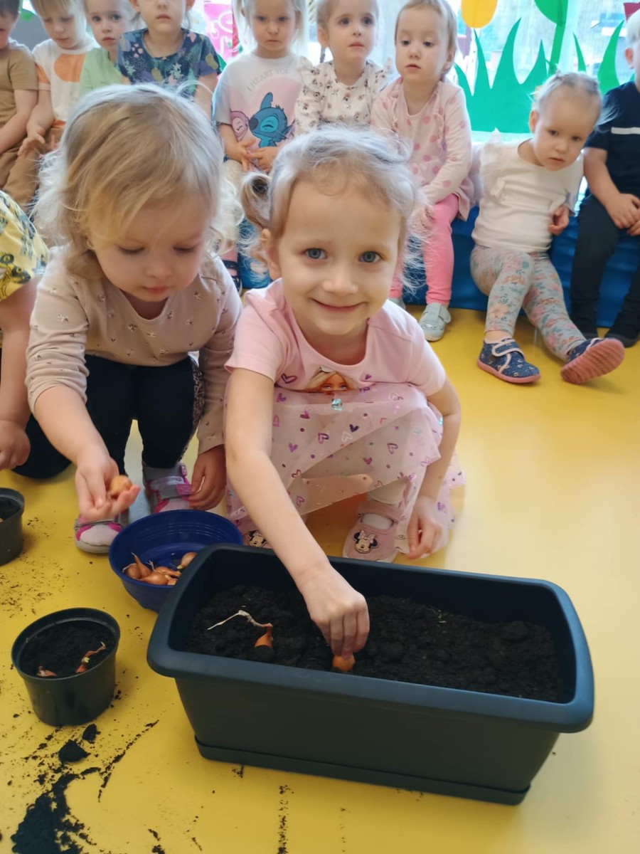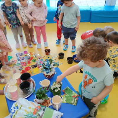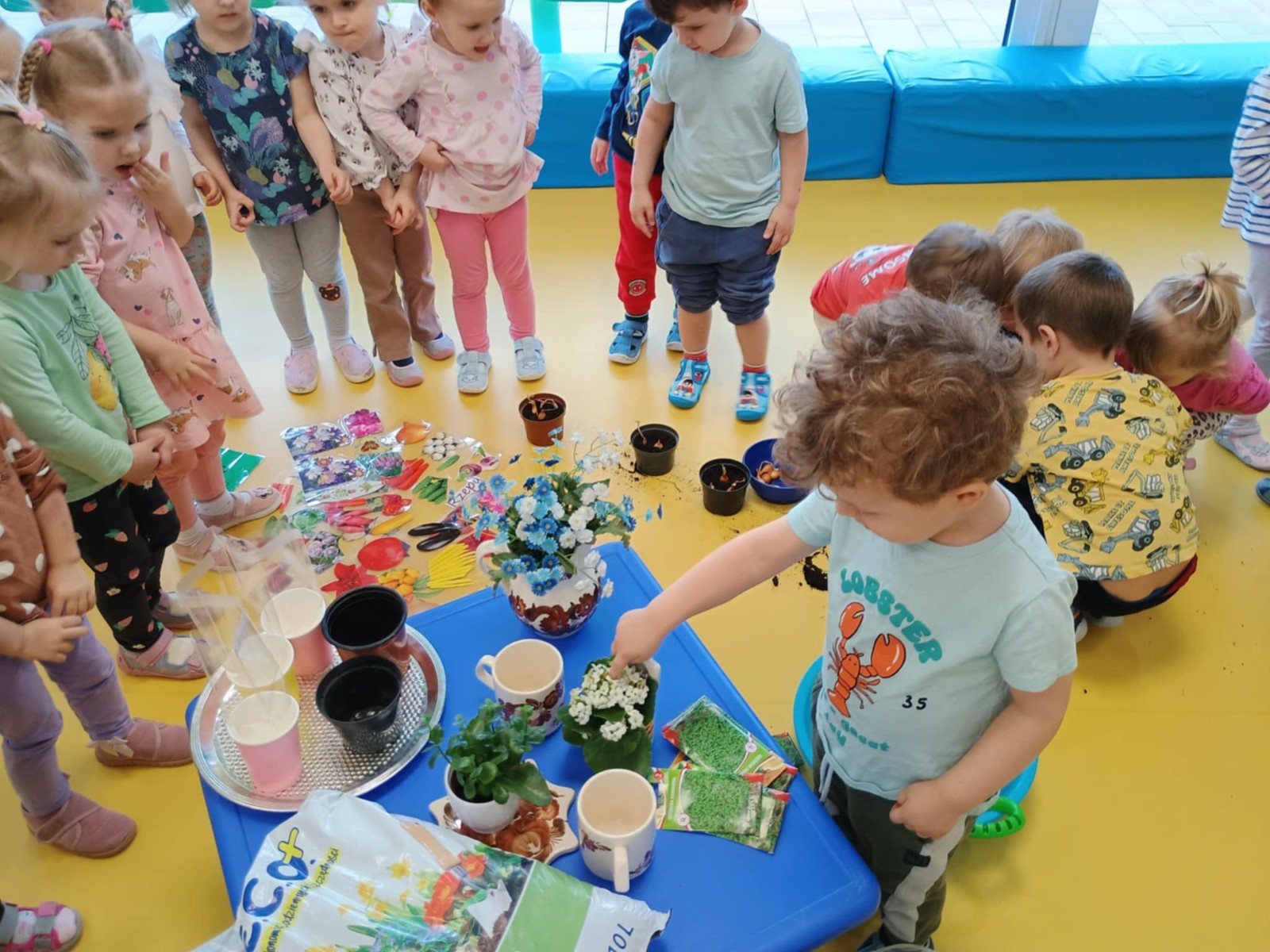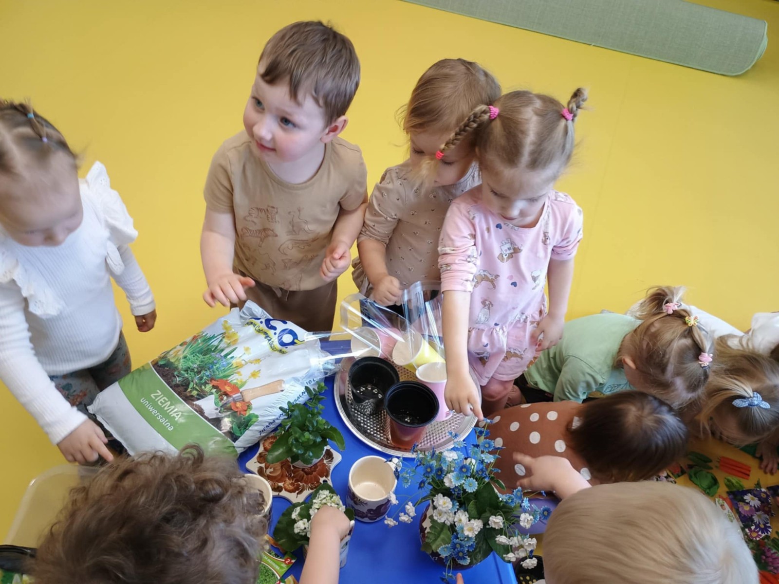 W dniu dzisiejszym w grupie Rybek odbyły się zajęcia pt.„Sadzimy kwiaty”, gdzie dzieci poszerzały wiadomości na temat wiosennych kwiatów i warunków niezbędnych do ich rozwoju. Dzieci miały okazję zabawić się w ogrodników i dowiedzieć się do czego służą odpowiednie sprzęty m.in. doniczka, ziemia, łopatka, sadzonki, rękawiczki, konewka.