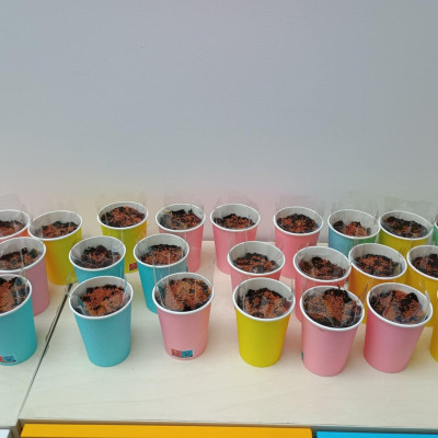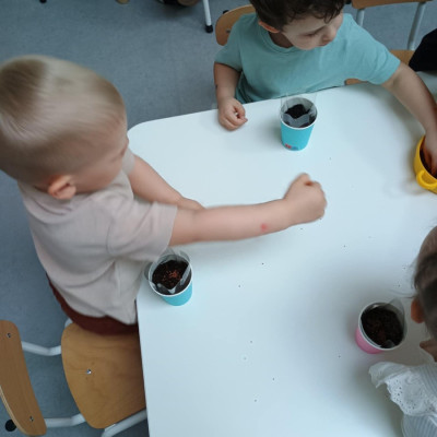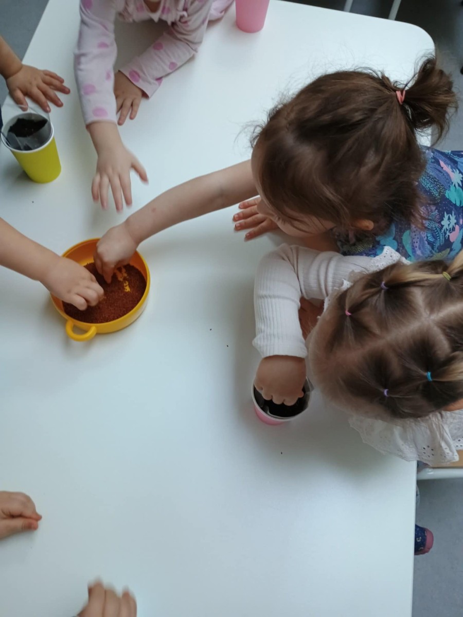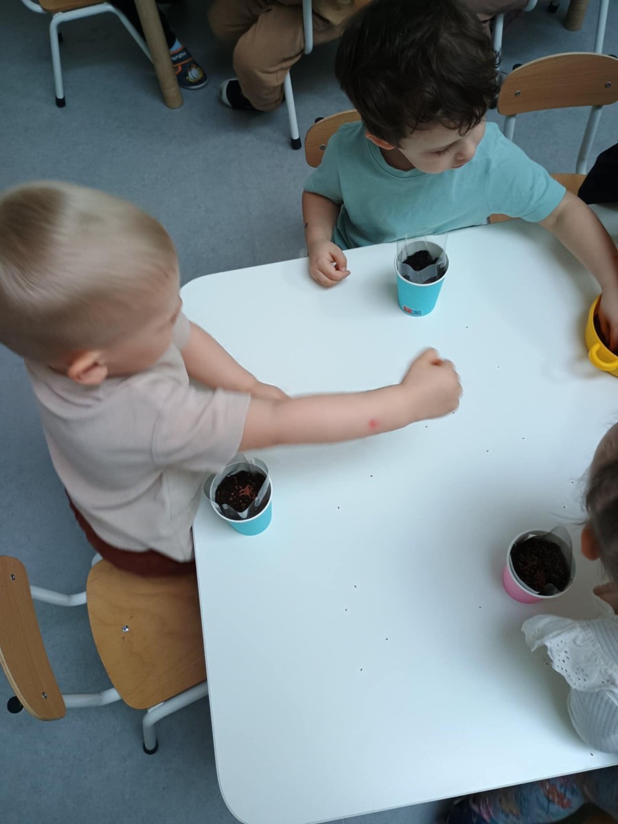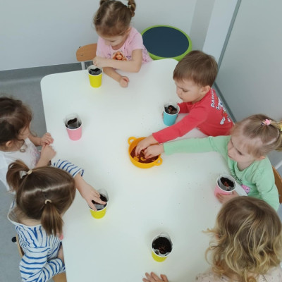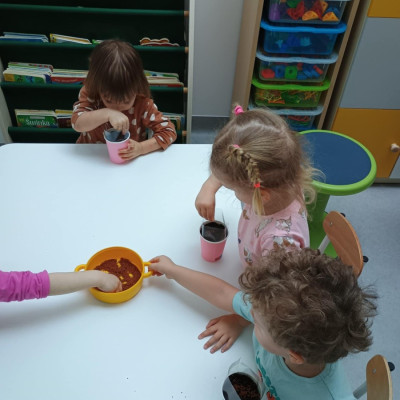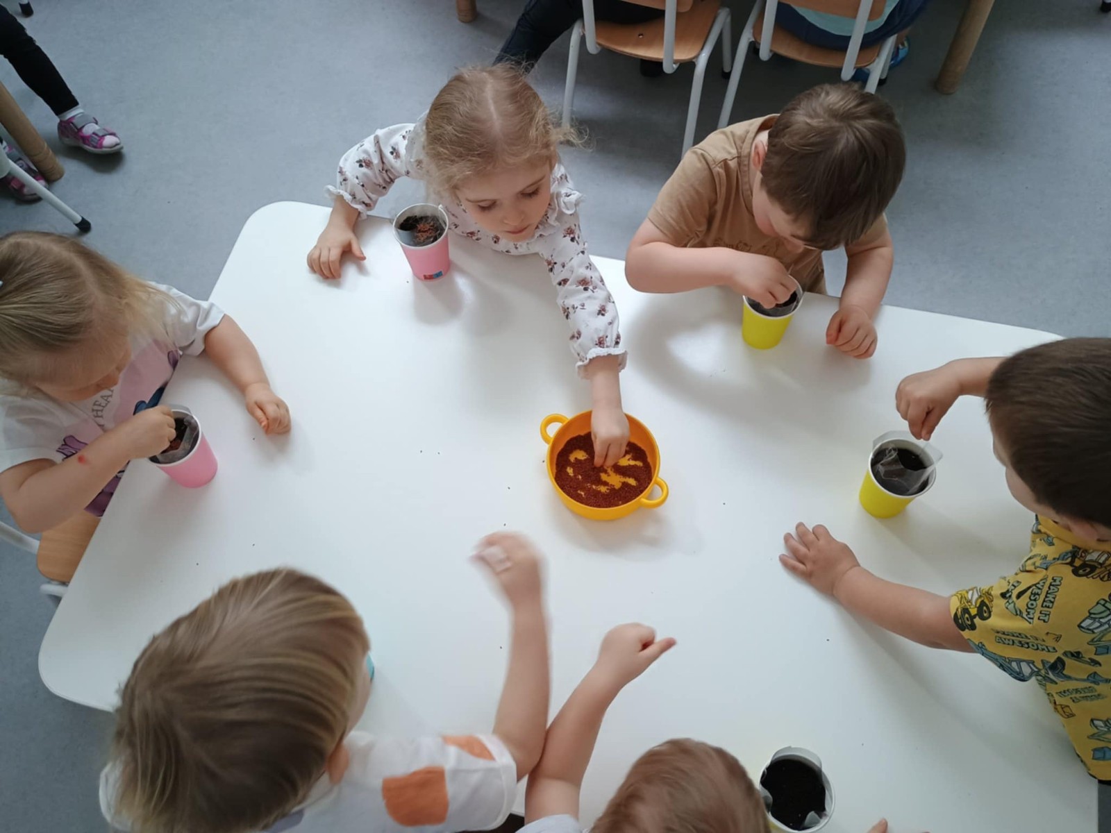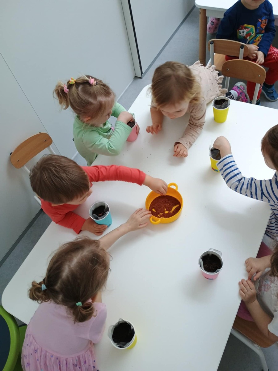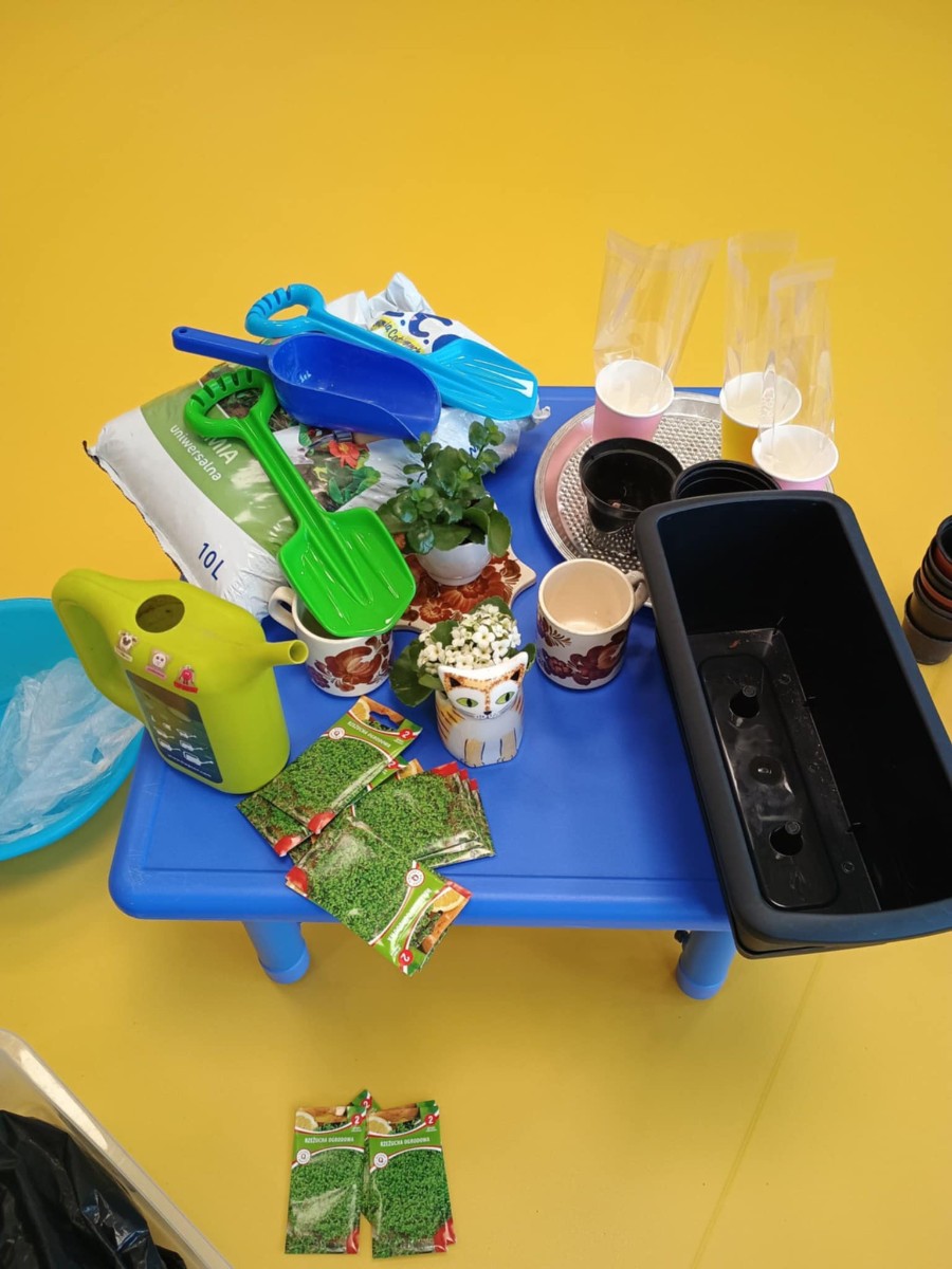 Rybki posadziły różne warzywa, a przygotowując się małymi krokami do Świąt Wielkanocnych, sadziły również rzeżuchę.