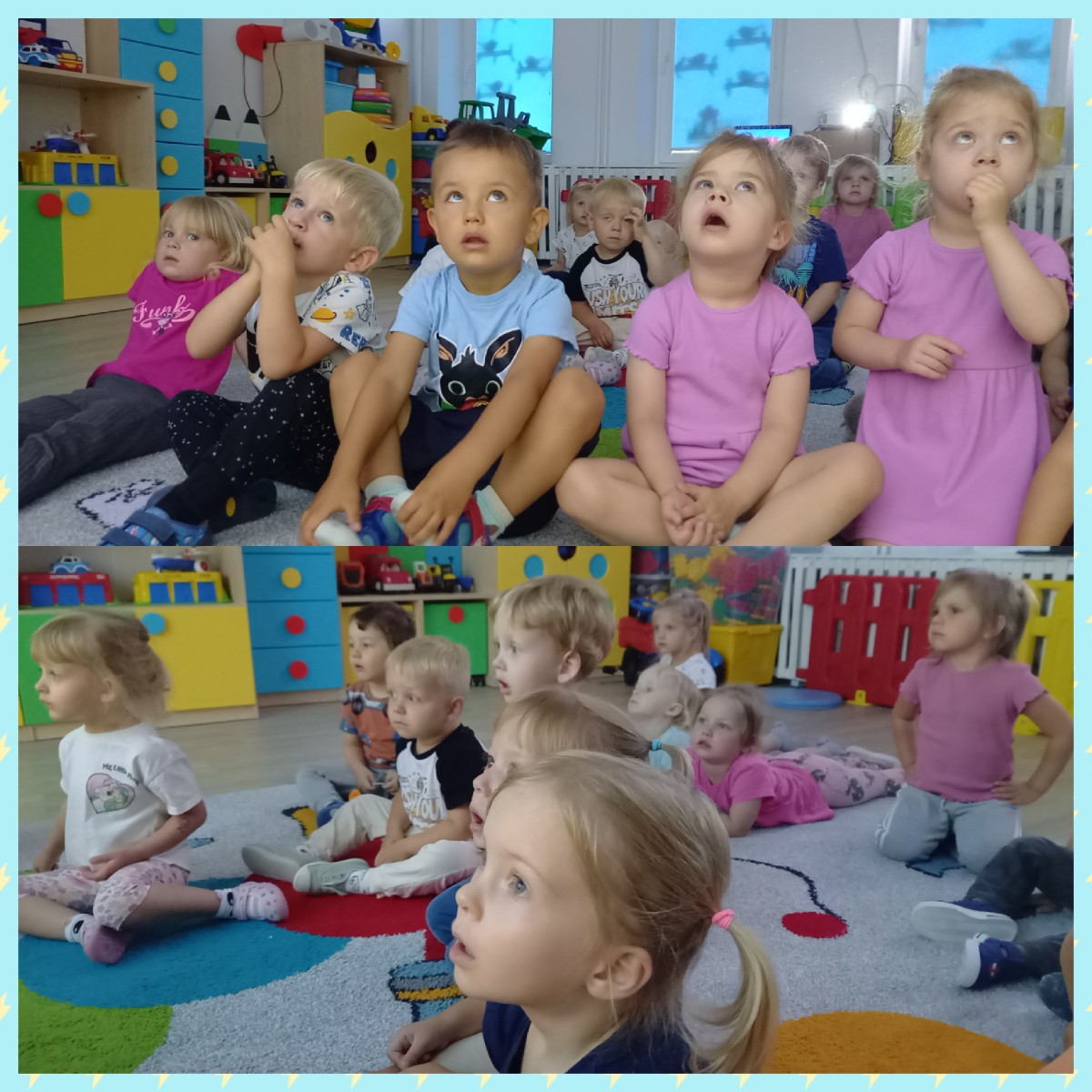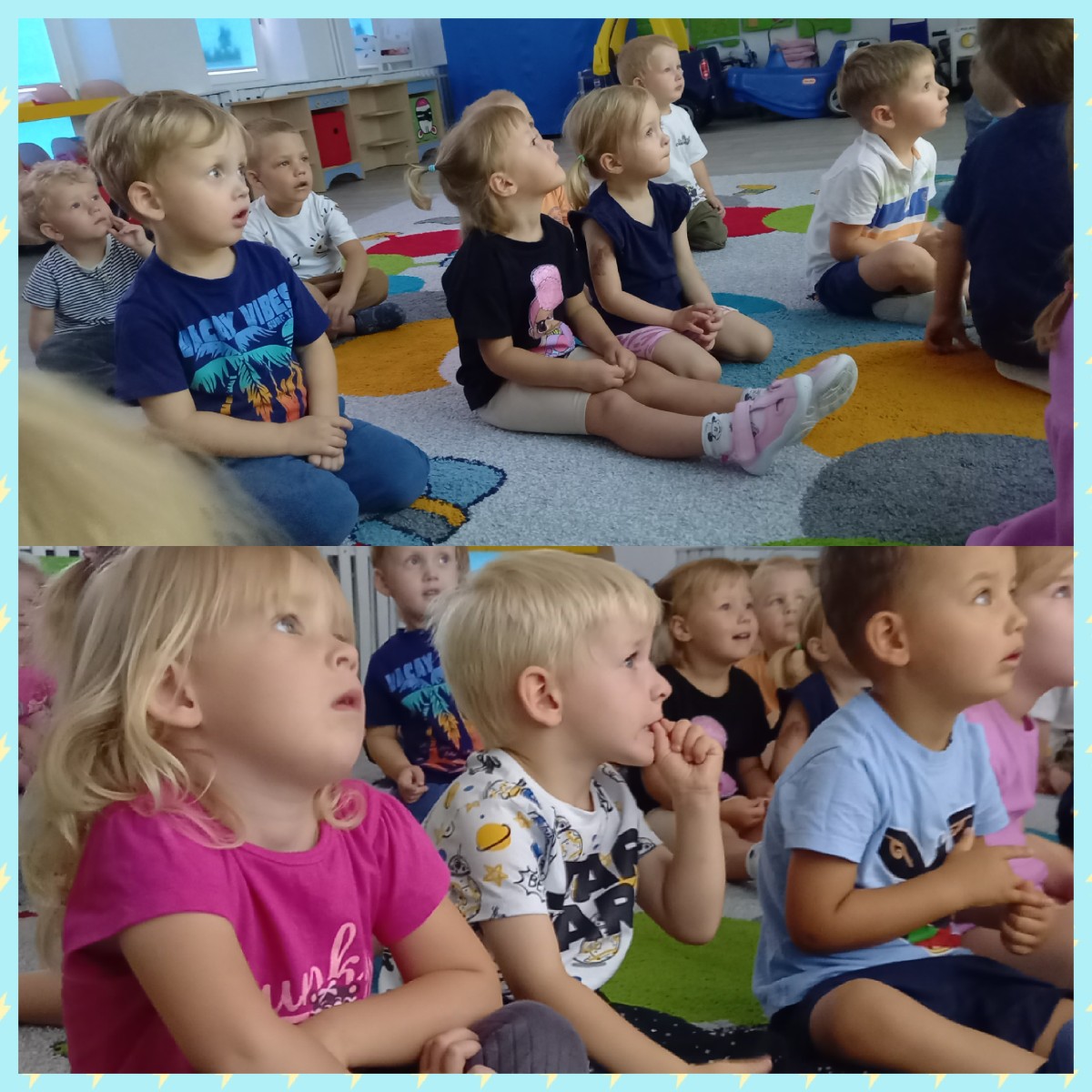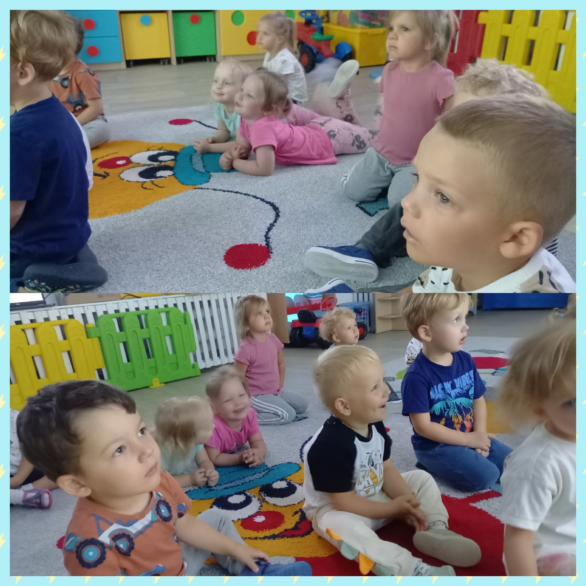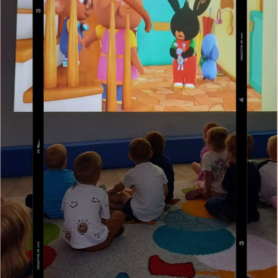 Zdjęcia przedstawiają dzieci podczas seansu bajkowego.