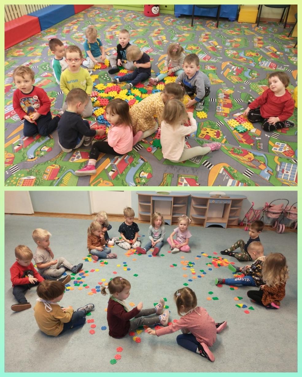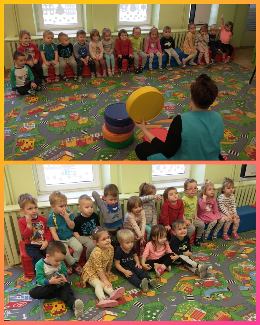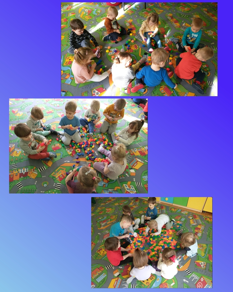 Żabki uruchamiały swoją pomysłowość i przez zabawę z kółeczkami gimnastycznymi ćwiczyły swoją sprawność motoryczną.