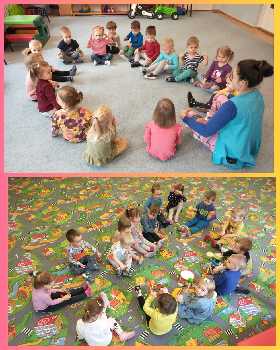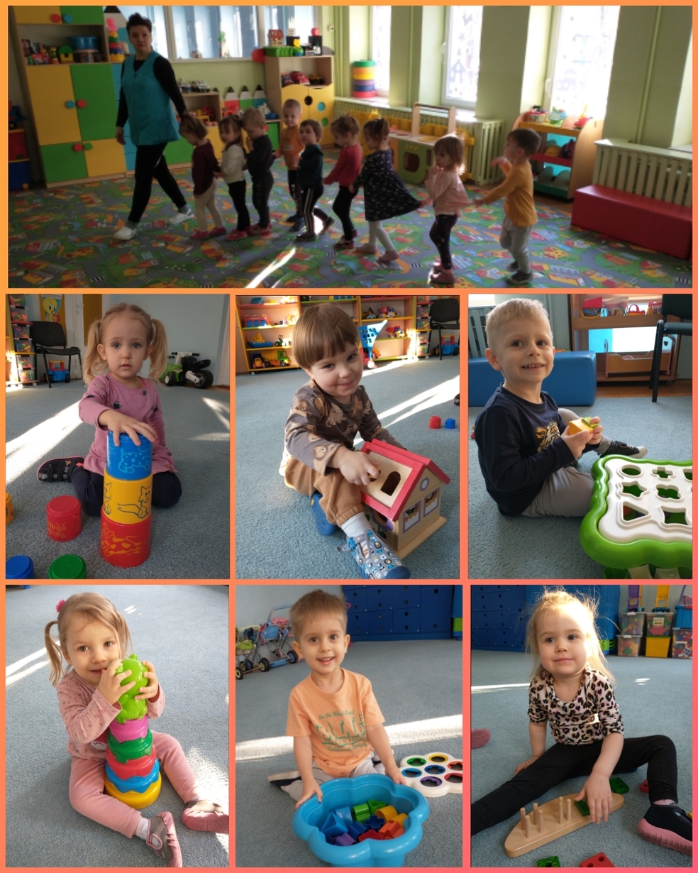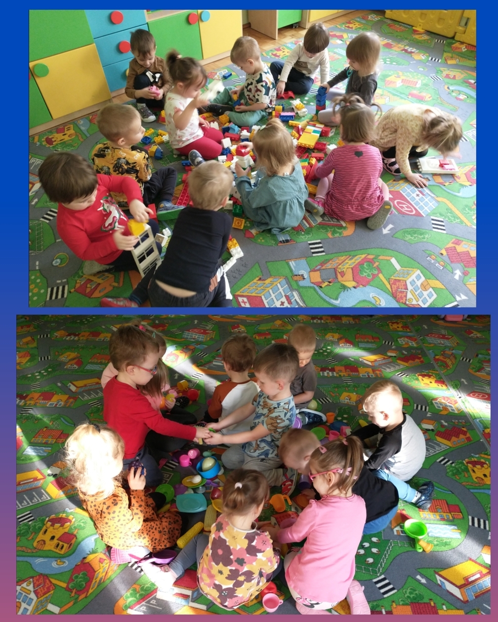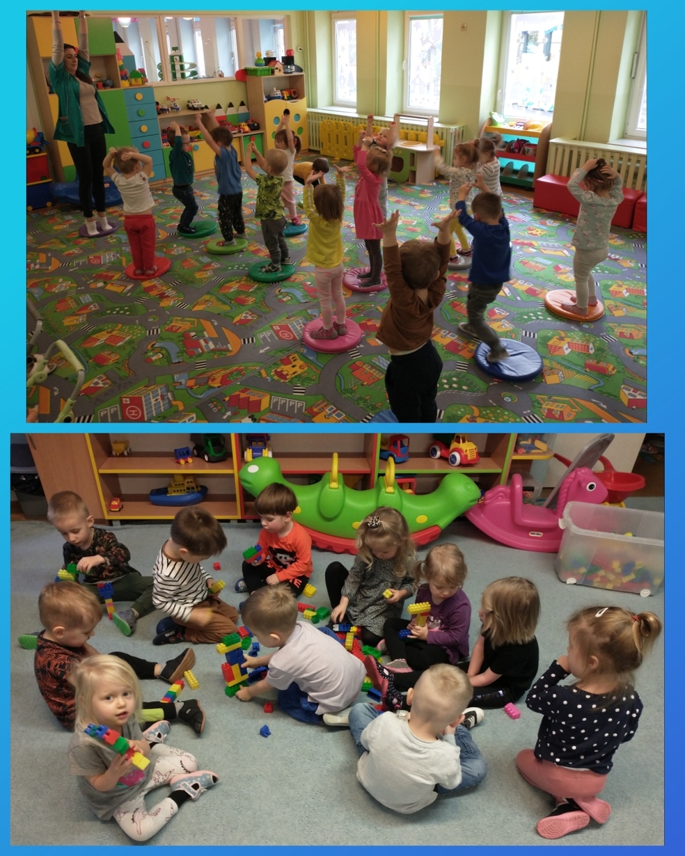 Żabki uruchamiały swoją pomysłowość i przez zabawę z kółeczkami gimnastycznymi ćwiczyły swoją sprawność motoryczną.