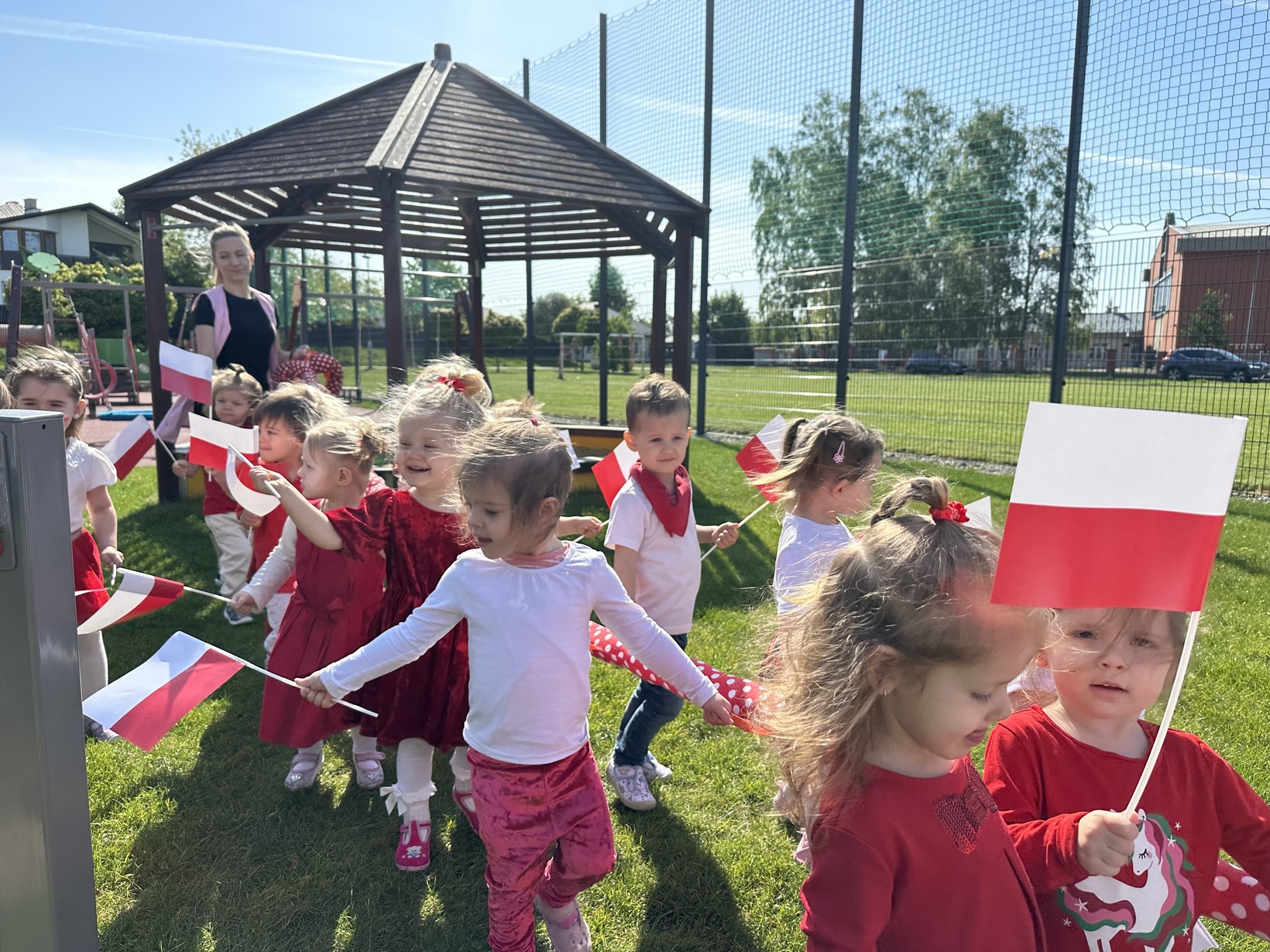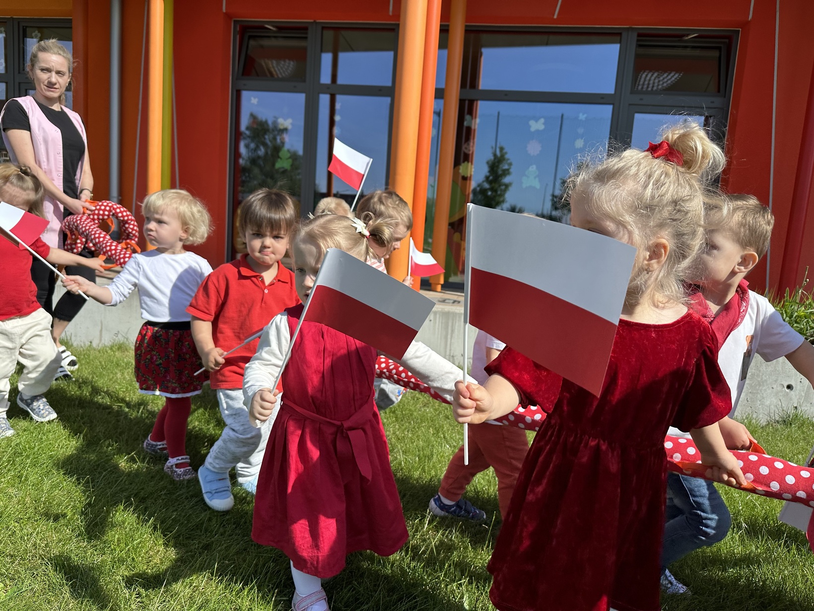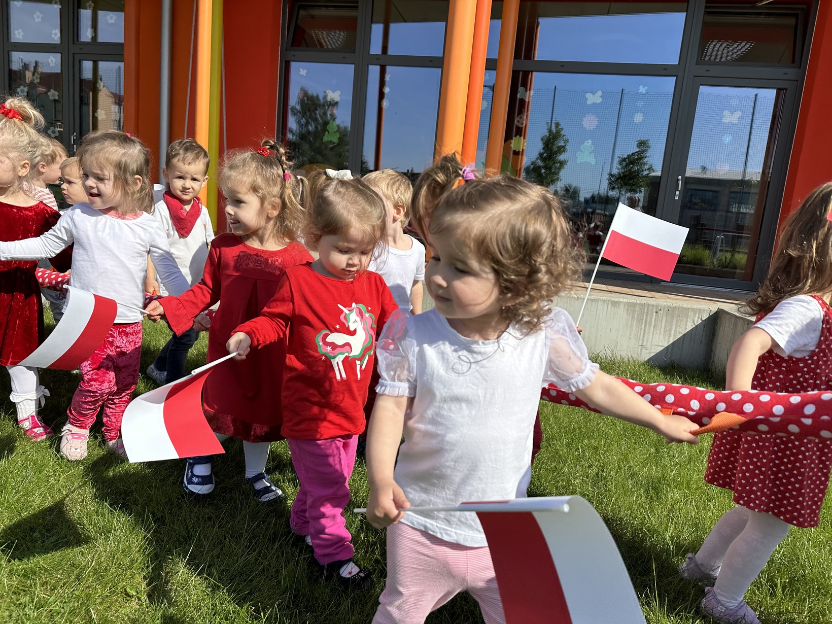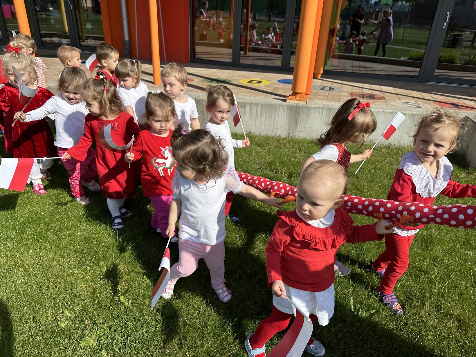 W naszym żłobku przez cały tydzień rozbudzaliśmy zainteresowanie dzieci historią naszego kraju. Dzieci poznawały nasze symbole narodowe, flagę i godło, wysłuchały także hymnu narodowego - Mazurka Dąbrowskiego, a na zajęciach plastycznych wykonały flagi. Na zakończenie dzieci wzięły udział w patriotycznym pochodzie majowym, zorganizowanym przez Panie opiekunki.