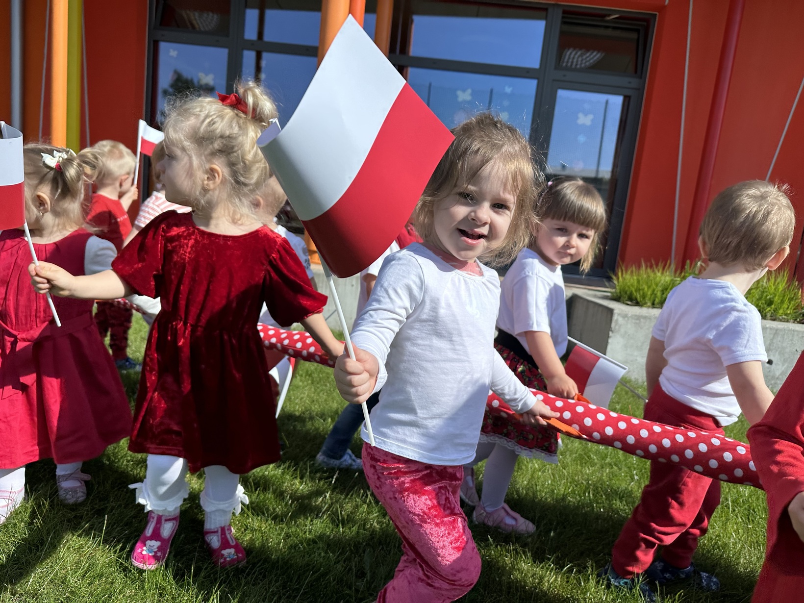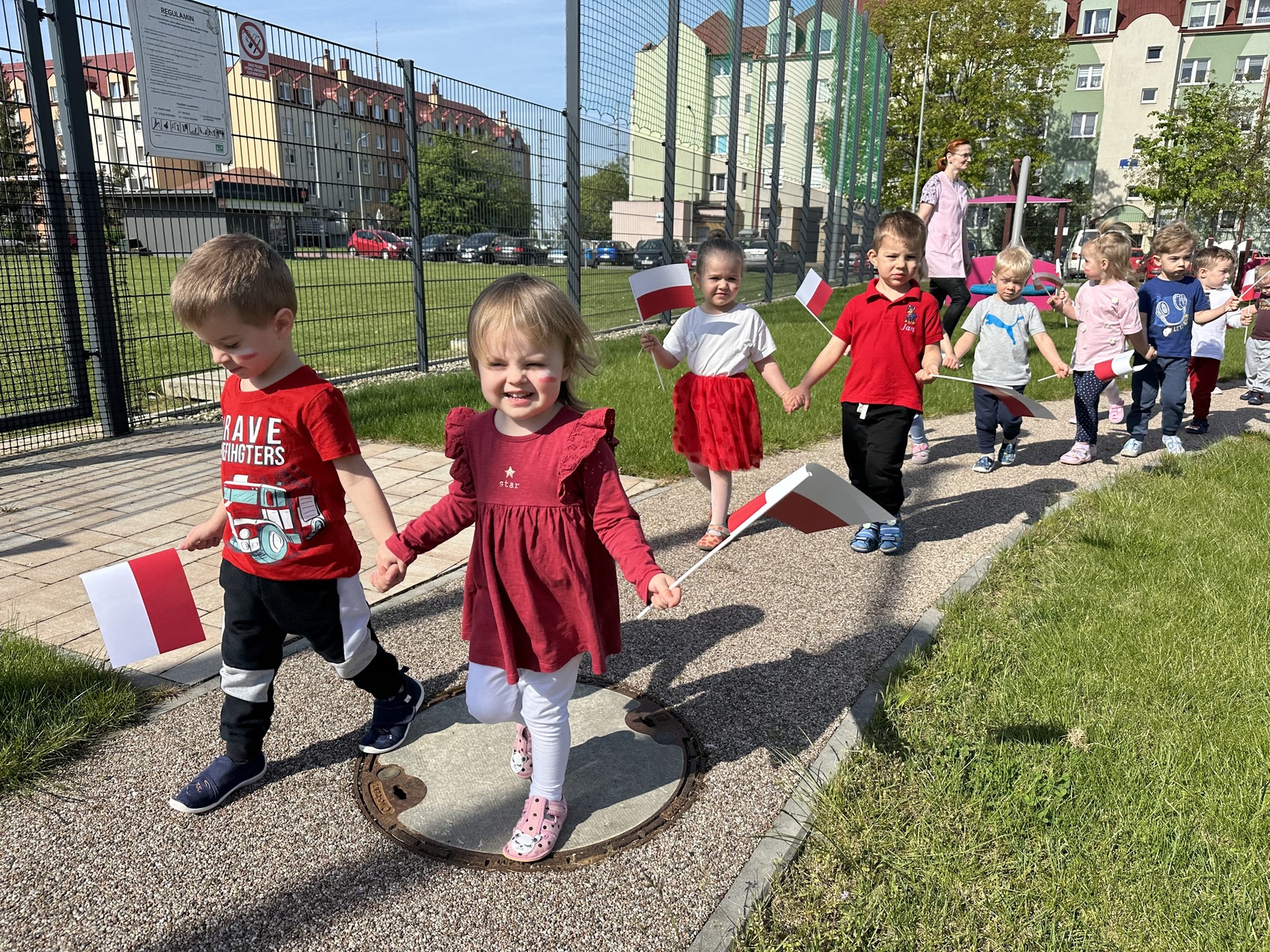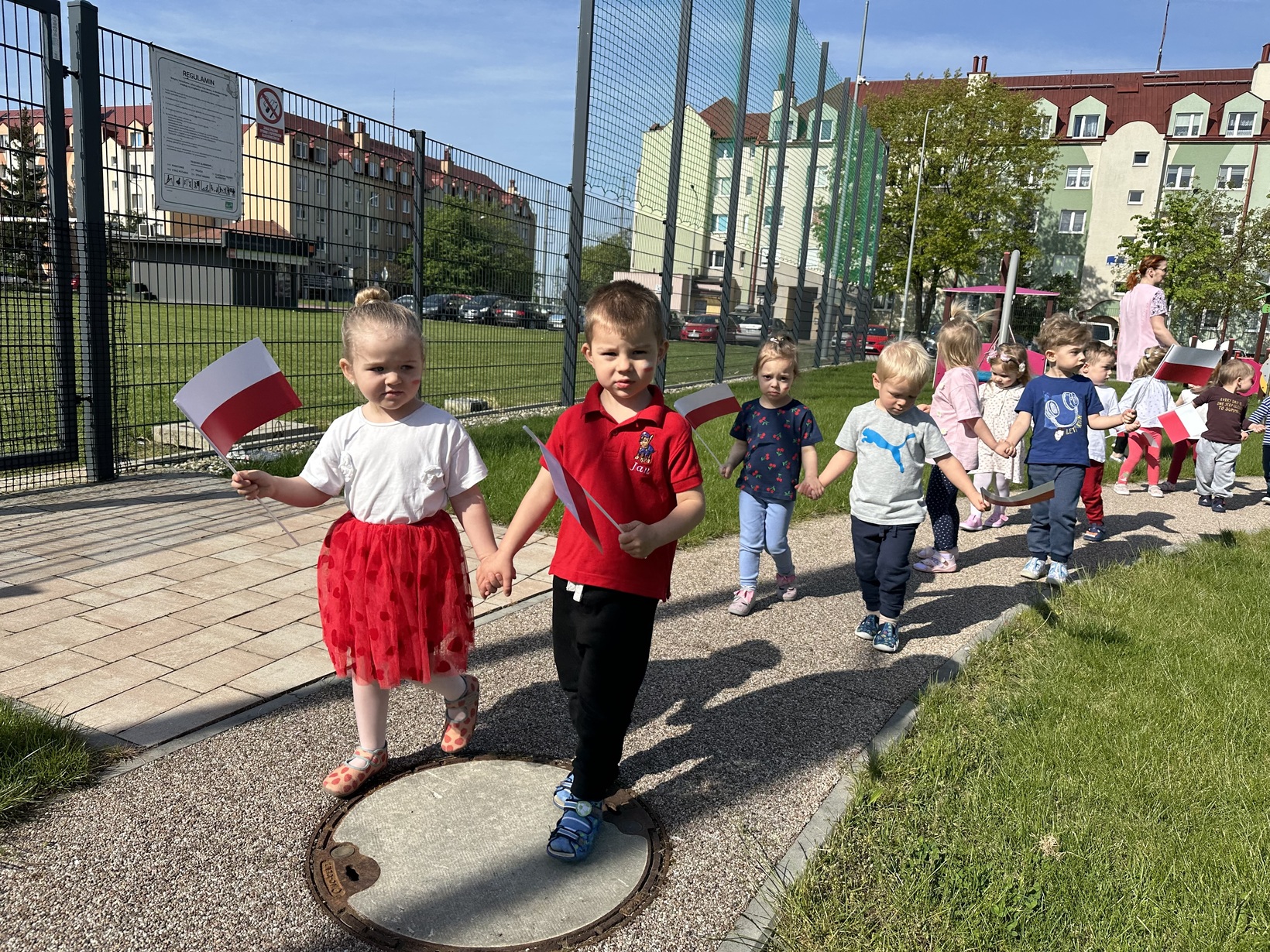 W naszym żłobku przez cały tydzień rozbudzaliśmy zainteresowanie dzieci historią naszego kraju. Dzieci poznawały nasze symbole narodowe, flagę i godło, wysłuchały także hymnu narodowego - Mazurka Dąbrowskiego, a na zajęciach plastycznych wykonały flagi. Na zakończenie dzieci wzięły udział w patriotycznym pochodzie majowym, zorganizowanym przez Panie opiekunki.