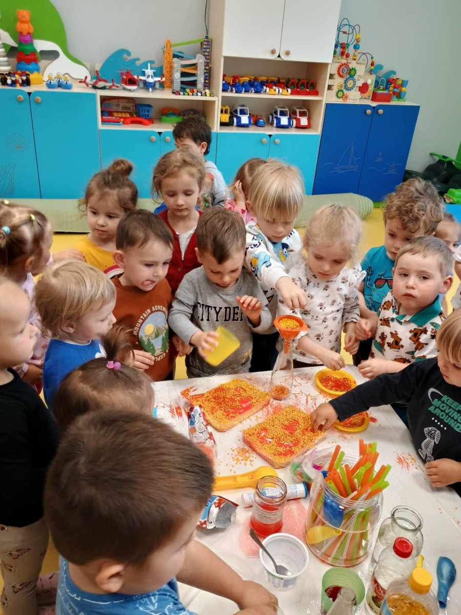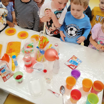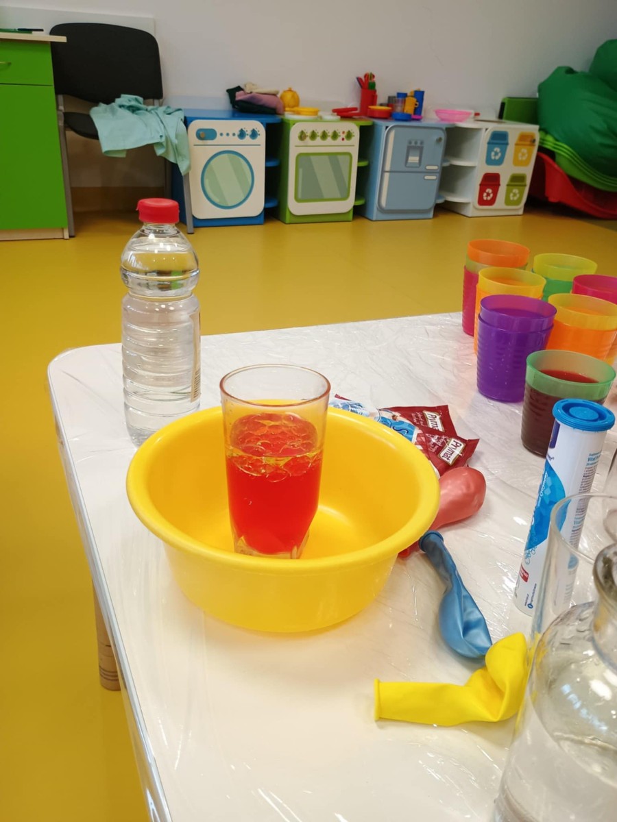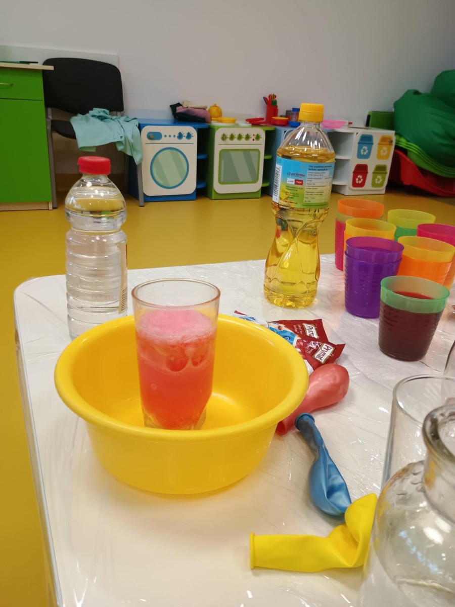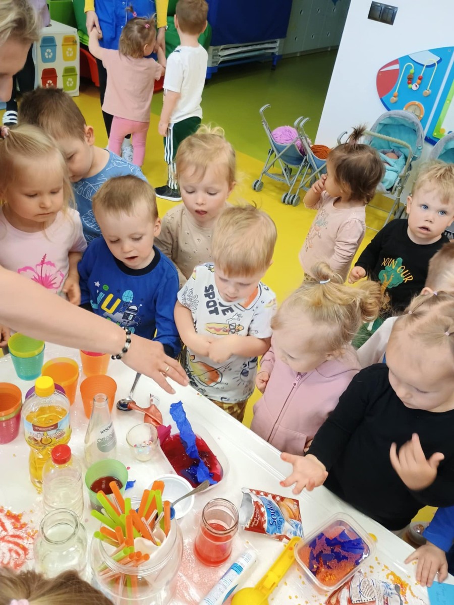 Chociaż za oknem szaro, deszczowo w dzisiejszym dniu u nas w żłobku było wesoło, kolorowo i magicznie. A to dzięki przeniesieniu dzieci w świat doświadczeń chemicznych . Te proste, eksperymenty pobudzily ciekawości dzieci , przybliżyly im podstawowe zjawiska fizyczne i chemiczne w sposób zabawowy i bezpieczny. Było mnóstwo zabawy i radości .