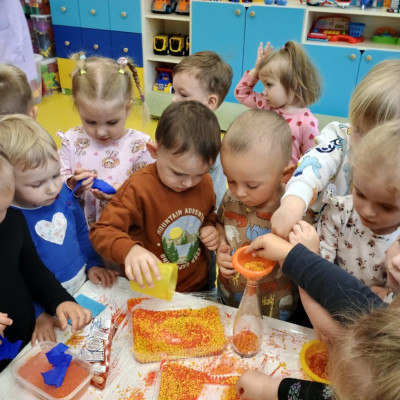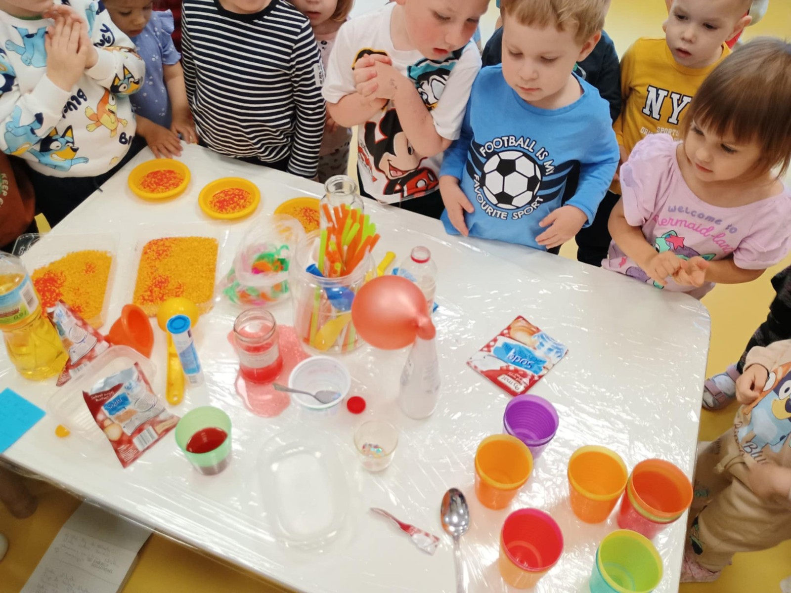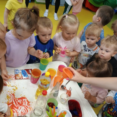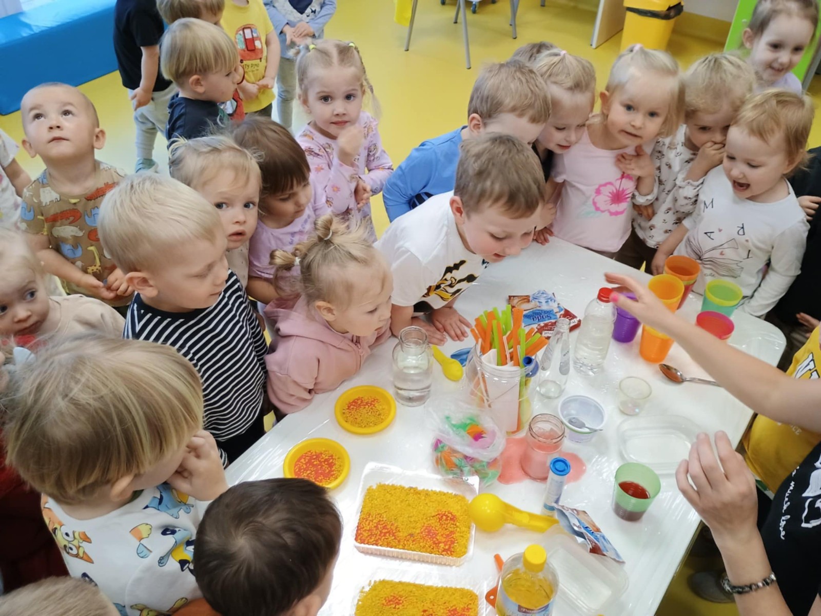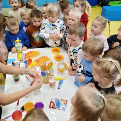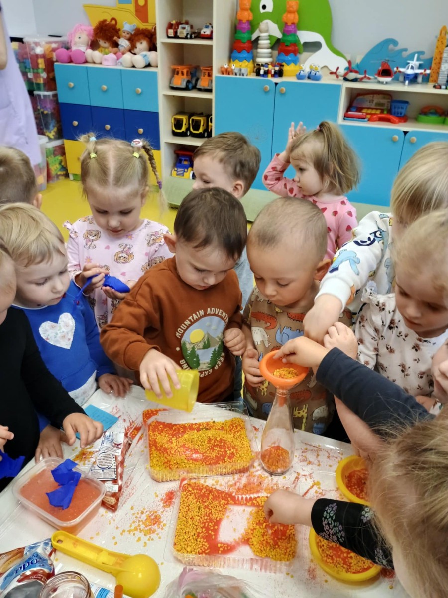Chociaż za oknem szaro, deszczowo w dzisiejszym dniu u nas w żłobku było wesoło, kolorowo i magicznie. A to dzięki przeniesieniu dzieci w świat doświadczeń chemicznych . Te proste, eksperymenty pobudzily ciekawości dzieci , przybliżyly im podstawowe zjawiska fizyczne i chemiczne w sposób zabawowy i bezpieczny. Było mnóstwo zabawy i radości .