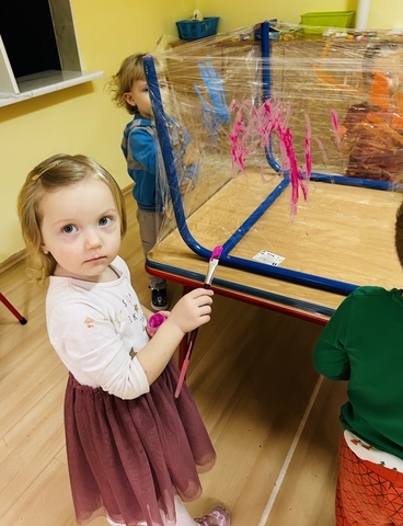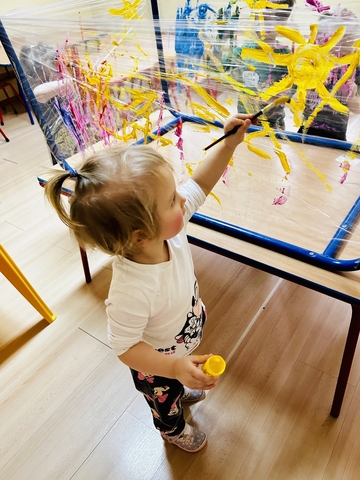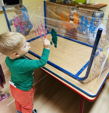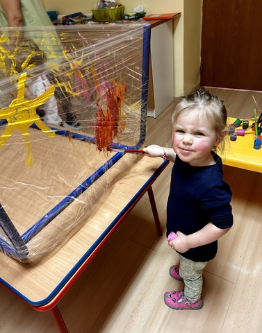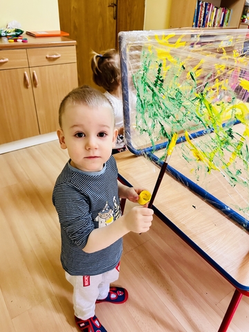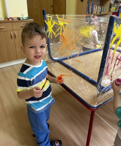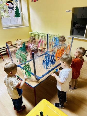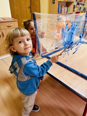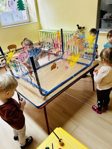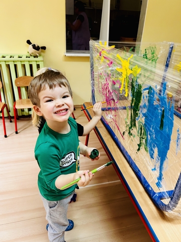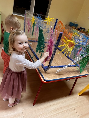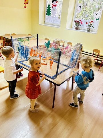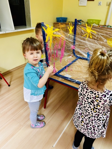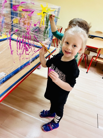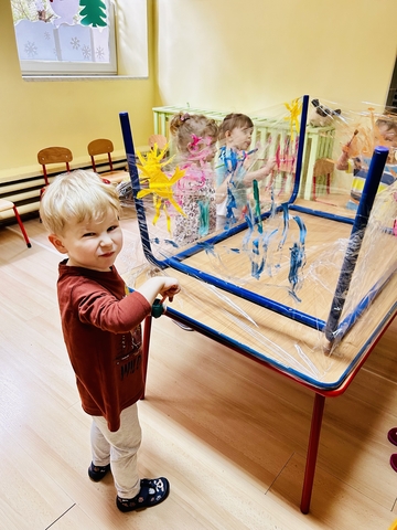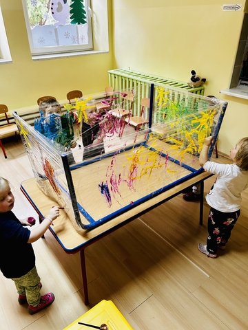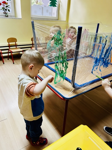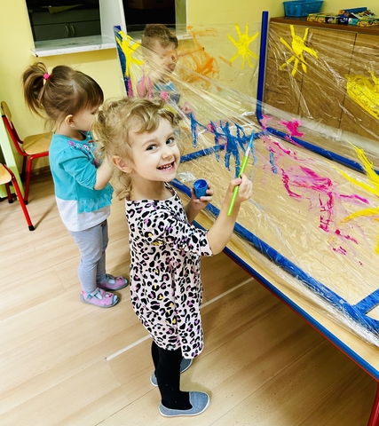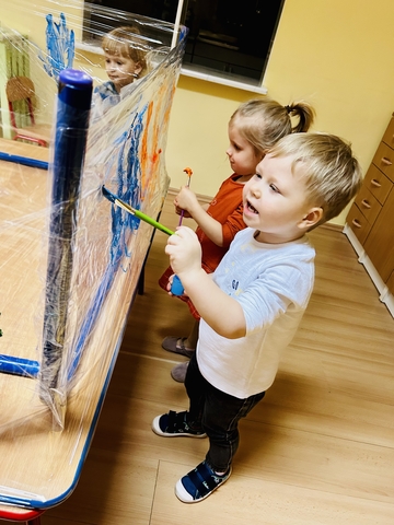 Motylki ? z grupy 4 doskonaliły swoją sprawność manualną na zajęciach plastycznych . Nie były to jednak zwykłe zajęcia . Krzesła poszły w kąt , stoły stanęły na głowie☺️i zostały owinięte przeźroczystym streczem . Dzieciaczki malowały farbami i zaczęły tworzyć arcydzieła . Jest to doskonałe ćwiczenie motoryki małej , koordynacji wzrokowo -ruchowej oraz kreatywności . Zabawa pozwala w pełni rozwijać potencjał twórczy małego artysty.