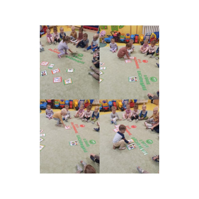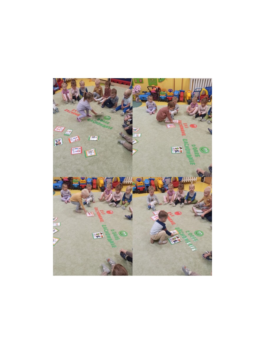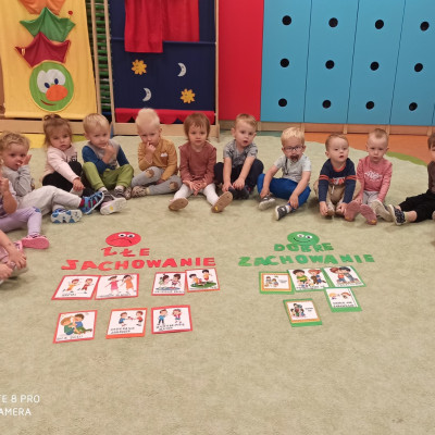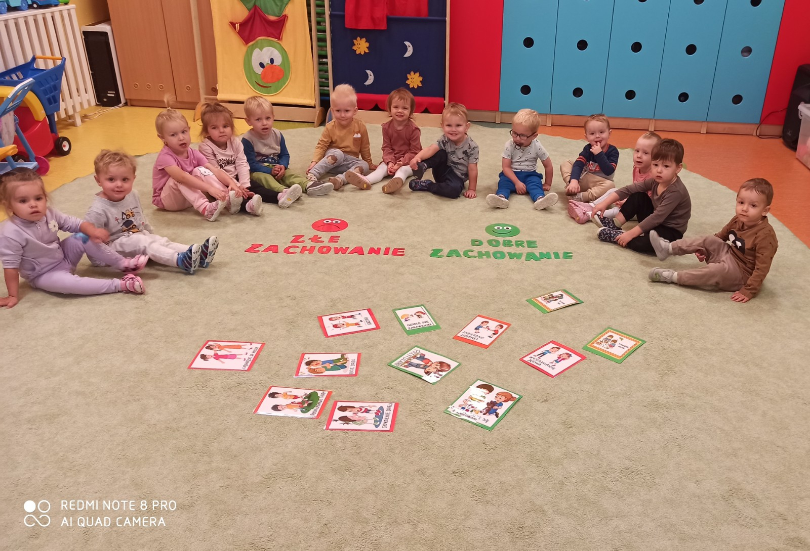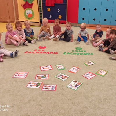 Dzieci z grupy III Rybki brały udział w zabawach dydaktycznych. W tym celu miały dopasować obrazki do właściwych zachowań – dobrych i złych.