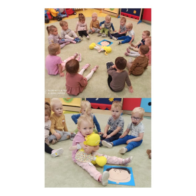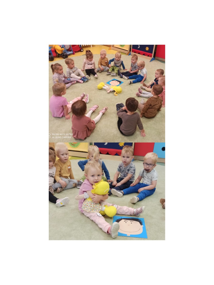 Następnie nauczyły się wyrażać własne uczucia i emocje poprzez zabawę „Emocjonalne pluszaki”. Zadaniem dzieci było pokazanie za pomocą pluszaka co czuje (np. miś smutny bo upadł na podłogę – przytulamy go).