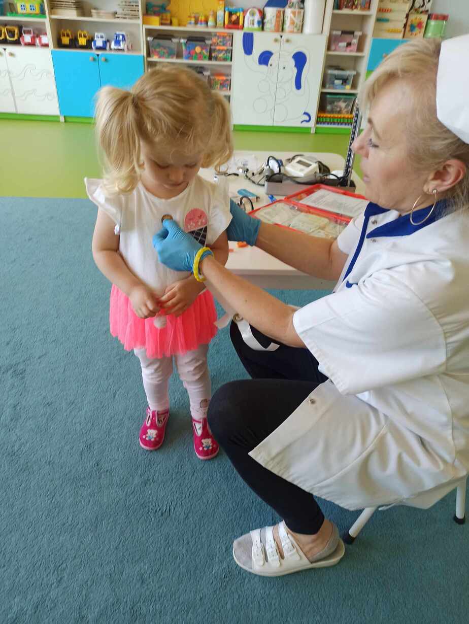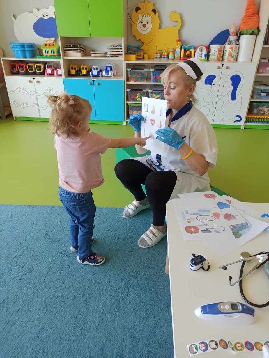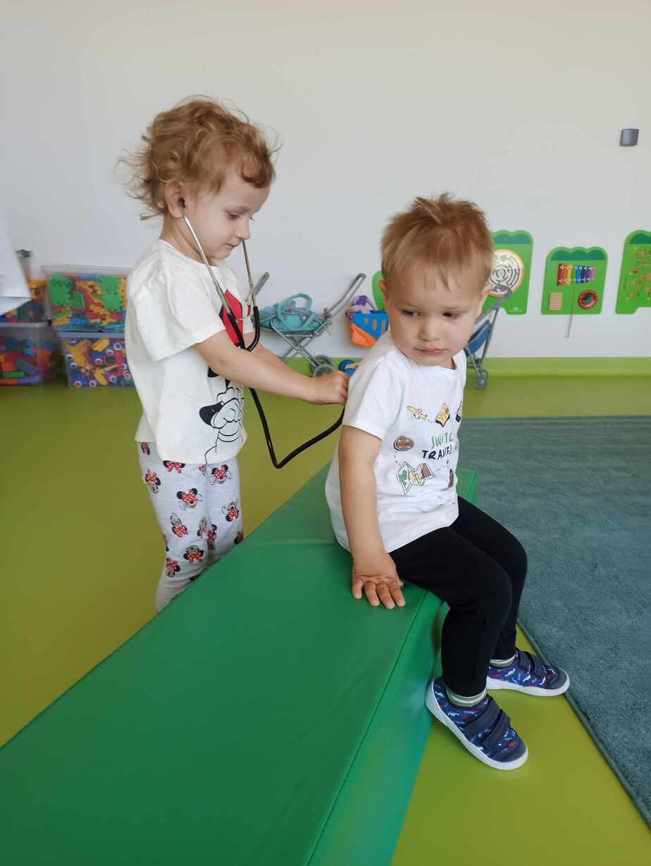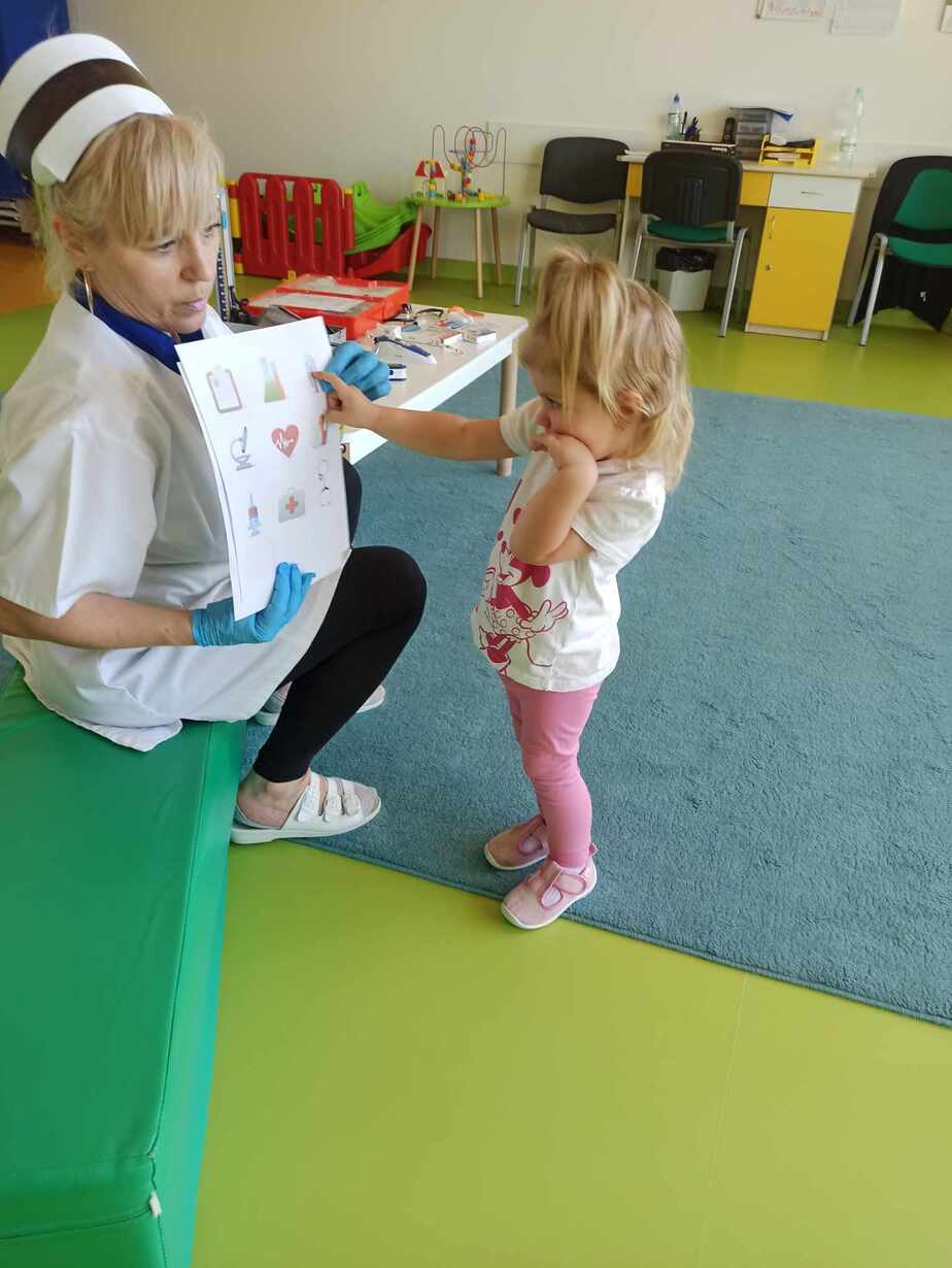 Dzieci poznały różne akcesoria tj. termometr, ciśnieniomierz, plasterki, bandaże na rany, stetoskop, strzykawki oraz zapoznały się z zawartością apteczki znajdującej się w naszym żłobku. Tego dnia podczas warsztatów dzieci z dużym zaangażowaniem wykonywały fikcyjne zabiegi swoim kolegom i koleżankom, wcielając się w pielęgniarzy ? Za udział w zajęciach dzieci otrzymywały naklejki „Dzielny Pacjent”. W ramach zajęć plastycznych dzieci pokolorowały atrybuty pielęgniarki.
