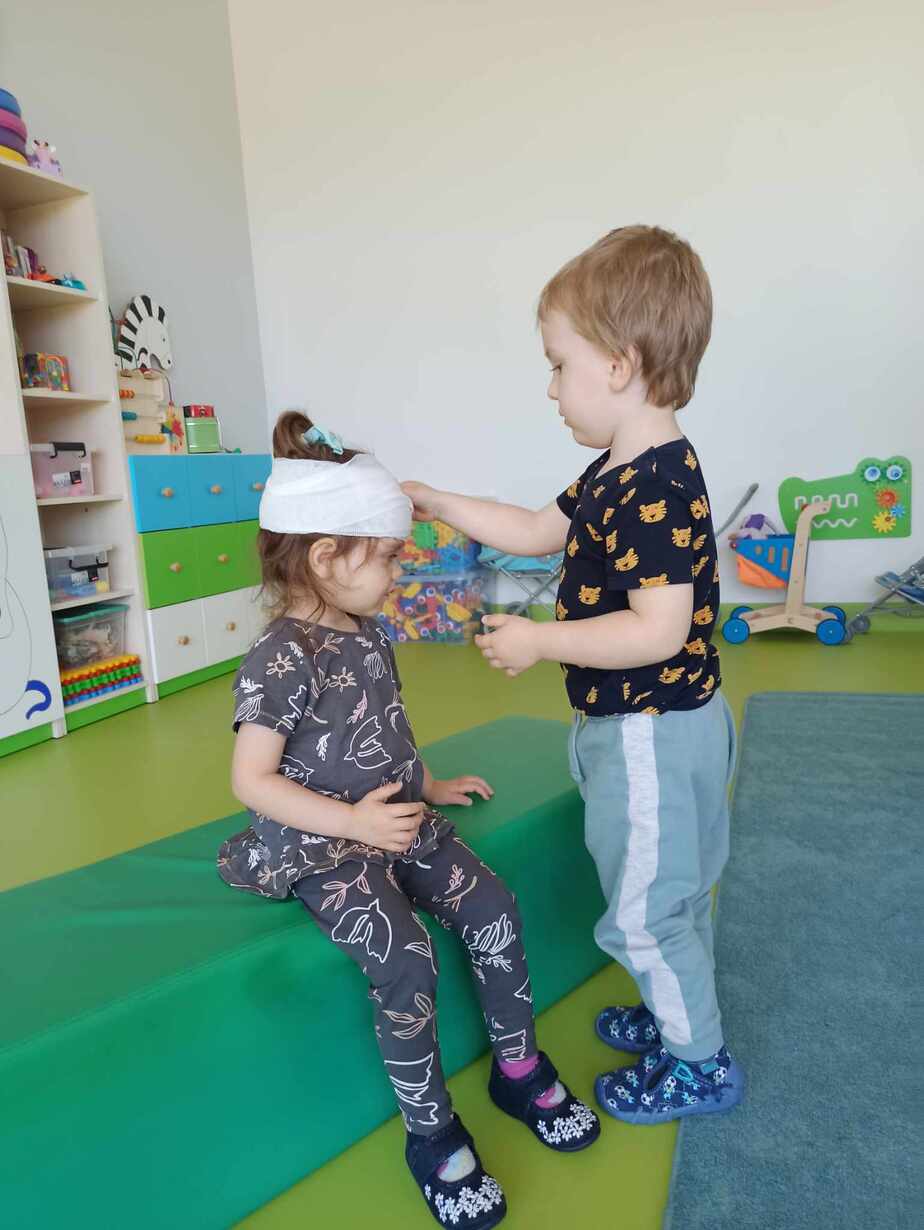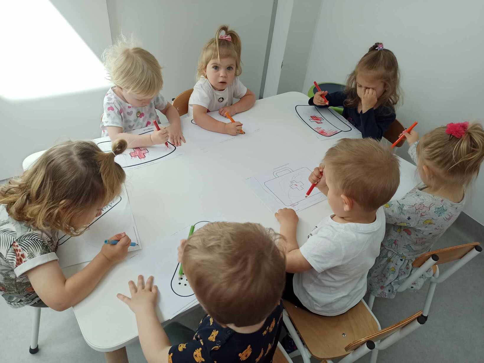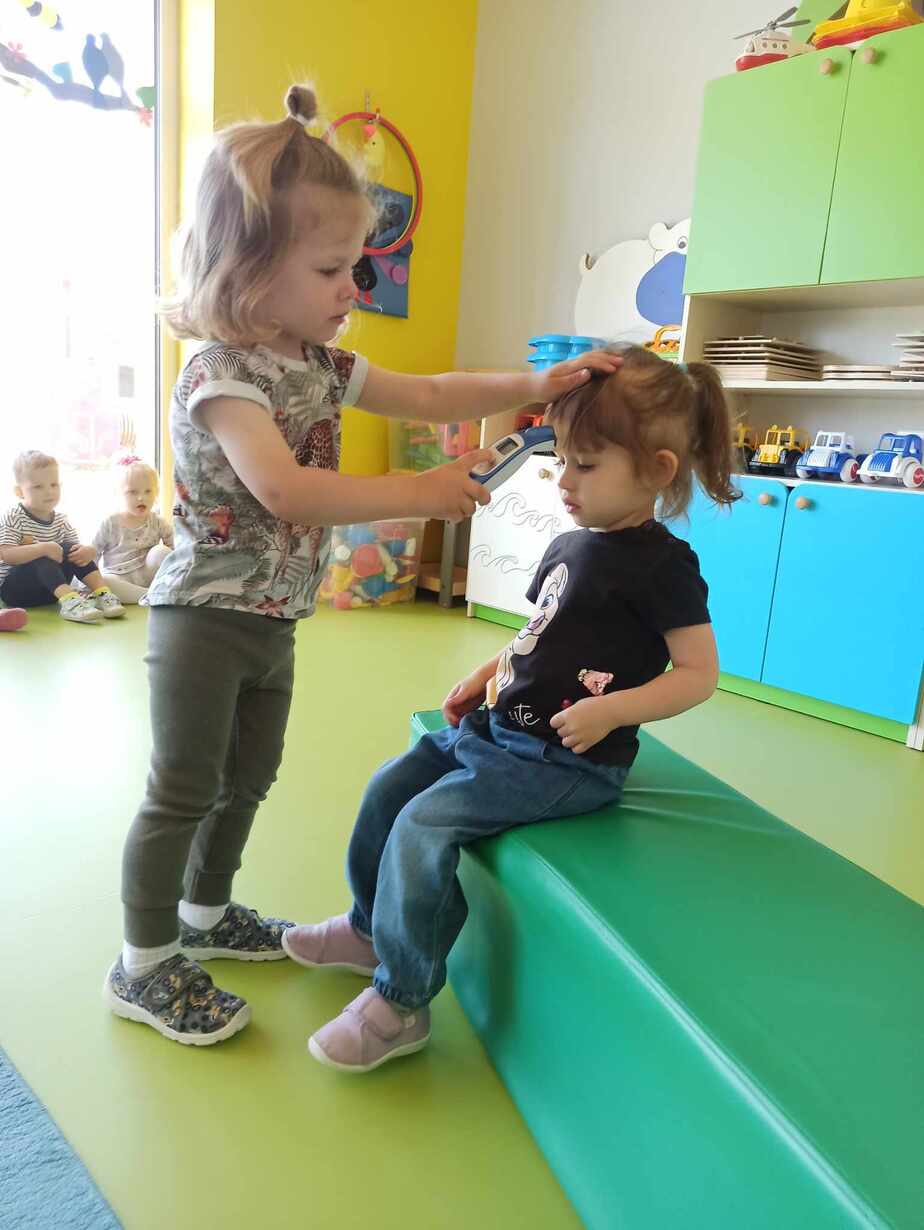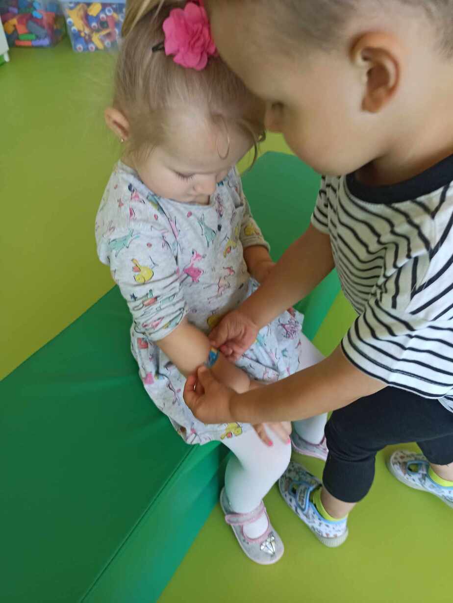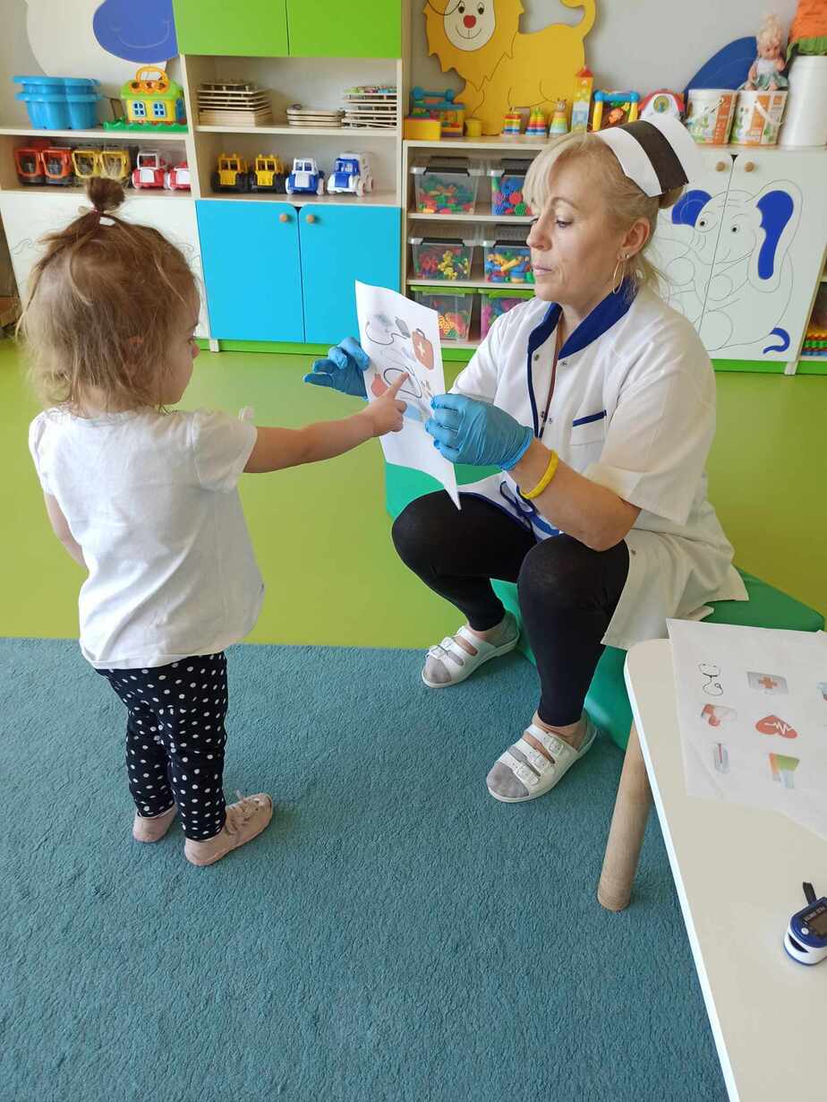 Dzieci poznały różne akcesoria tj. termometr, ciśnieniomierz, plasterki, bandaże na rany, stetoskop, strzykawki oraz zapoznały się z zawartością apteczki znajdującej się w naszym żłobku. Tego dnia podczas warsztatów dzieci z dużym zaangażowaniem wykonywały fikcyjne zabiegi swoim kolegom i koleżankom, wcielając się w pielęgniarzy ? Za udział w zajęciach dzieci otrzymywały naklejki „Dzielny Pacjent”. W ramach zajęć plastycznych dzieci pokolorowały atrybuty pielęgniarki.